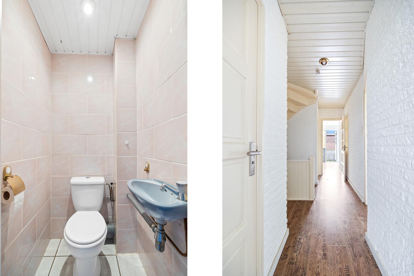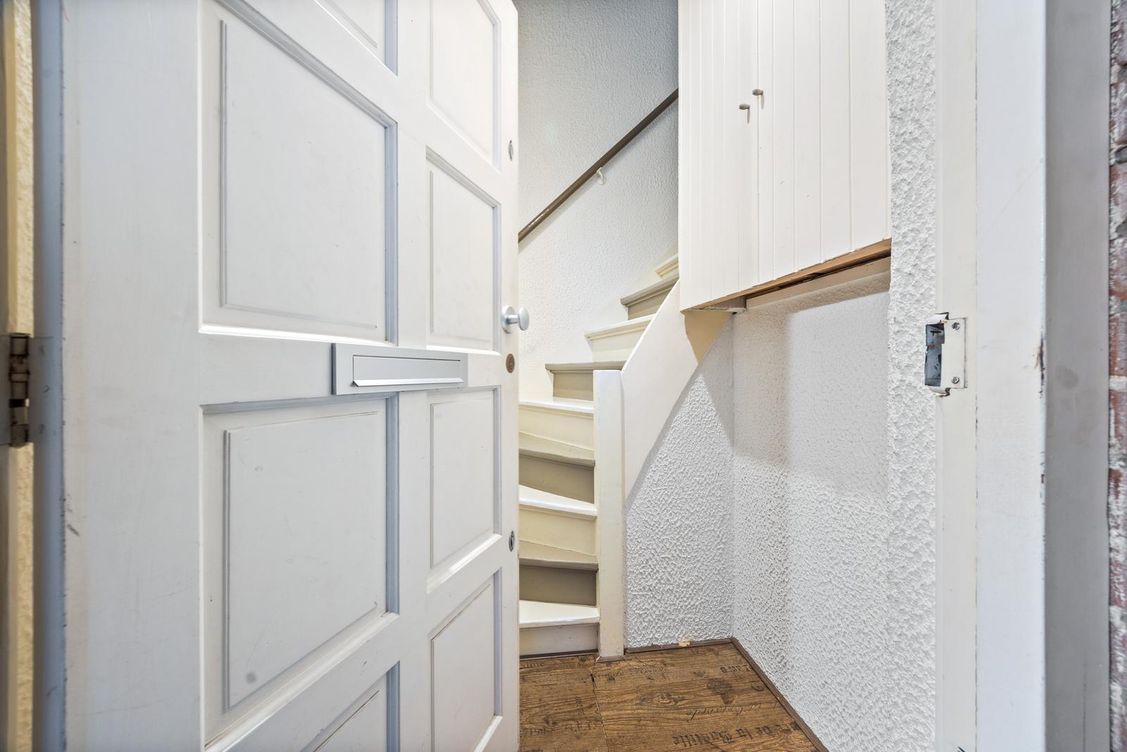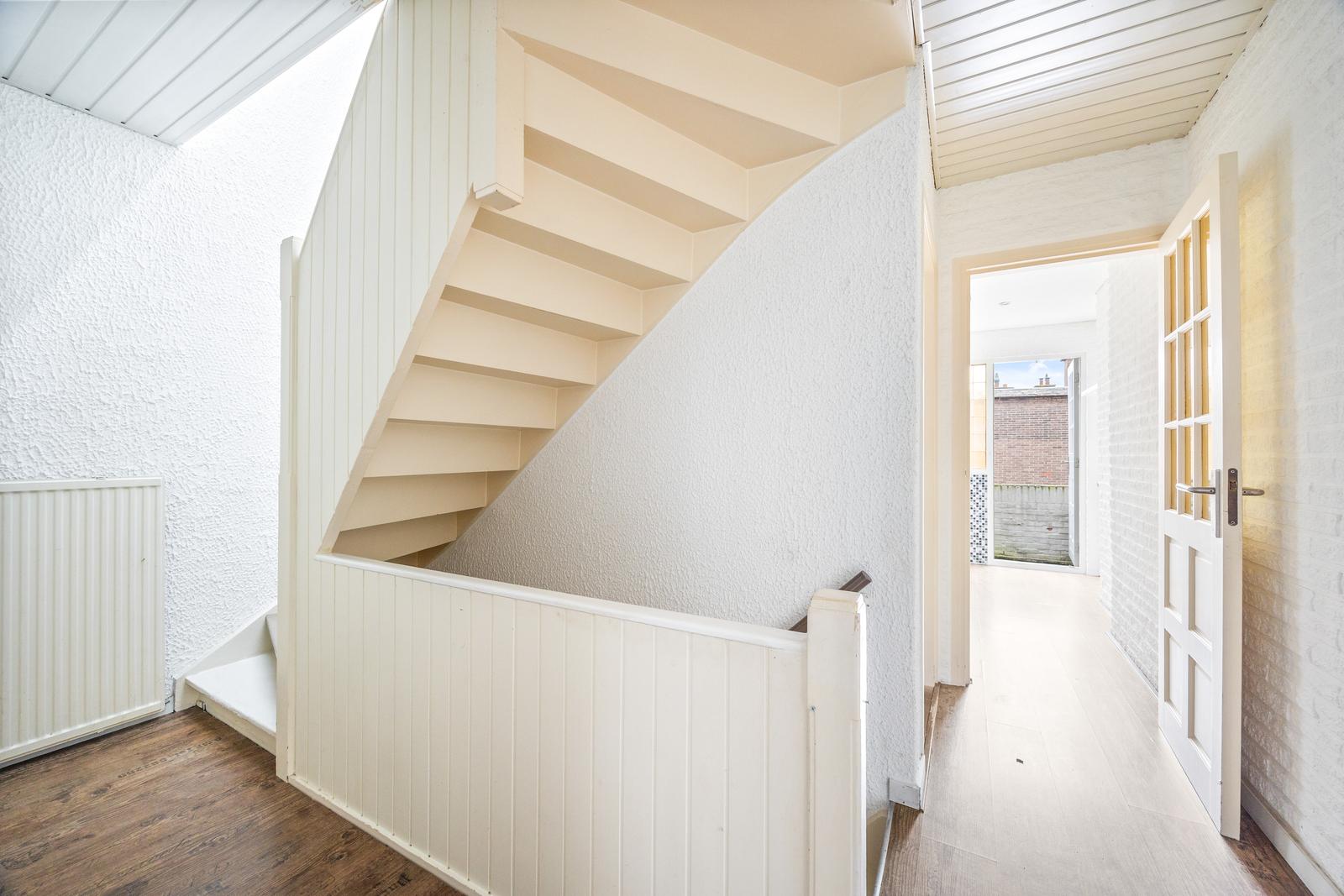 Open portiek; entree woning op de eerste verdieping; hal met meterkast en binnentrap naar de tweede verdieping.