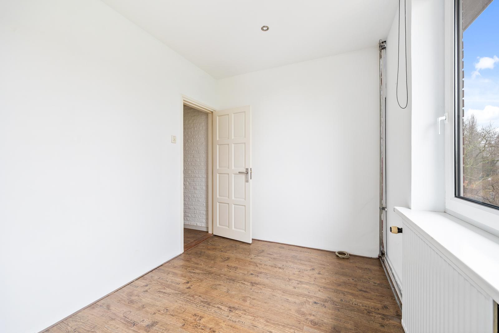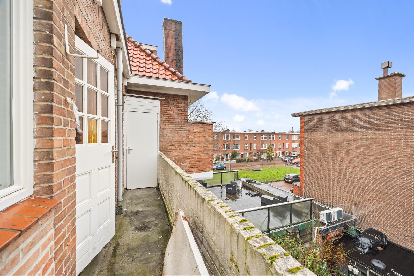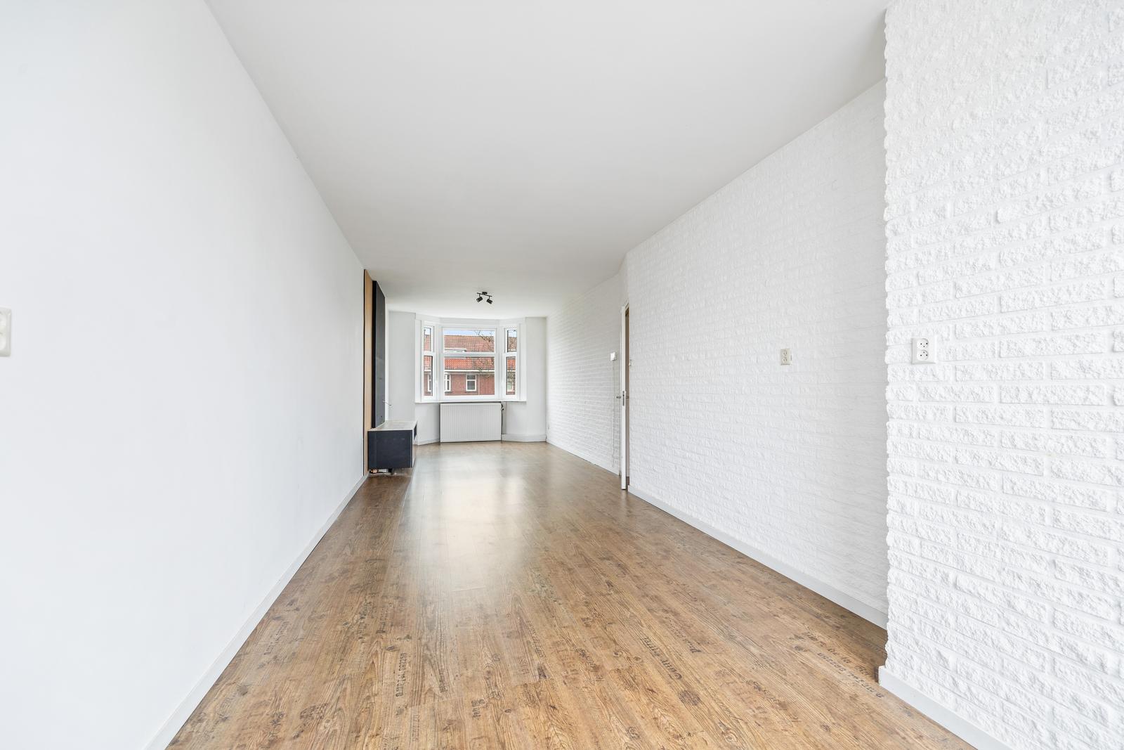Overloop met vaste kast en separaat toilet met fonteintje; goed bemeten slaapkamer aan de voorzijde en ruime slaapkamer aan de achterzijde; royale en lichte (doorgebroken) woon-/eetkamer met speelse erker aan de voorzijde en fraai uitzicht op het groene plantsoen; nette (dichte) keuken aan de achterzijde met diverse inbouw apparatuur en toegang tot het (woningbrede) achterbalkon (NO) met balkonkasten.