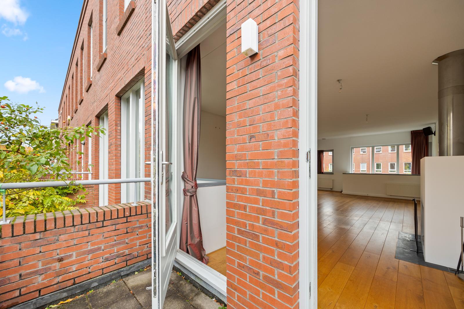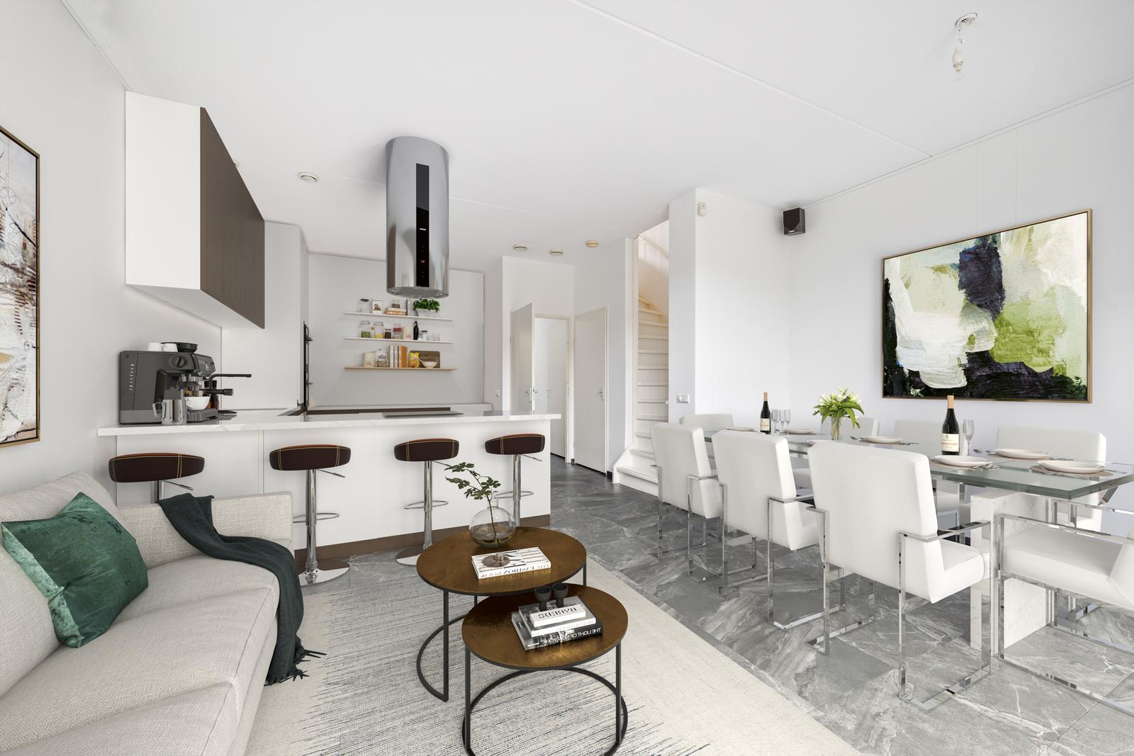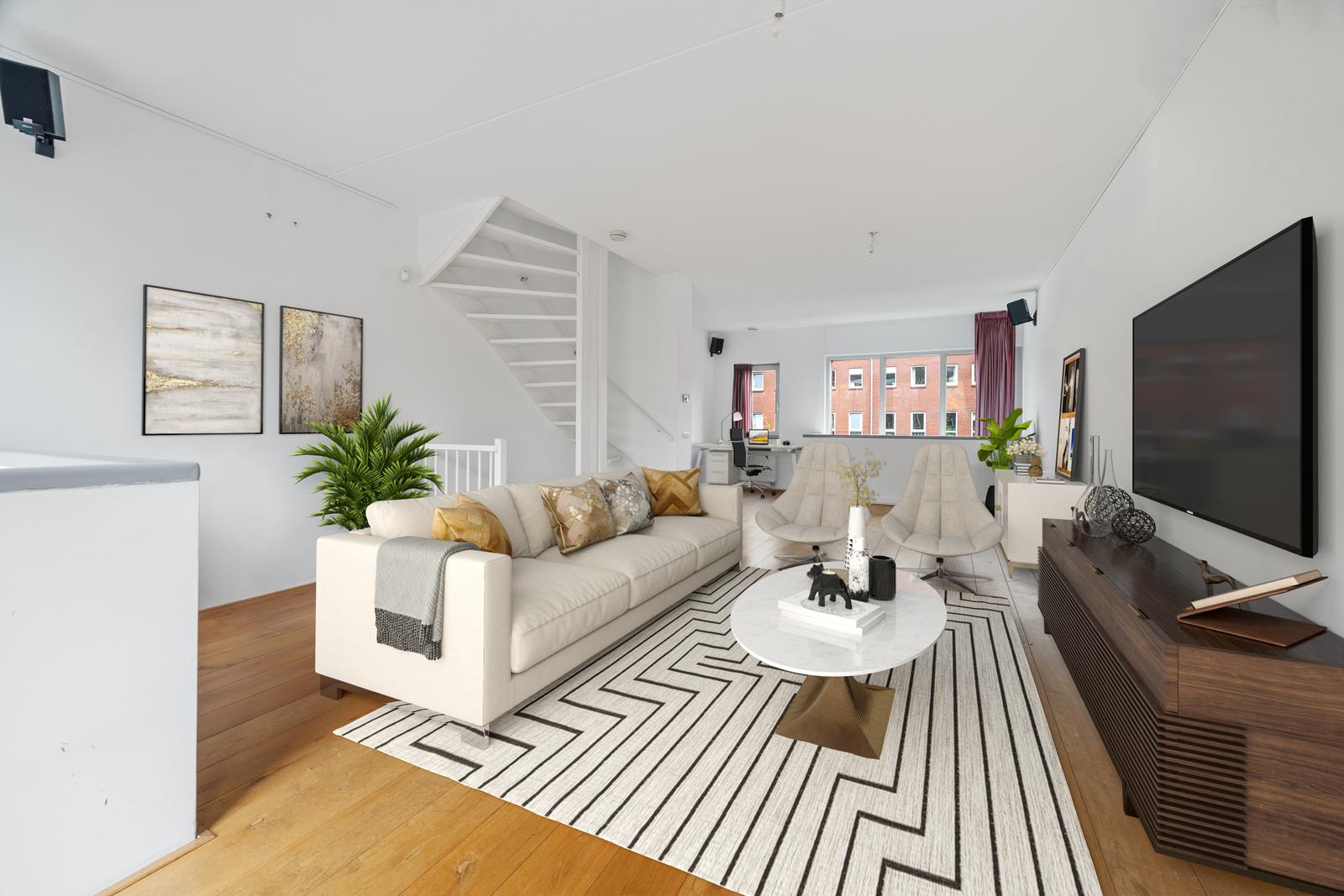 Royale en lichte living over de volle verdieping met extra keukenblokje, trapopgang en toegang tot het zonnige voorbalkon op het zuidwesten.