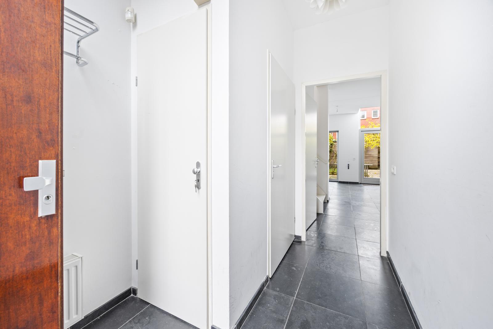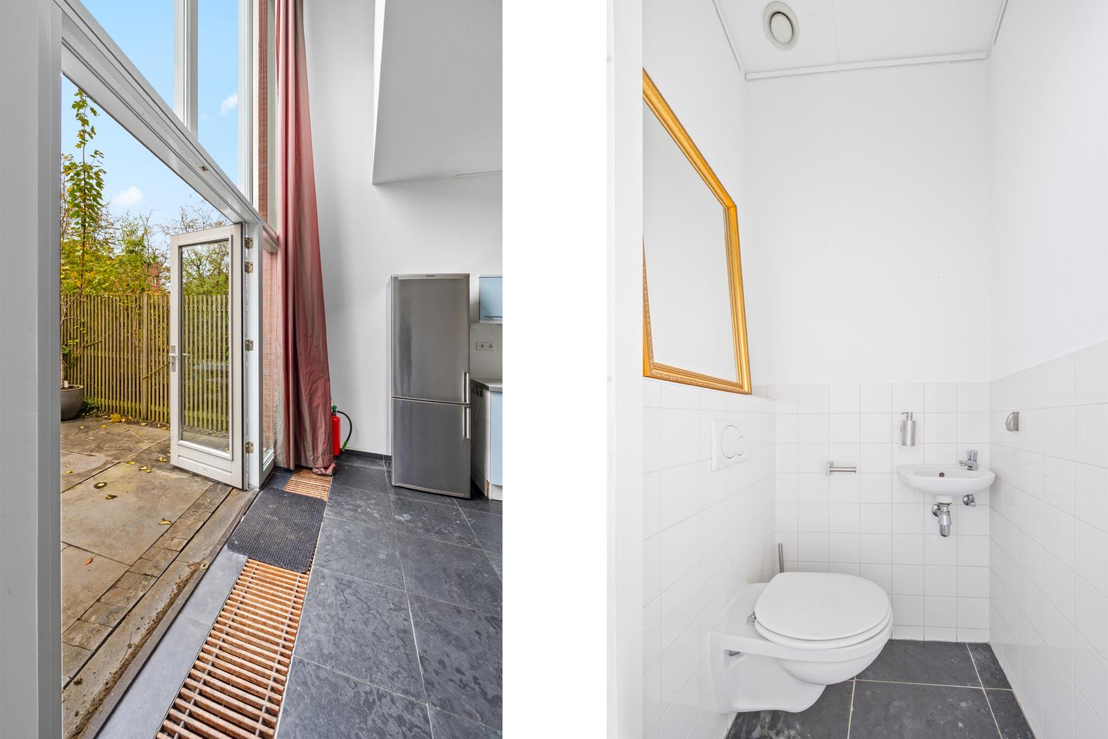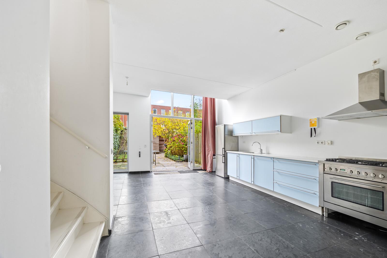 Via de verzorgde voortuin naar de woningentree. Hal met garderobe, meterkast en separaat toilet met fonteintje. Ruime woonkeuken met eet-/zitgedeelte, vide, trapopgang, trapkast en keukenopstelling met diverse inbouwapparatuur. Het bijna 6 meter hoge gevelkozijn met openslaande deuren geeft toegang tot de diepe achtertuin (NO) met berging en achterom.