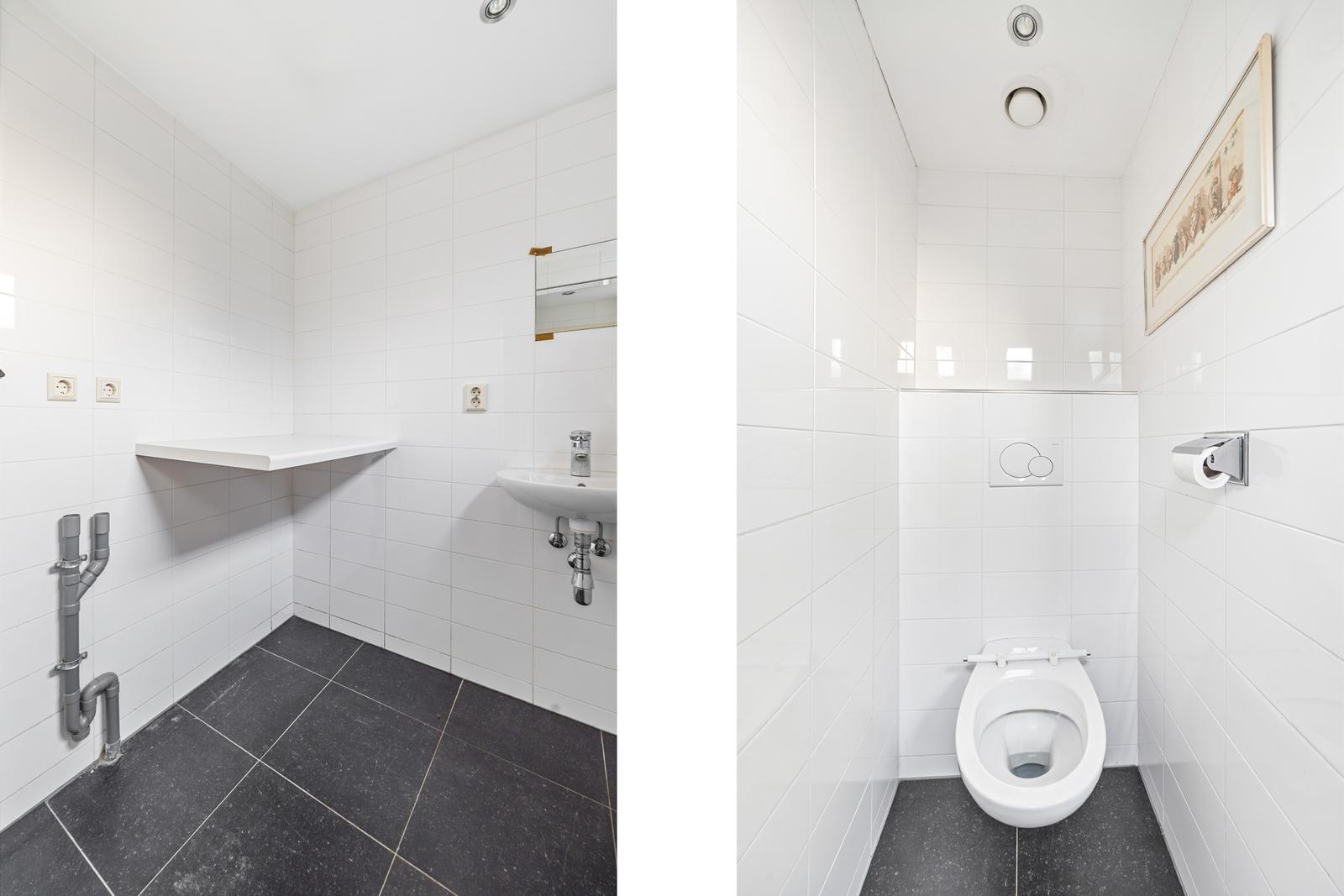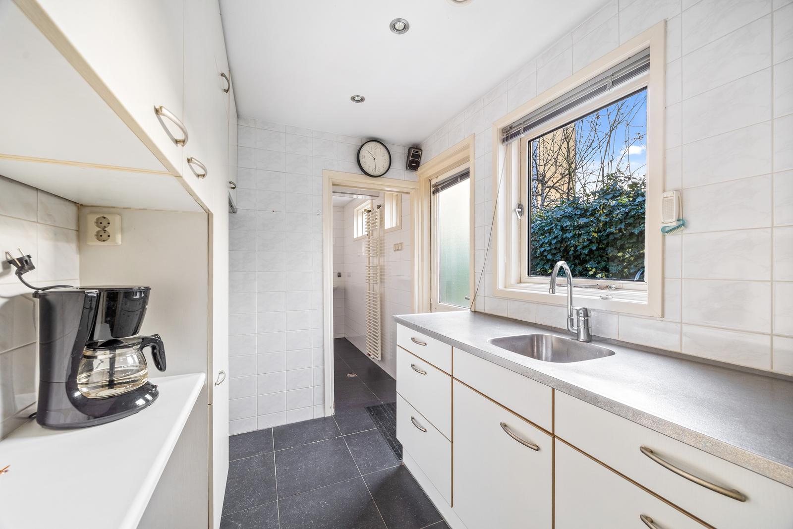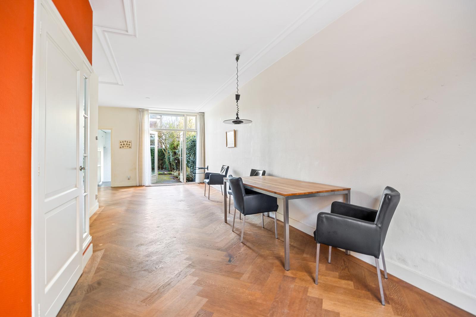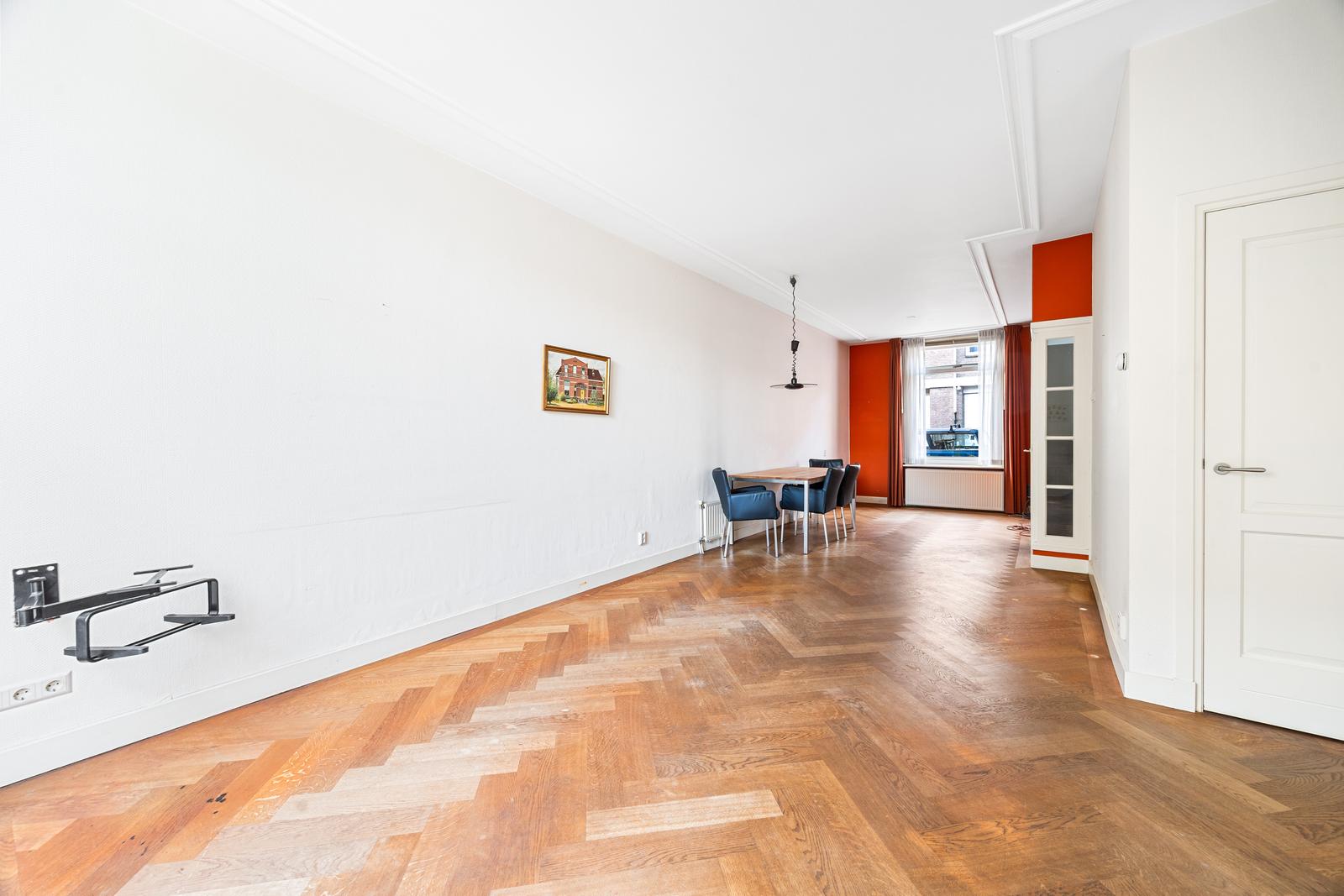 Entree woning met hal voorzien van garderobe, meterkast en trapopgang naar de eerste verdieping. Royale en lichte woon-/eetkamer met fraaie visgraat parketvloer, praktische trapkast en openslaande deuren naar de achtertuin. Aan de achterzijde bevinden zich de nette keuken, een separaat toilet en een praktische wasruimte.