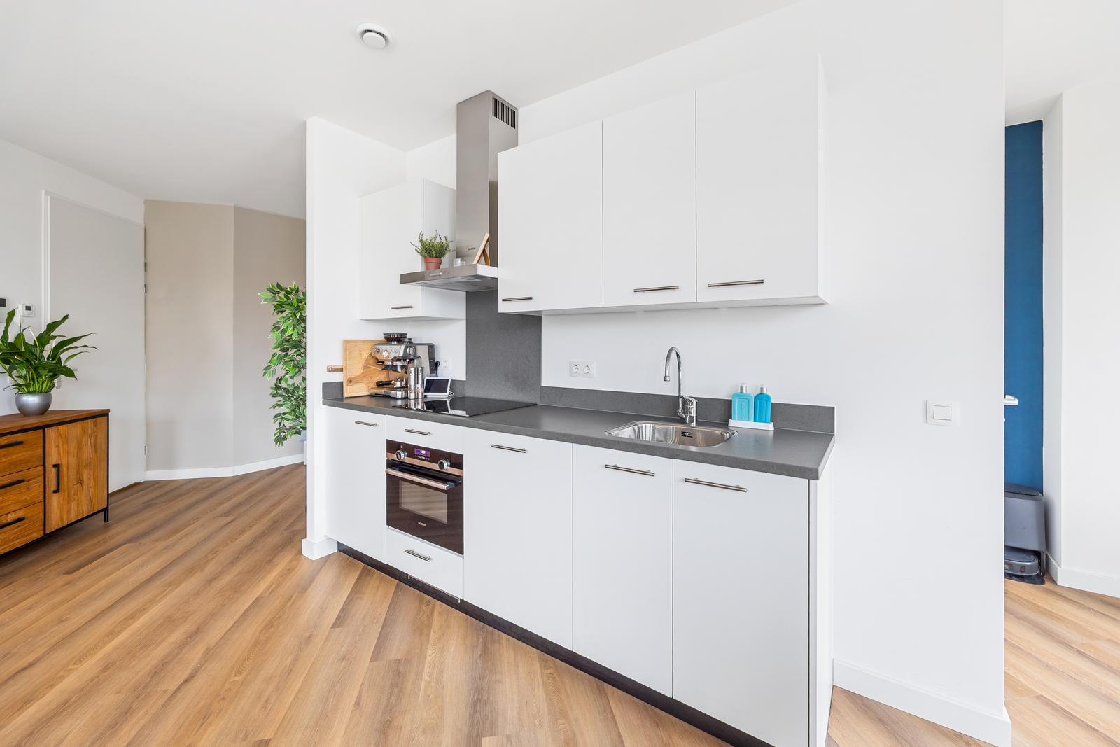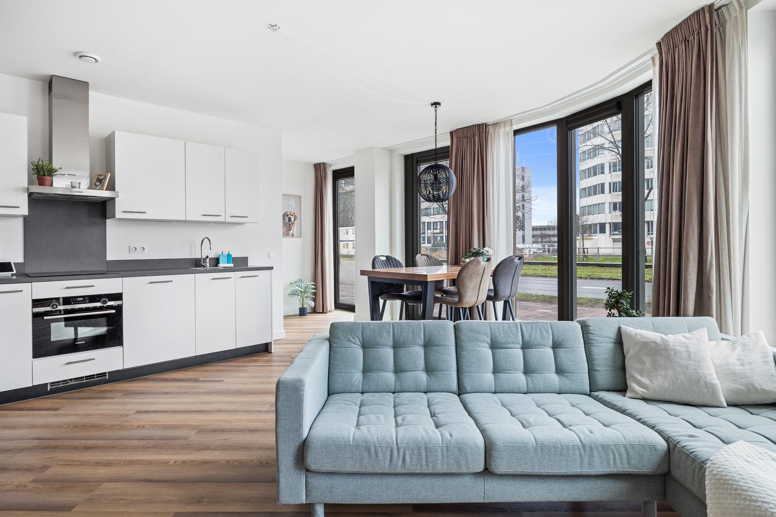 Dit stijlvolle appartement beschikt over een separate werkruimte, een comfortabel slaapgedeelte, een royale living met open keuken, een moderne badkamer, een eigen (fietsen) berging en een privéparkeerplaats in de ondergrondse parkeergarage.