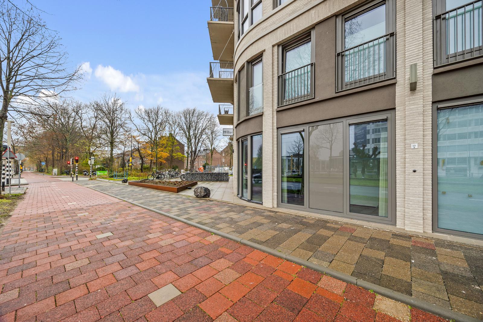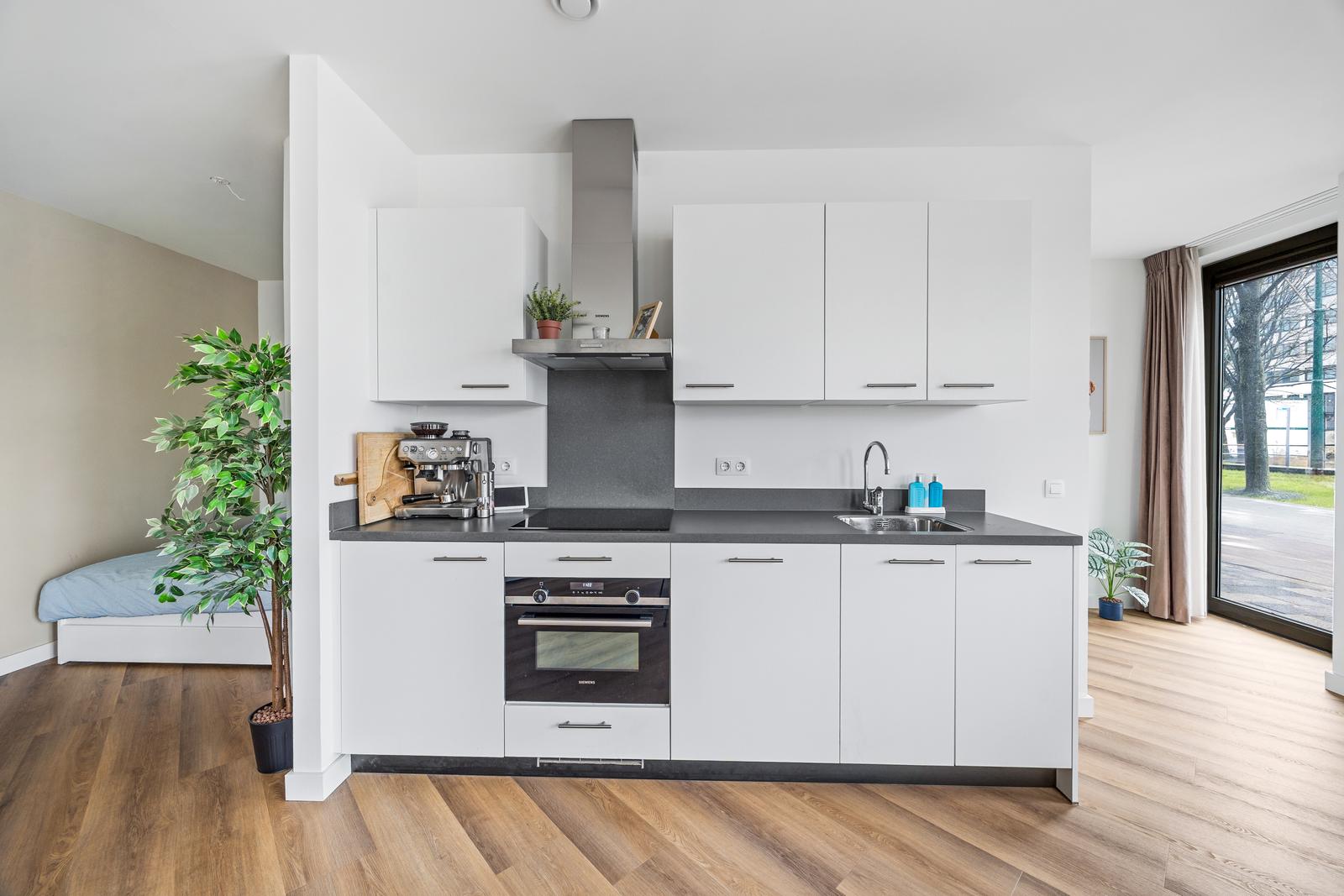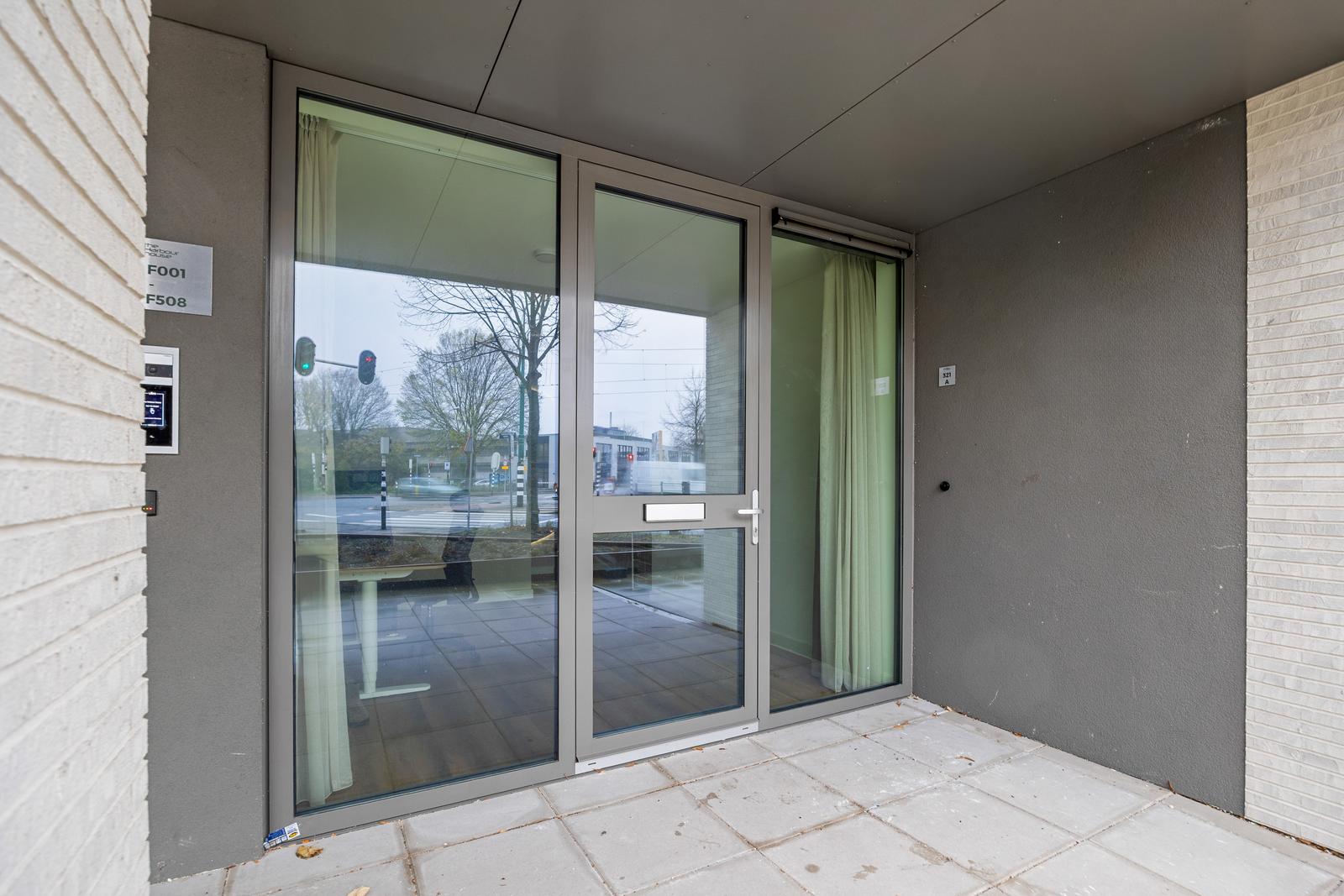 Entree op de begane grond. Ruime en lichte werkruimte met meterkast en vaste kast. Hal met modern separaat toilet met fonteintje. Royale woonstudio met een comfortabel slaapgedeelte aan de achterzijde en een centraal gesitueerde open keuken voorzien van diverse inbouwapparatuur. De moderne badkamer is uitgerust met een douche, wastafelmeubel, handdoekradiator en wasmachine opstelplaats. De vele grote raampartijen door het appartement zorgen voor een prachtige lichtinval en een ruimtelijk gevoel.