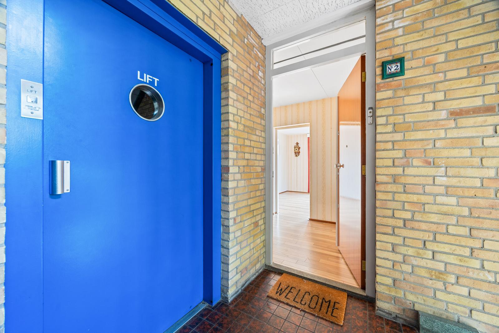 Centraal gesloten entree met brievenbussen, bellentableau en intercom. Trap of lift naar de tweede verdieping.