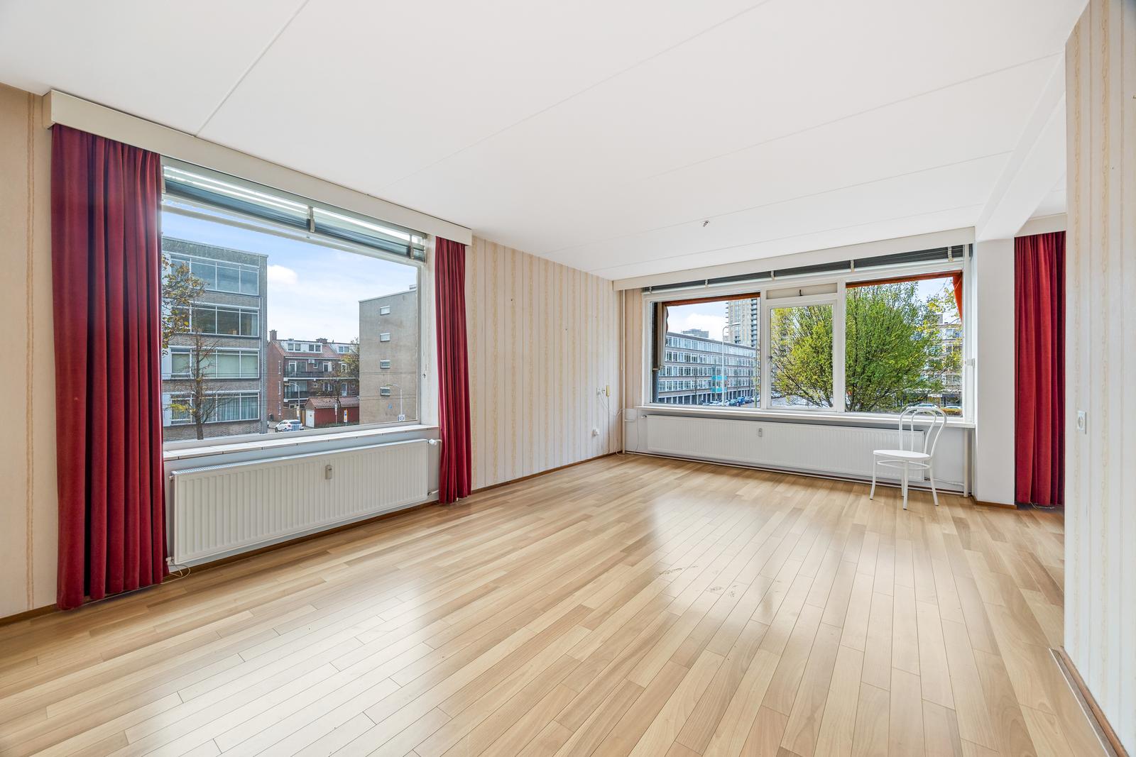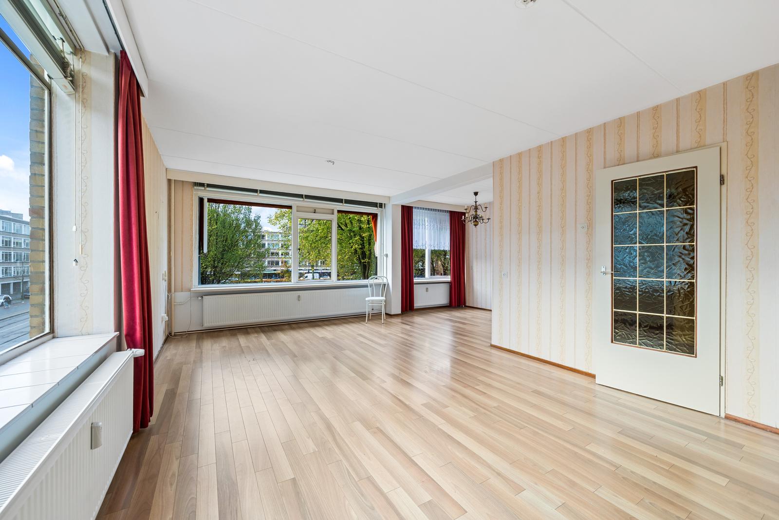 Entree appartement; L-vormige hal met meterkast en moderne separate toiletruimte; nette (tussengelegen) badkamer met inloopdouche, wastafelmeubel en handdoekradiator; royale en lichte (hoekgelegen) woon-/eetkamer met bijgetrokken voorzijkamer en fraai uitzicht over het groen; achtergelegen ruime hoofdslaapkamer met ingebouwde kastruimte; tweede achtergelegen slaapkamer van goed formaat; eenvoudige keuken met wasmachine aansluiting en deur naar het achterbalkon (NO) met balkonkast waarin opstelplaats geiser;