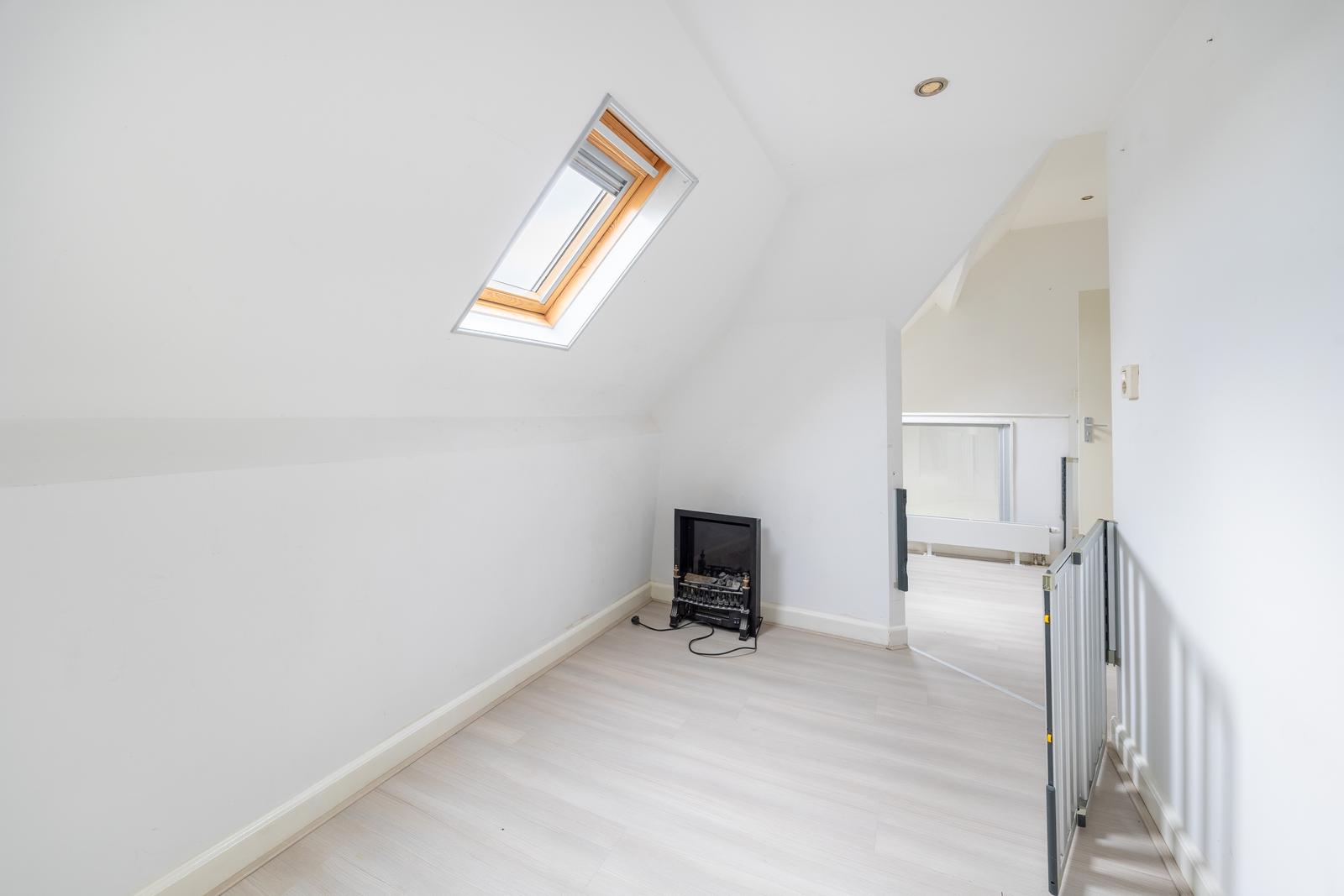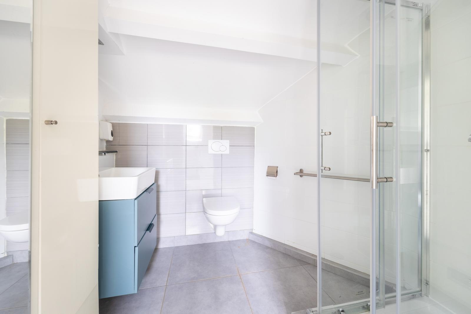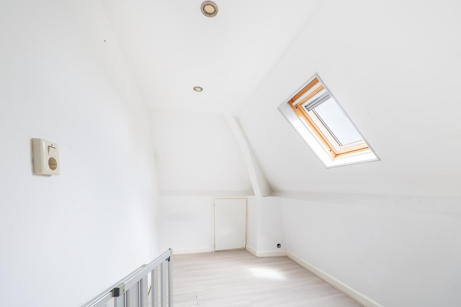 Ruime zolderverdieping met een ruime slaapkamer en een werk-/slaapkamer; nette badkamer met douche, wastafelmeubel en vrijhangend toilet. De gehele verdieping heeft veel bergruimte achter de knieschotten.