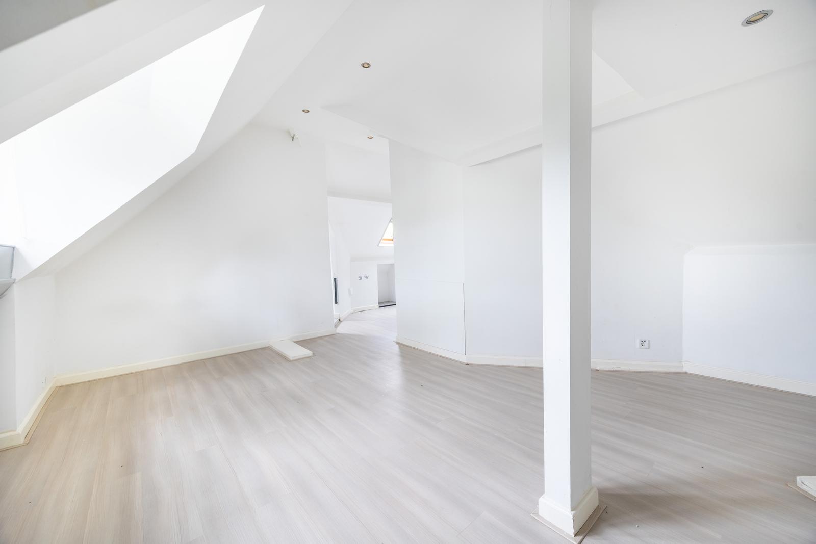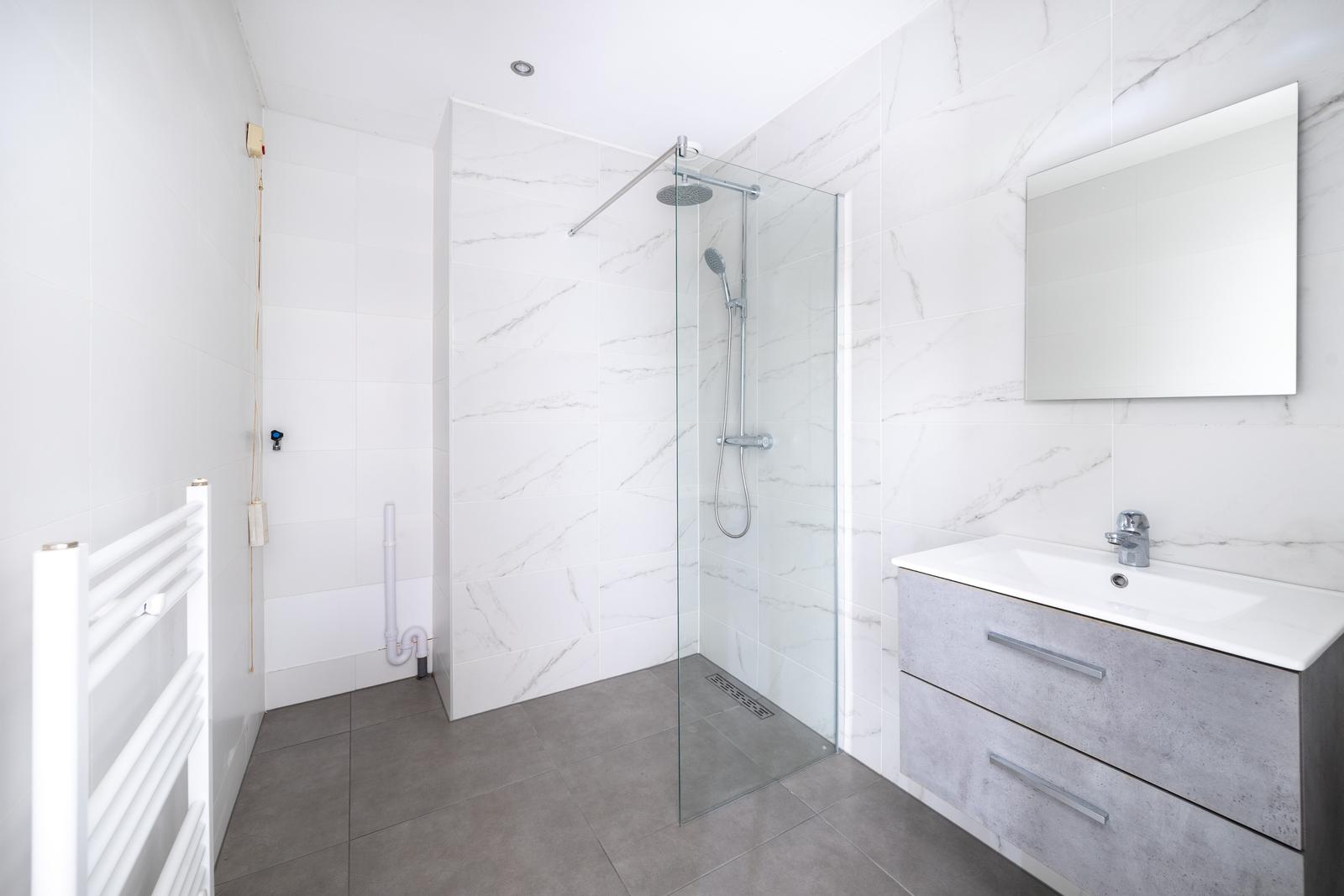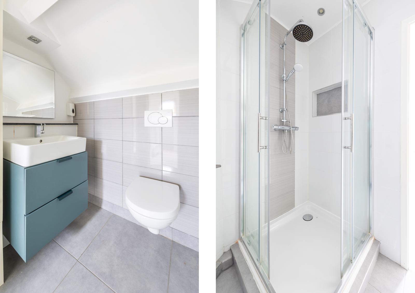 Ruime zolderverdieping met een ruime slaapkamer en een werk-/slaapkamer; nette badkamer met douche, wastafelmeubel en vrijhangend toilet. De gehele verdieping heeft veel bergruimte achter de knieschotten.
