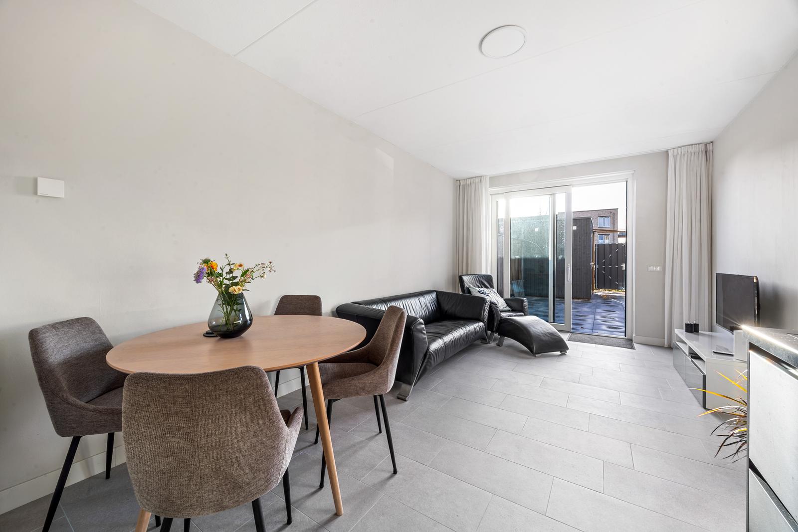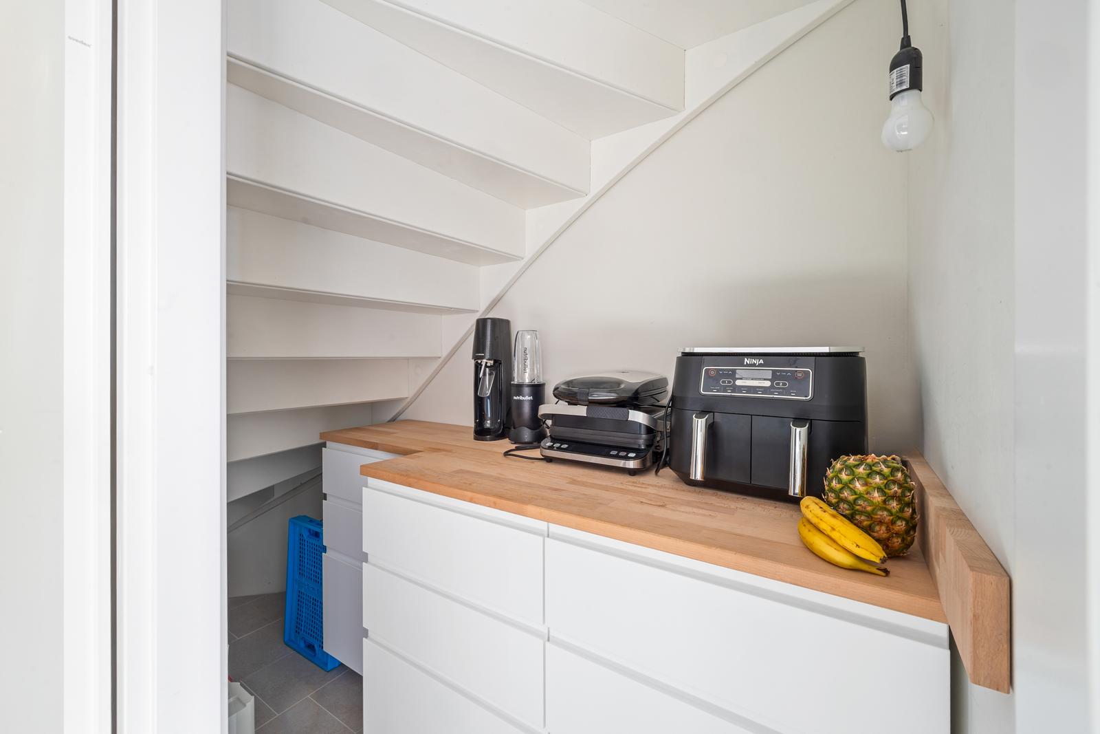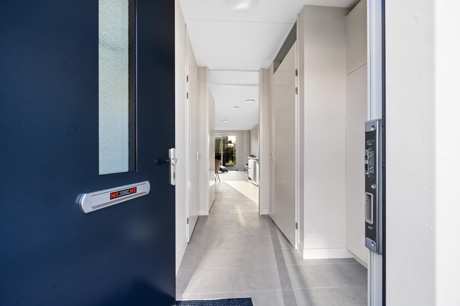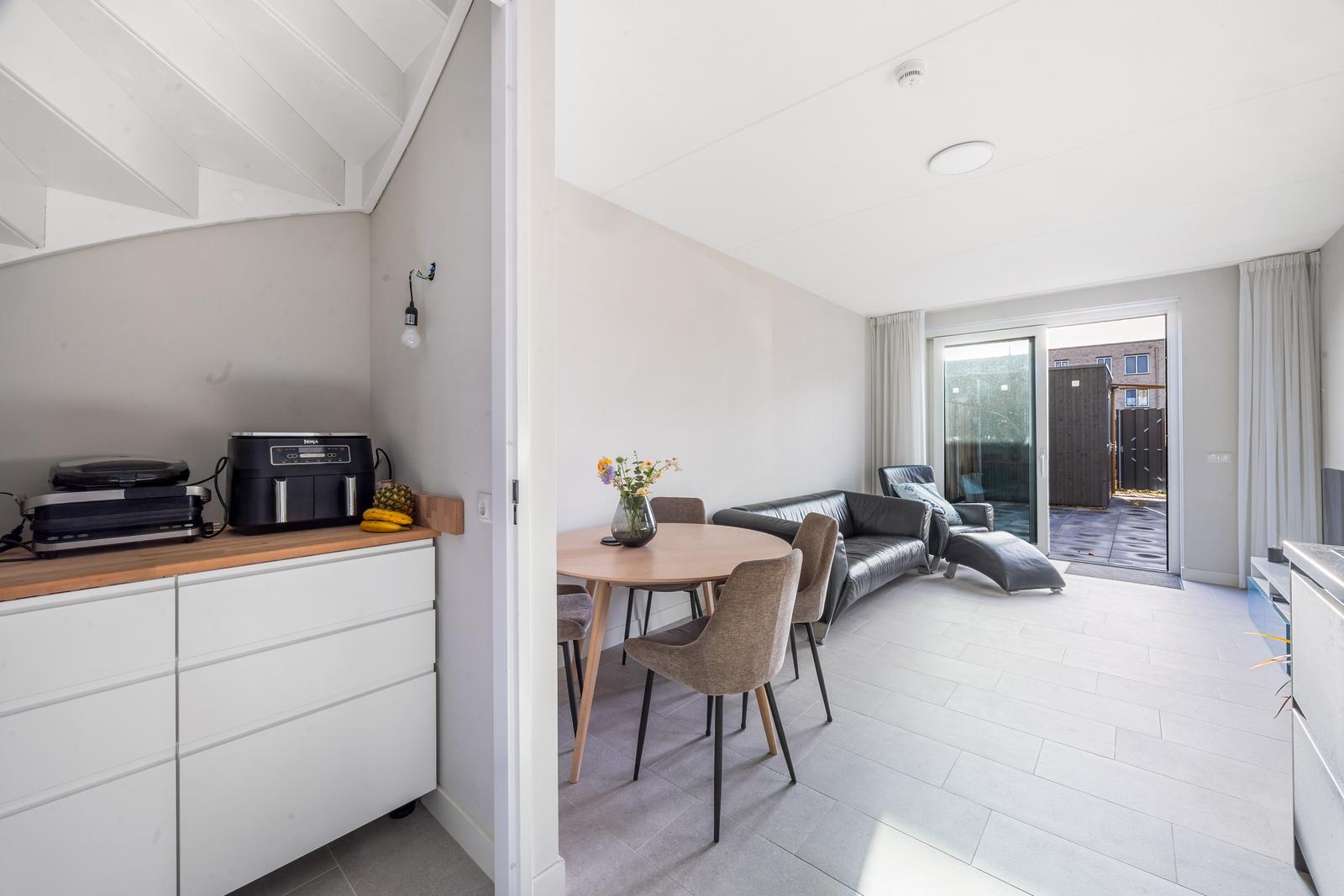 Entree van de woning. Hal met garderobe, meterkast, moderne toiletruimte en drie vaste kasten waarvan één is ingericht voor de warmtepomp. Lichte (tuingerichte) woon-/eetkamer met trapkast en moderne matzwarte open keuken voorzien van een granieten werkblad en diverse luxe Miele inbouwapparatuur. Via de schuifpui toegang tot de zonnige en onderhoudsvriendelijke achtertuin (Z) met berging en achterom.