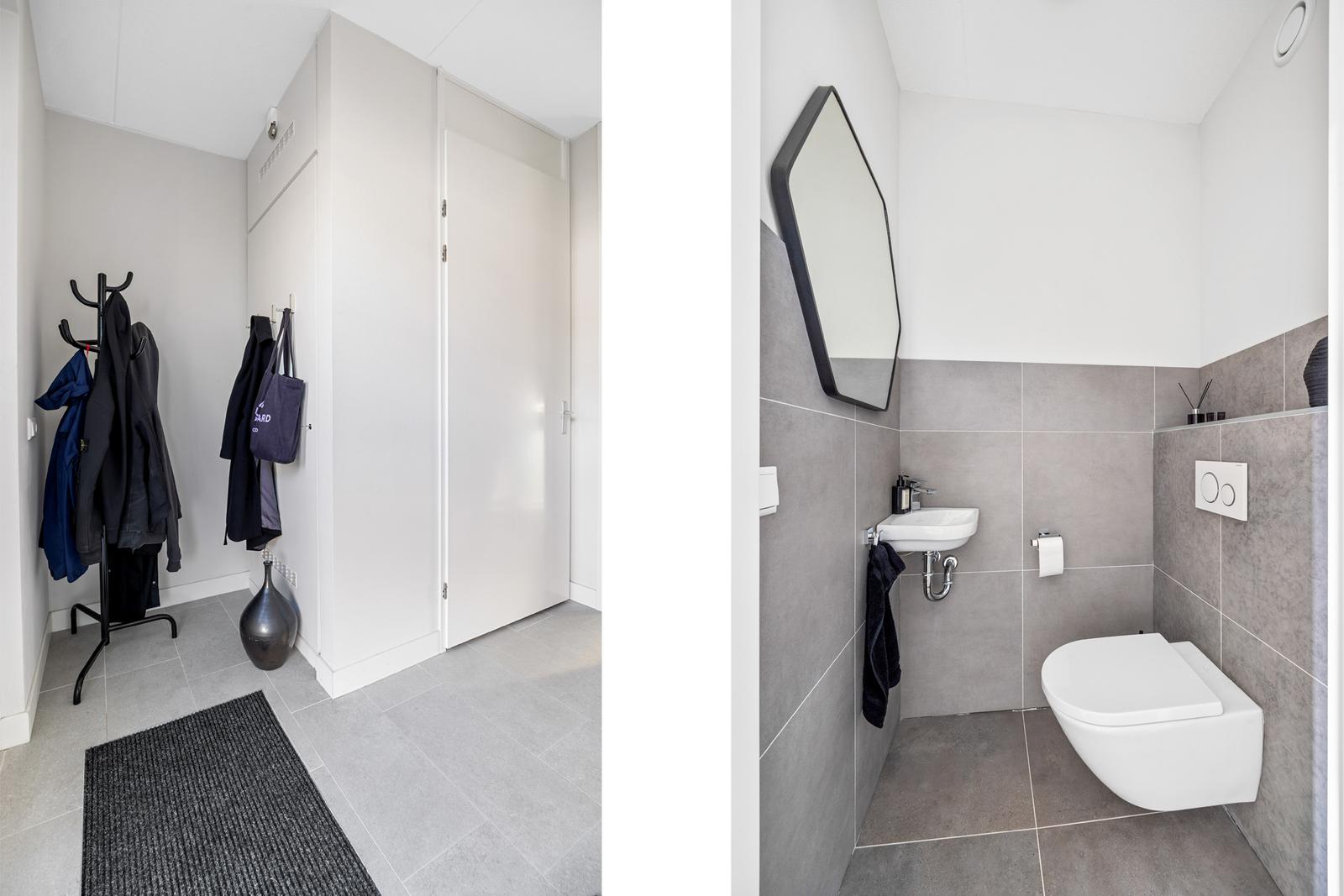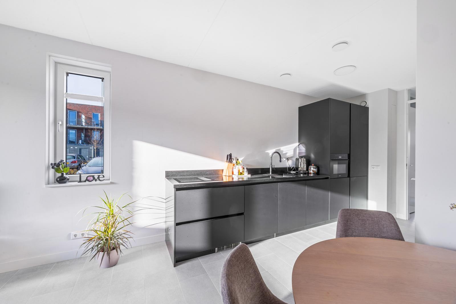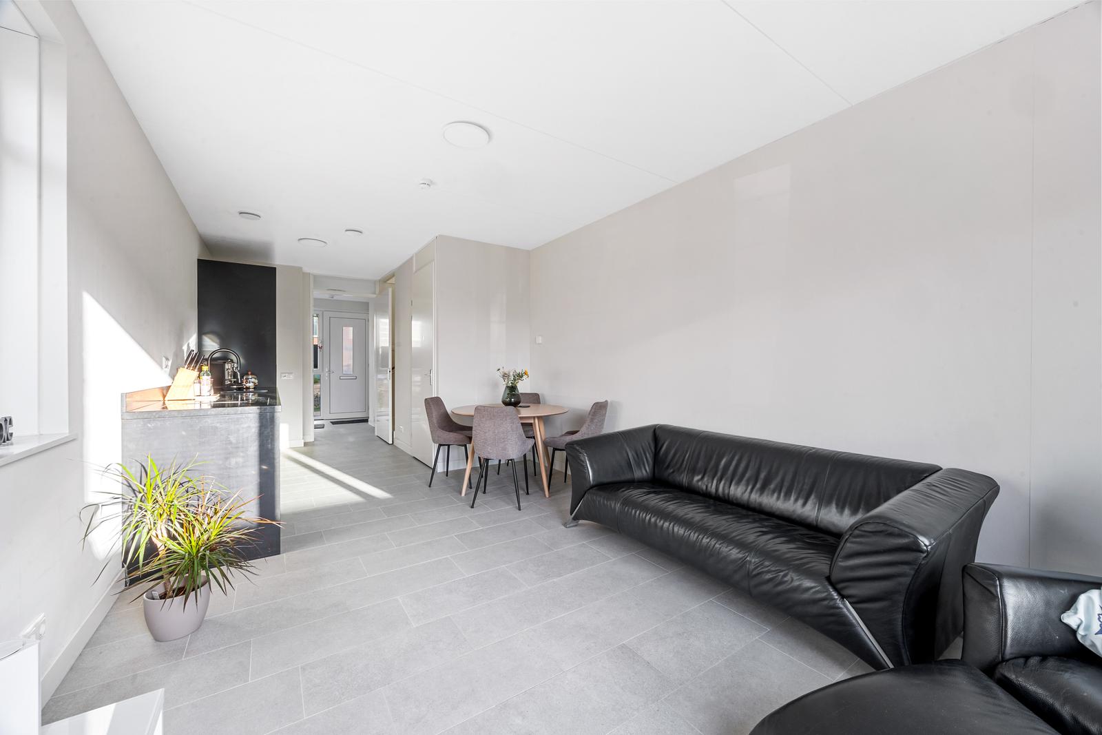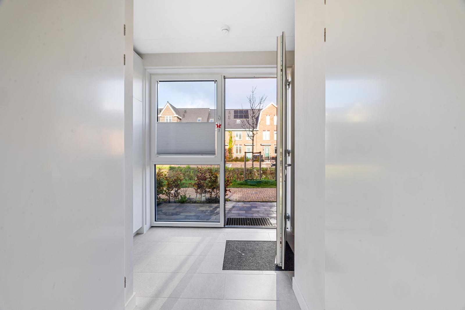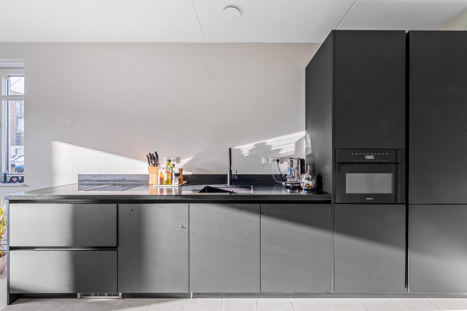 Entree van de woning. Hal met garderobe, meterkast, moderne toiletruimte en drie vaste kasten waarvan één is ingericht voor de warmtepomp. Lichte (tuingerichte) woon-/eetkamer met trapkast en moderne matzwarte open keuken voorzien van een granieten werkblad en diverse luxe Miele inbouwapparatuur. Via de schuifpui toegang tot de zonnige en onderhoudsvriendelijke achtertuin (Z) met berging en achterom.