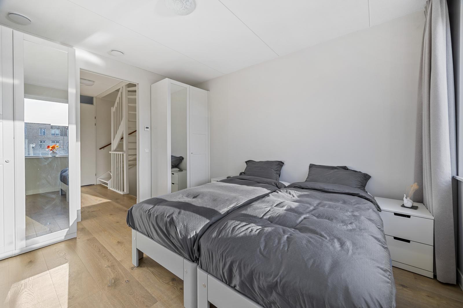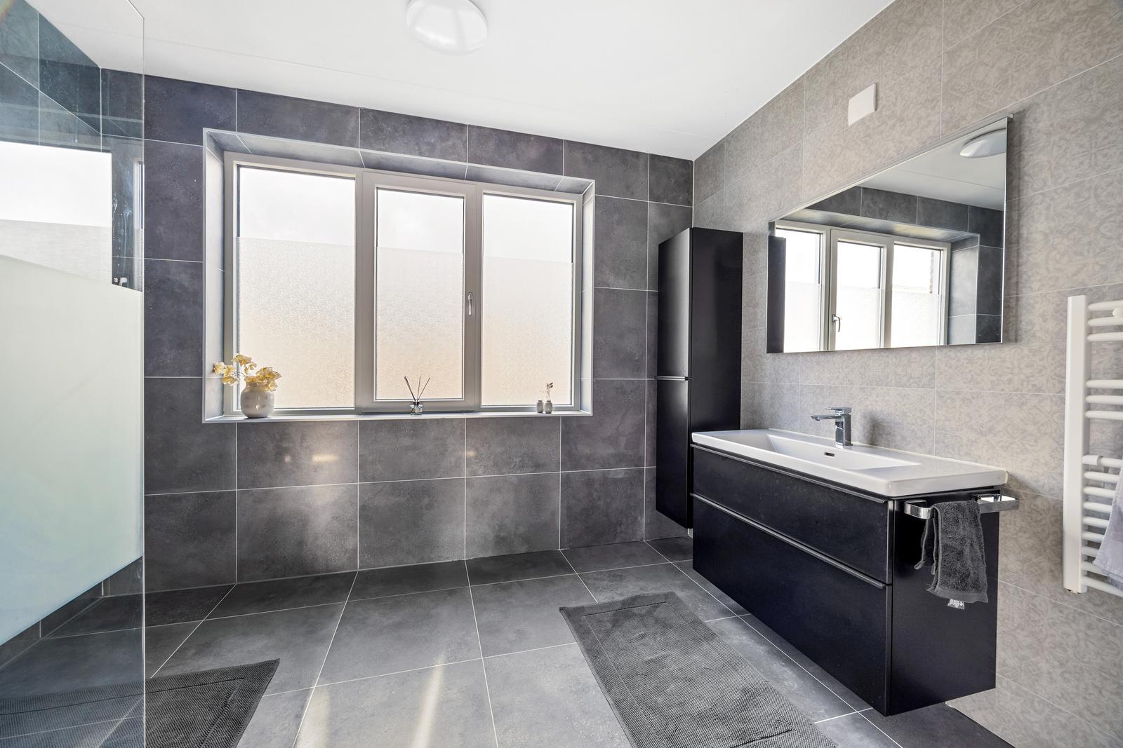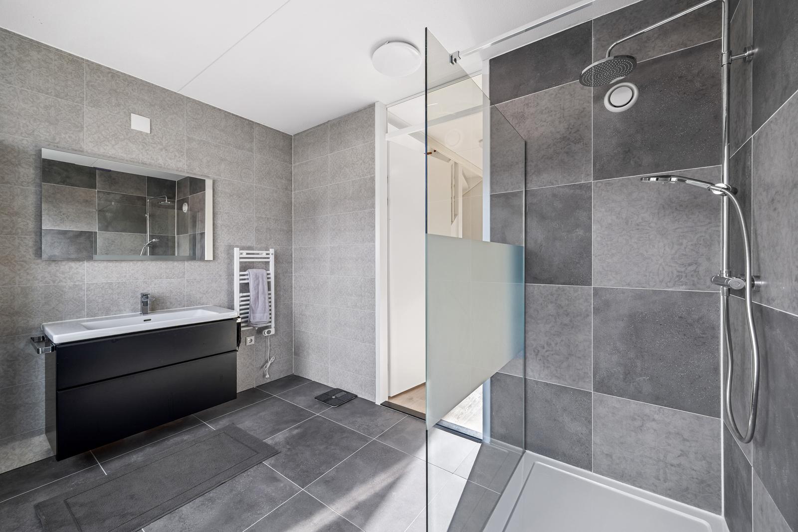 Overloop met vaste kast en moderne toiletruimte. Ruime (gevelbrede) slaapkamer aan de achterzijde. Moderne badkamer aan de voorzijde met inloopdouche, wastafelmeubel, handdoekradiator en daglichttoetreding.