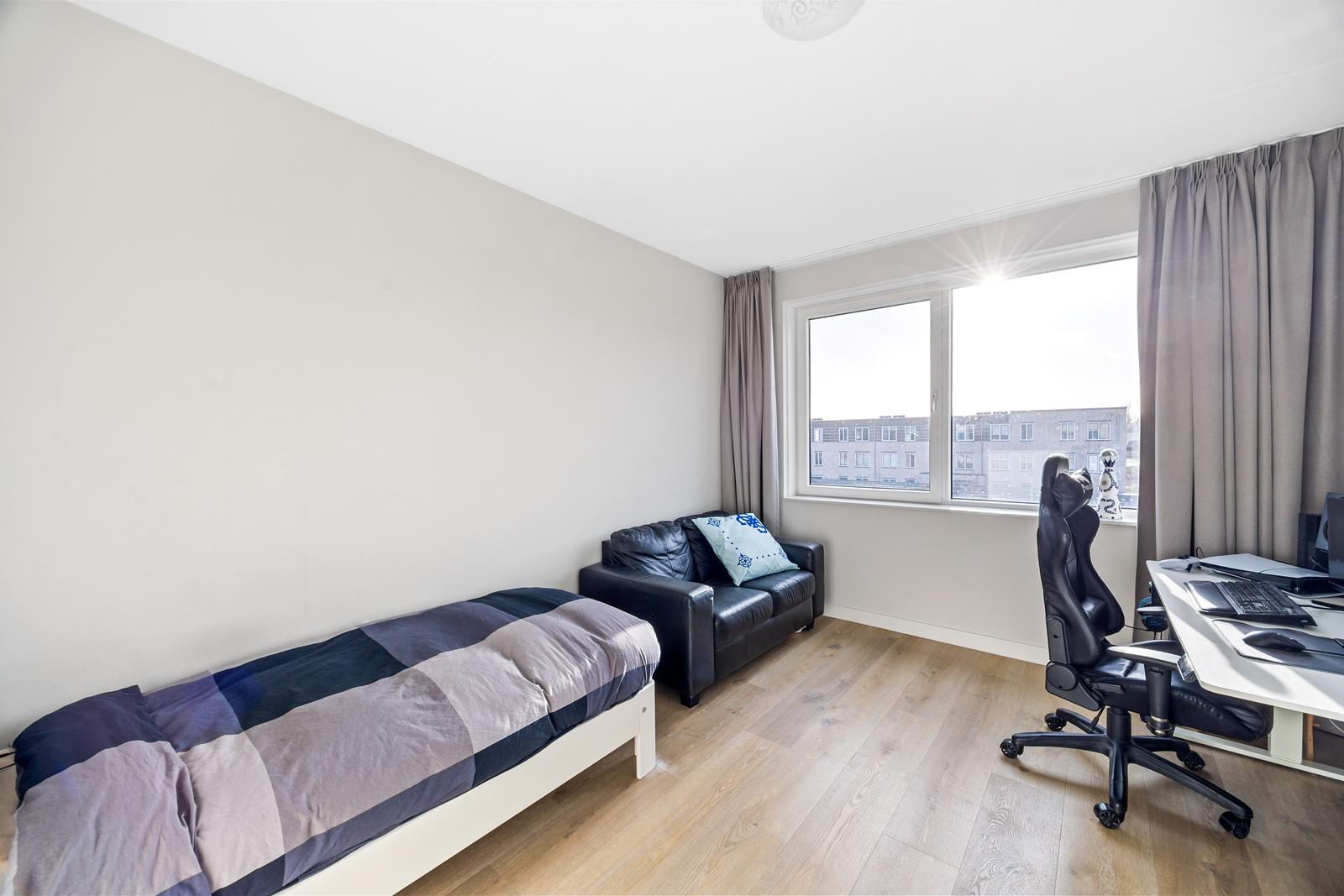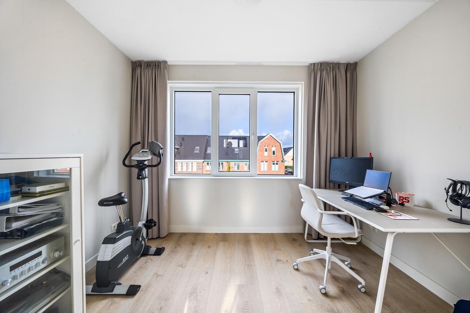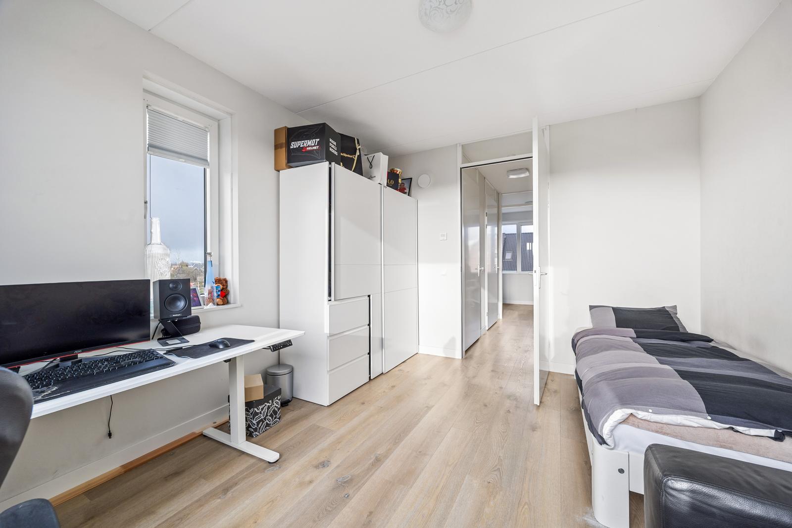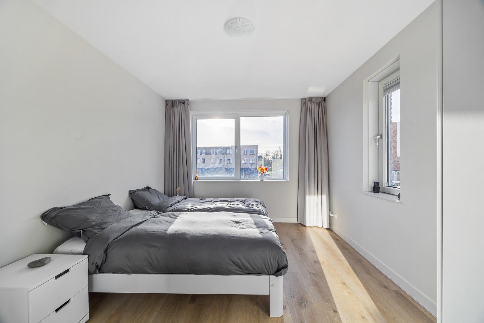 Overloop met vaste kast en moderne toiletruimte. Ruime (gevelbrede) slaapkamer aan de achterzijde. Moderne badkamer aan de voorzijde met inloopdouche, wastafelmeubel, handdoekradiator en daglichttoetreding.