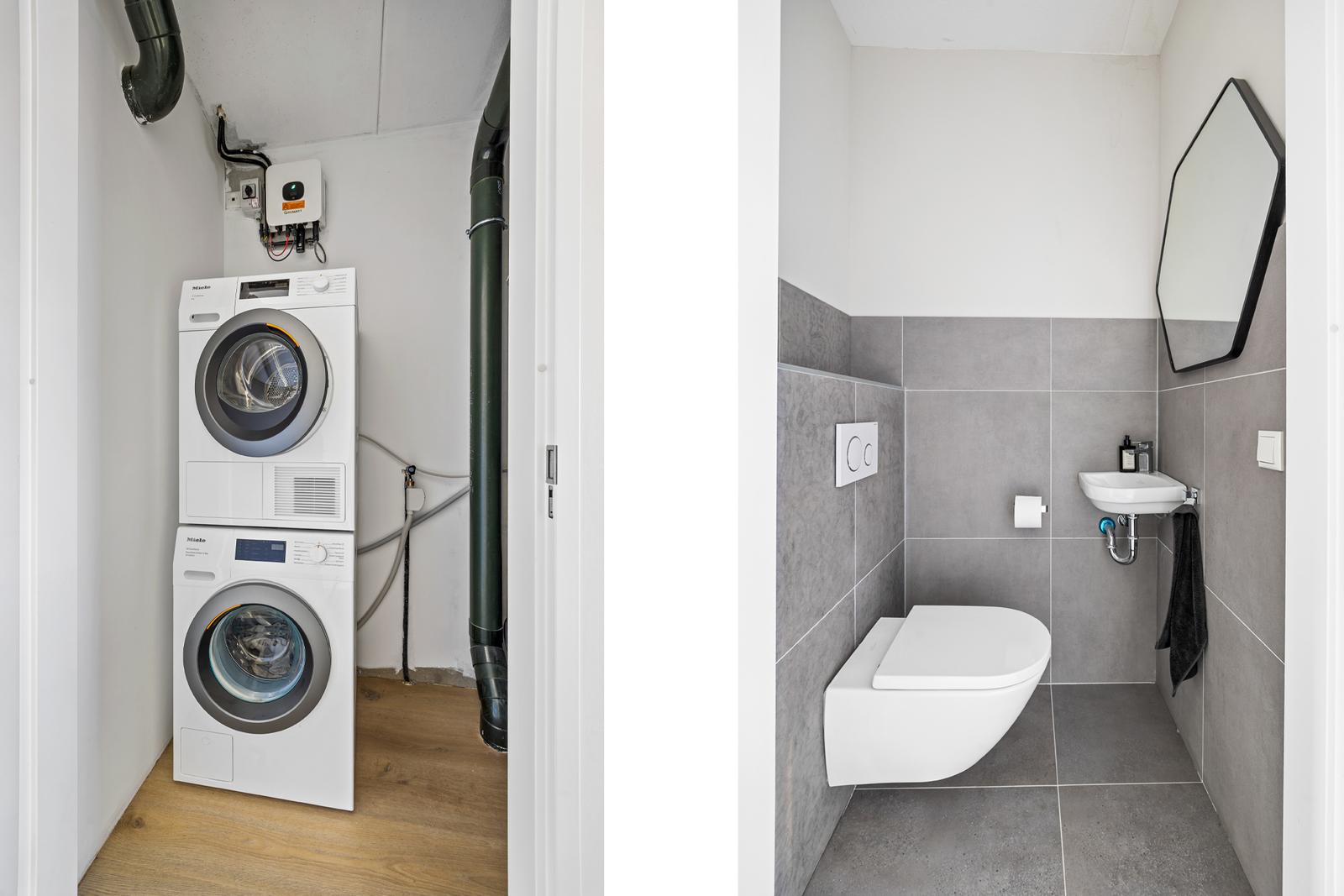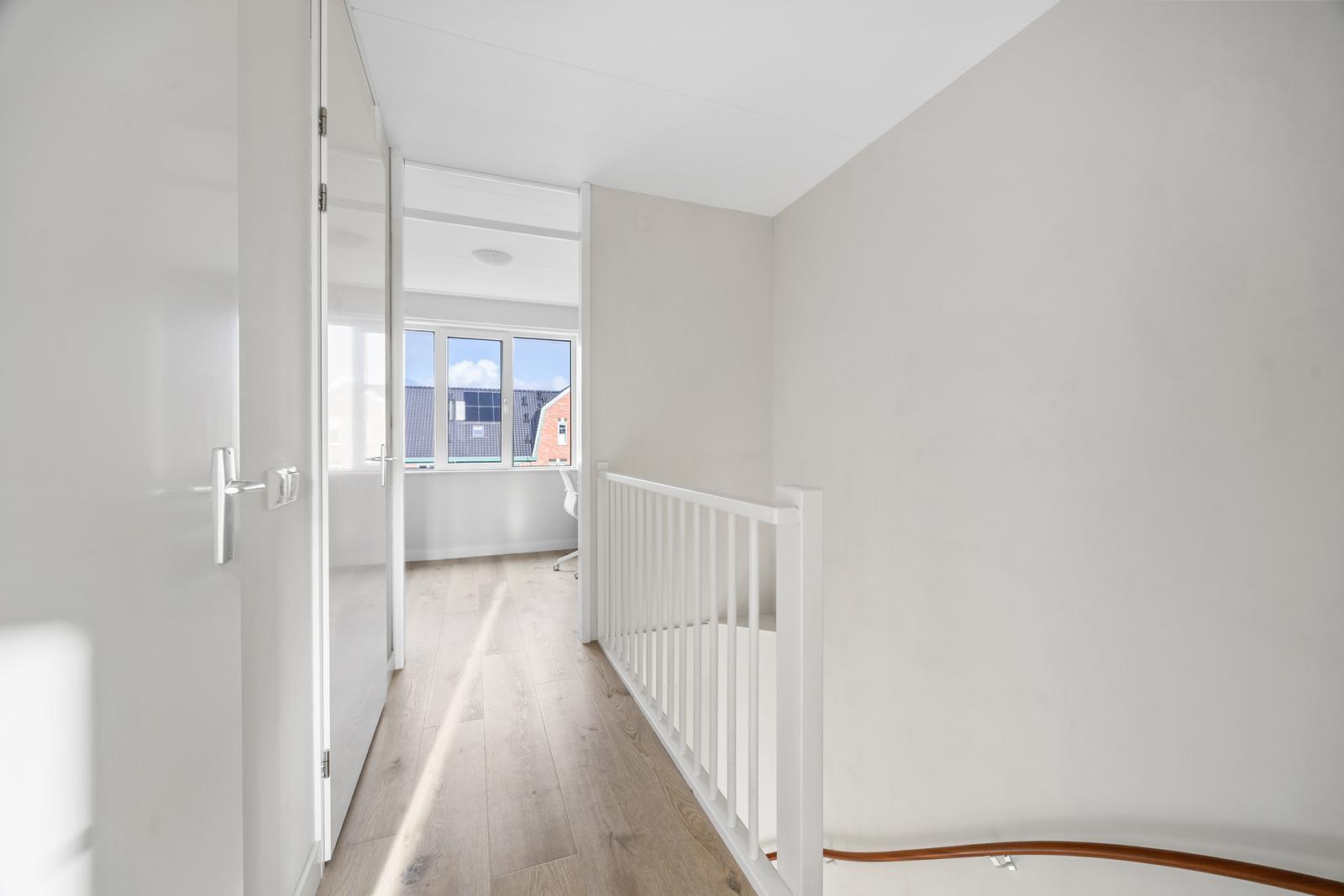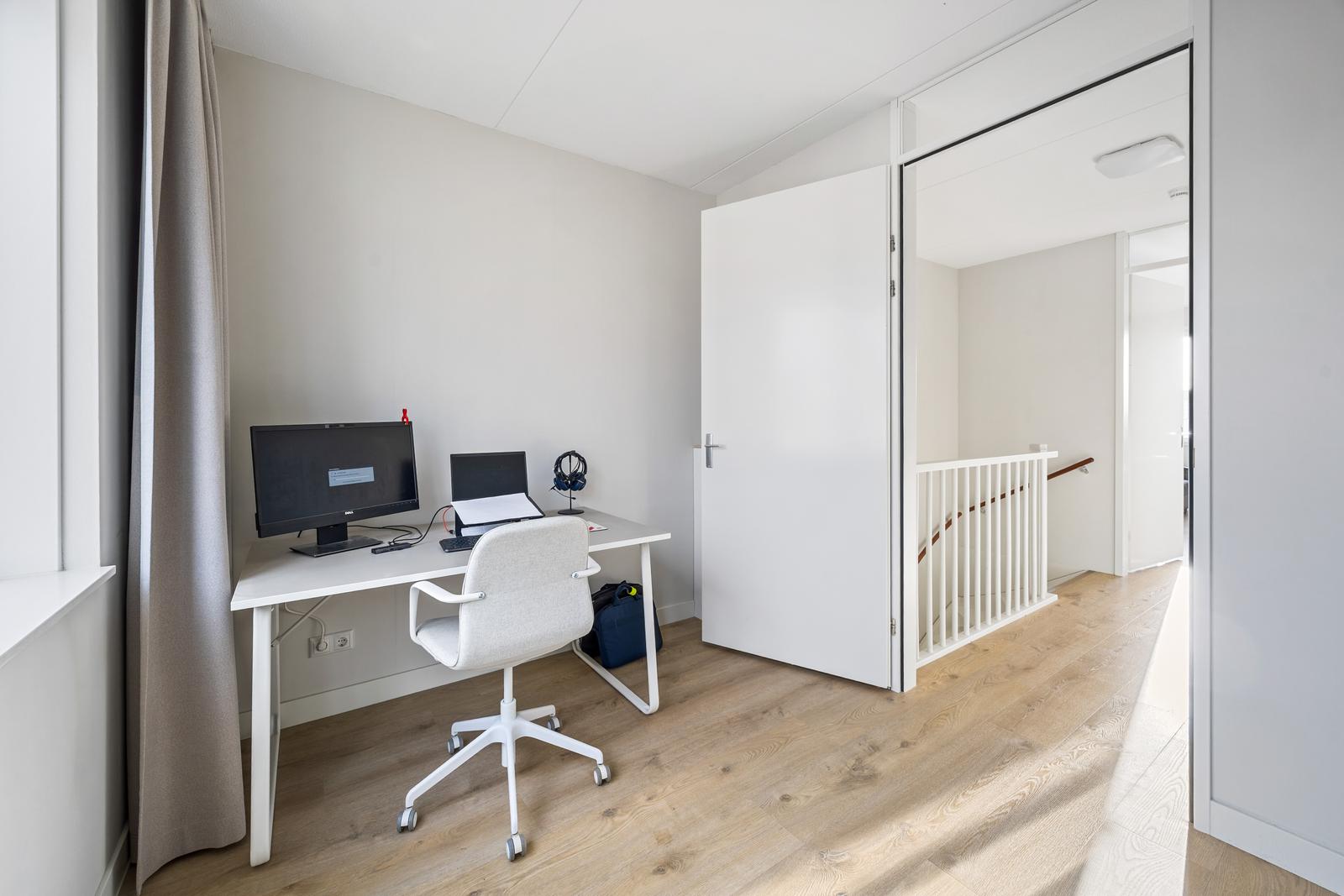 Overloop met een vaste kast waarin de wasmachine, droger, WTW-installatie en de omvormer van de zonnepanelen. Slaapkamer van goed formaat aan de voorzijde en een ruime slaapkamer aan de achterzijde.