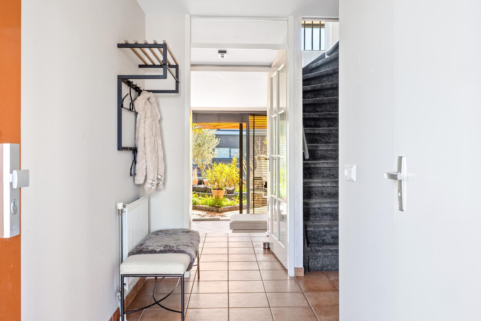 Voortuin en oprit met parkeergelegenheid voor twee auto’s op eigen terrein en toegang tot de overdekte entree. Ruime hal met garderobe, meterkast, modern separaat toilet met fonteintje en toegang tot de verwarmde inpandige garage.