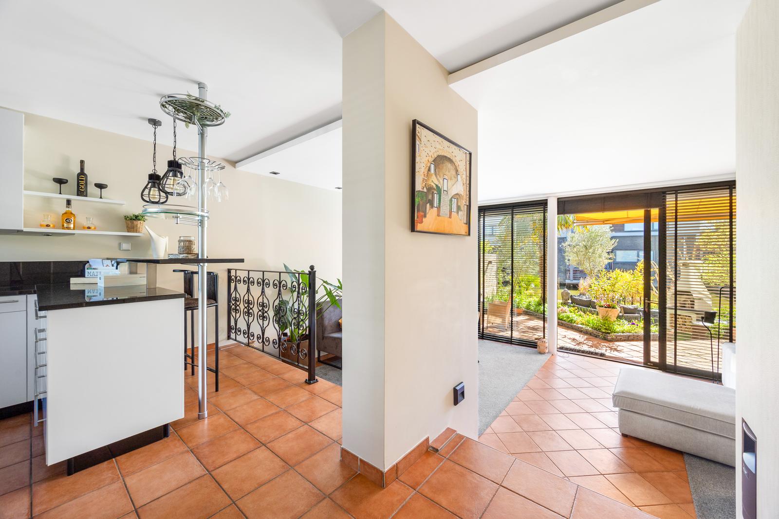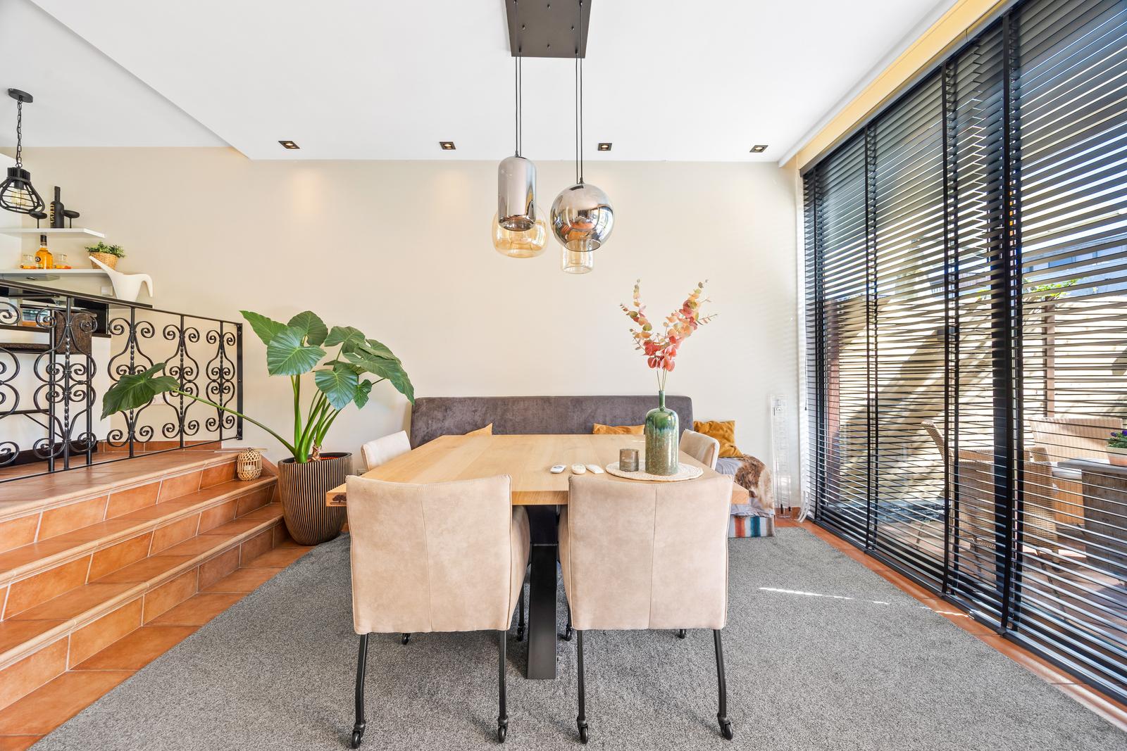 Middels enkele treden (split-level) bereikt u de zeer lichte en royale woon-/eetkamer met hoog plafond en