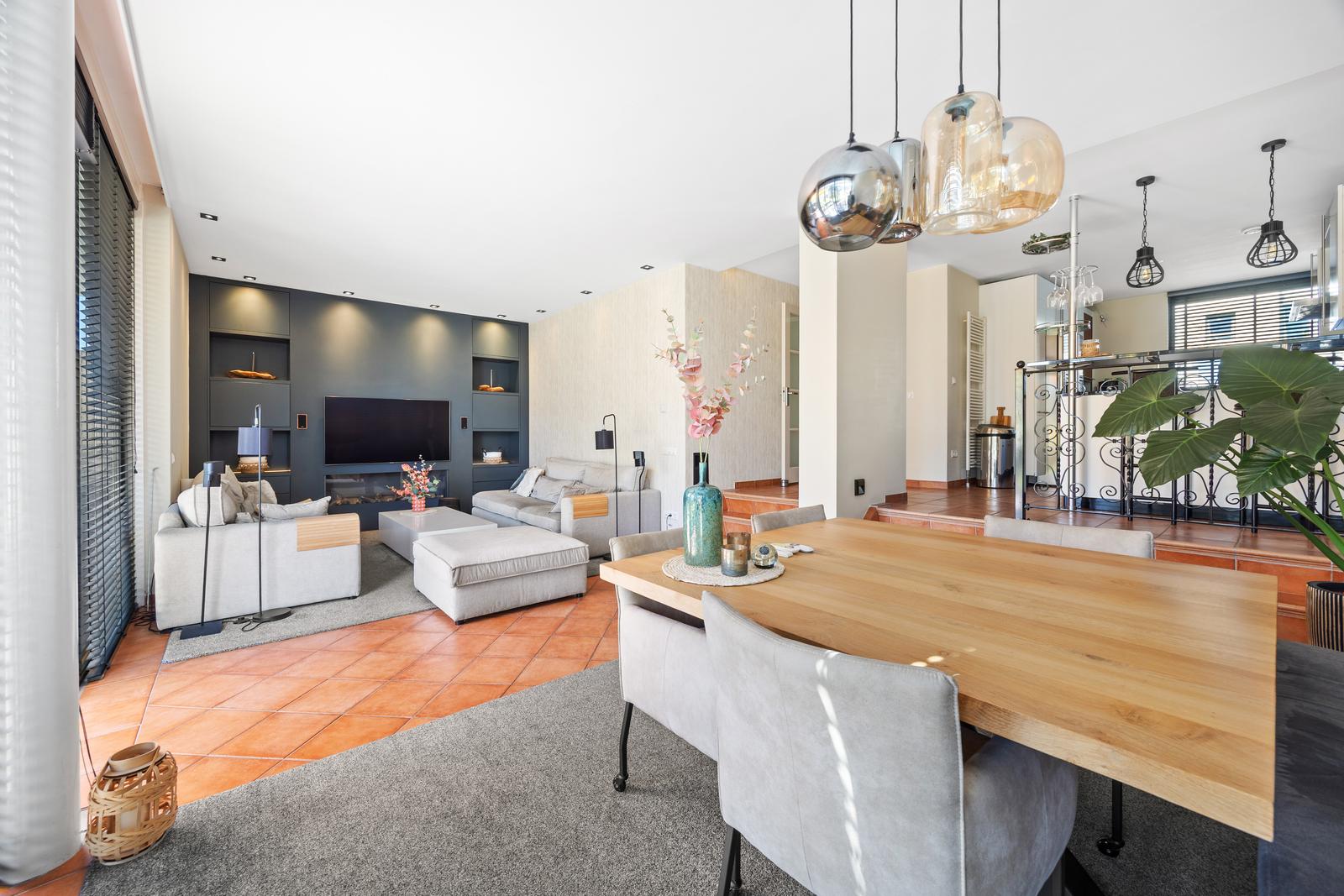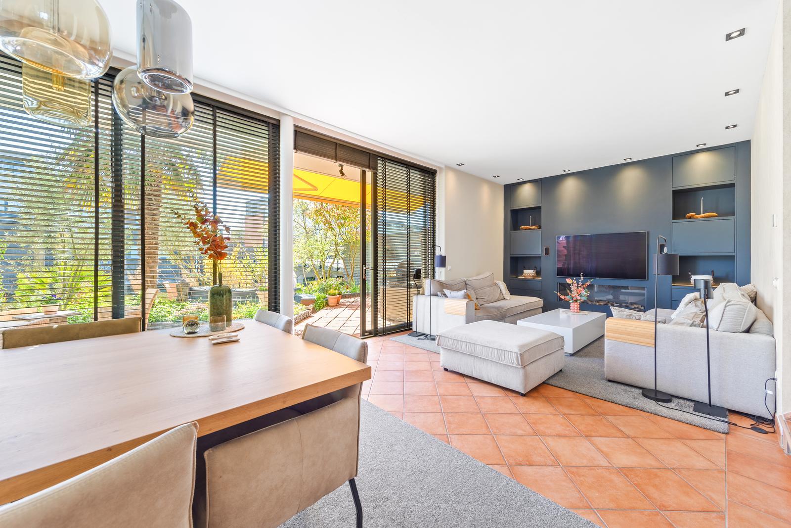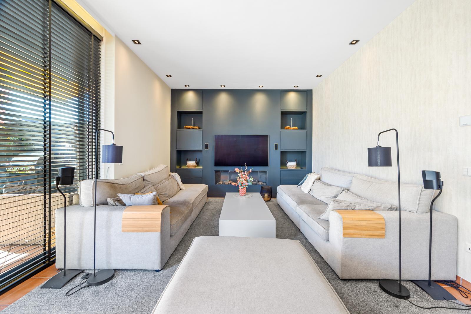- Royale tuingerichte woonkamer met stijlvolle cinewall en geïntegreerde haard;