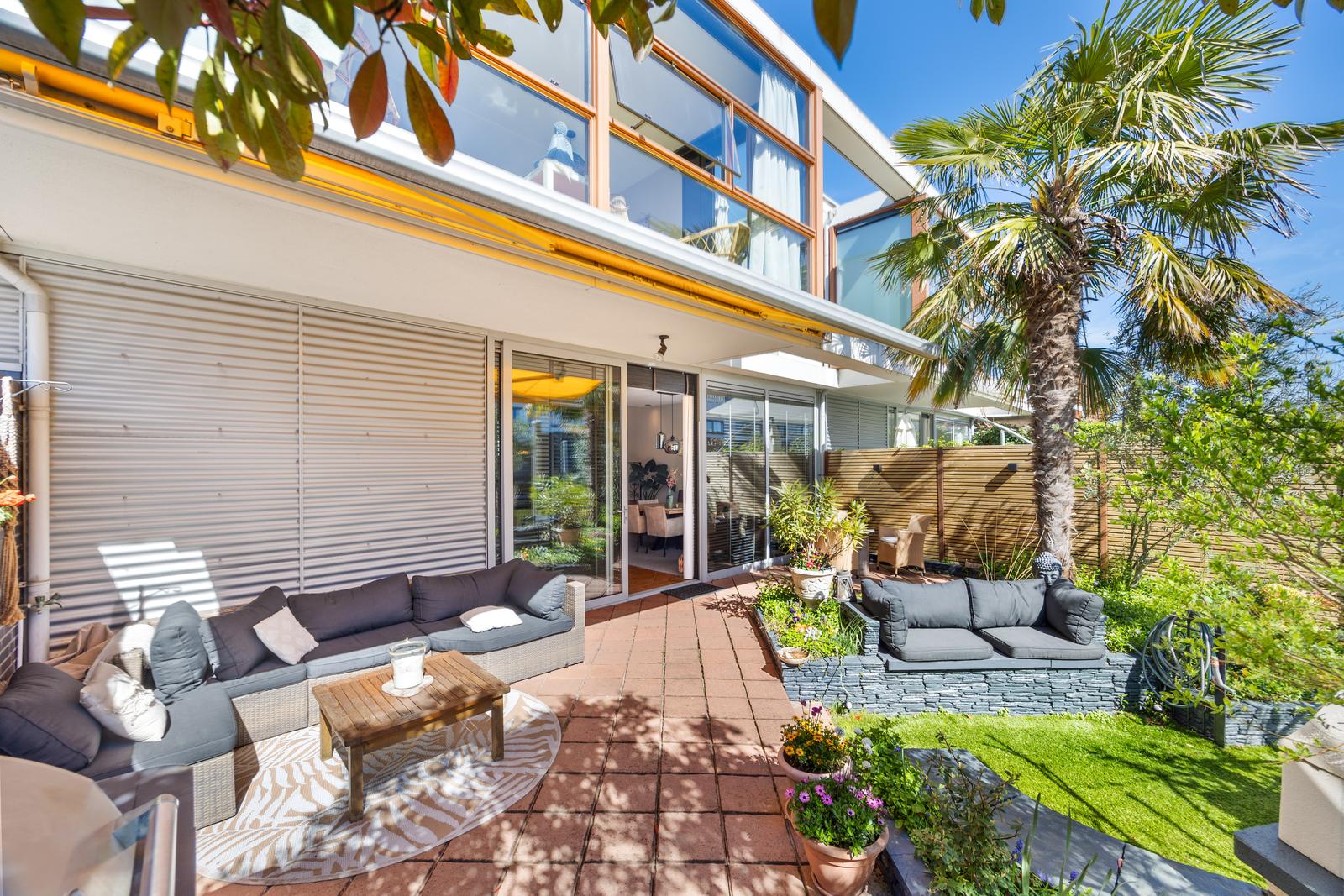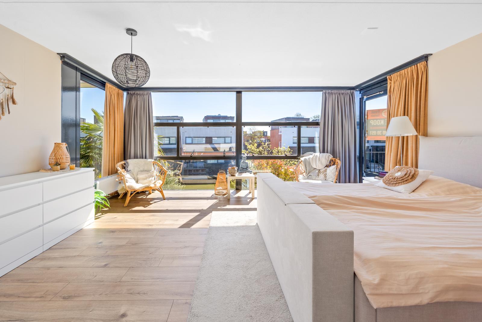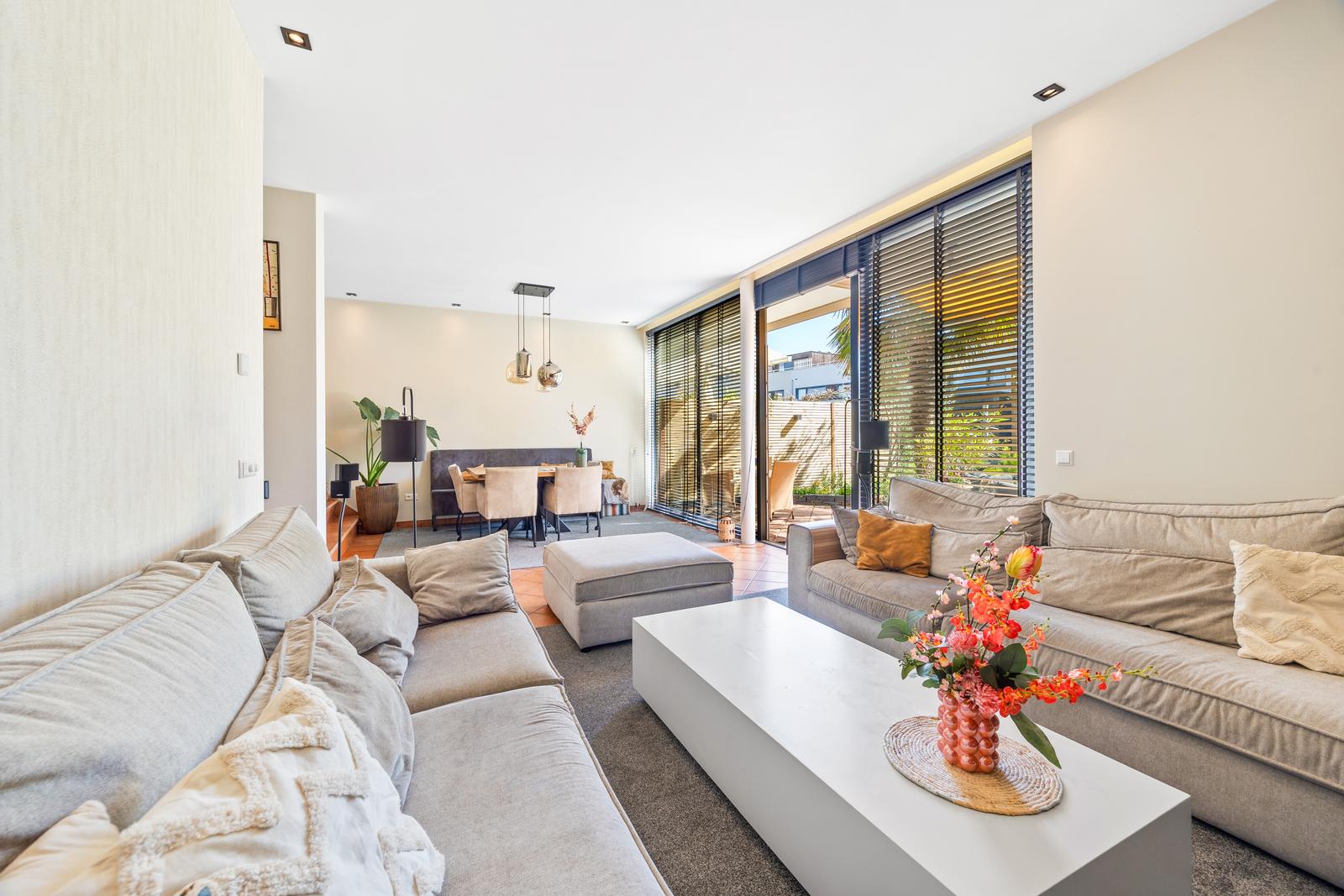 De grote raampartijen zorgen voor een prachtige lichtinval en geven de woning een bijzonder ruimtelijk en open karakter.