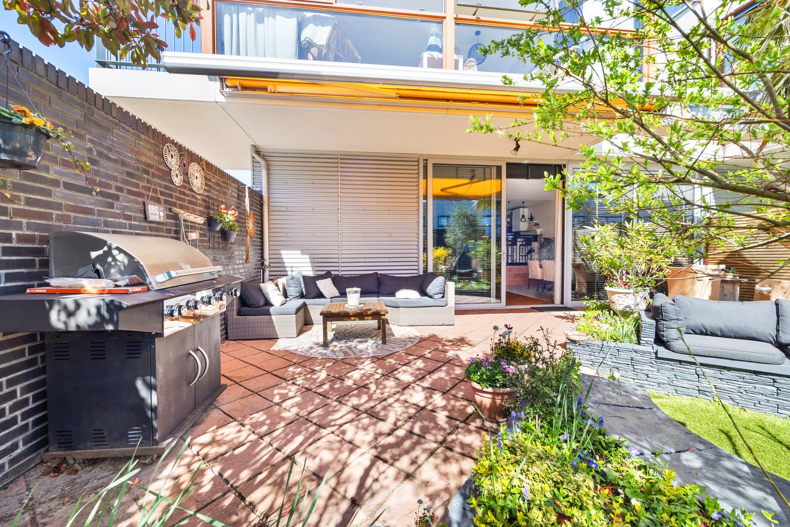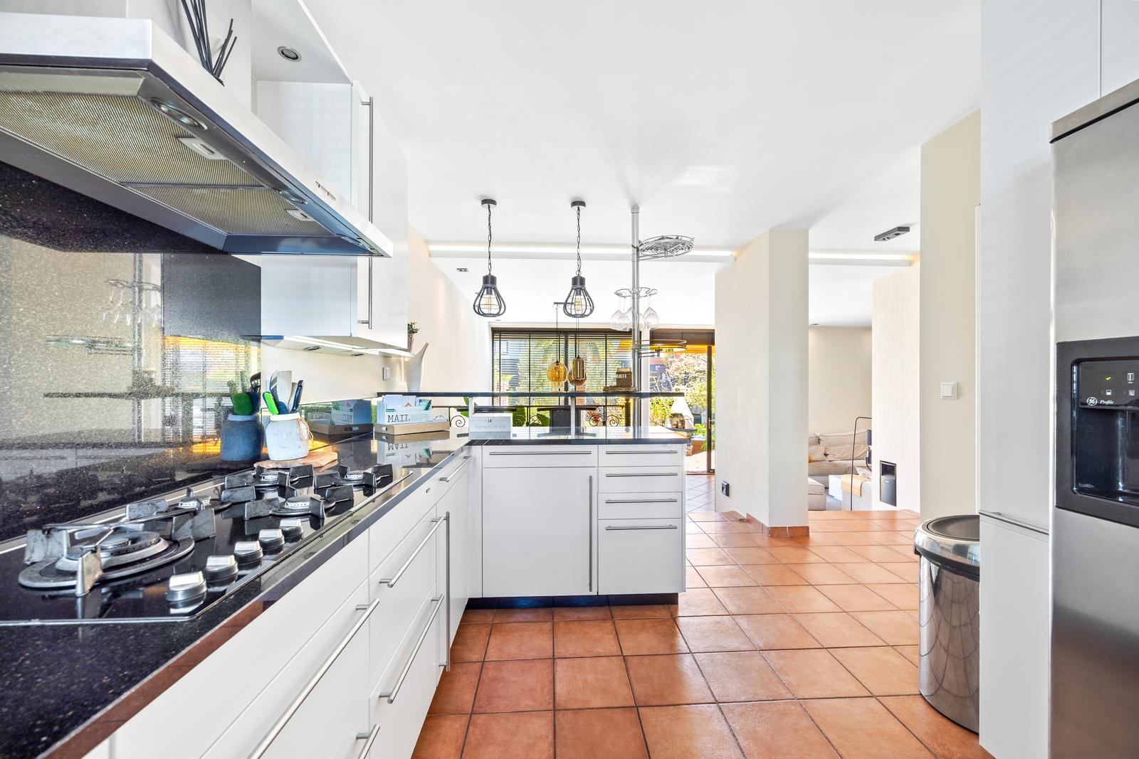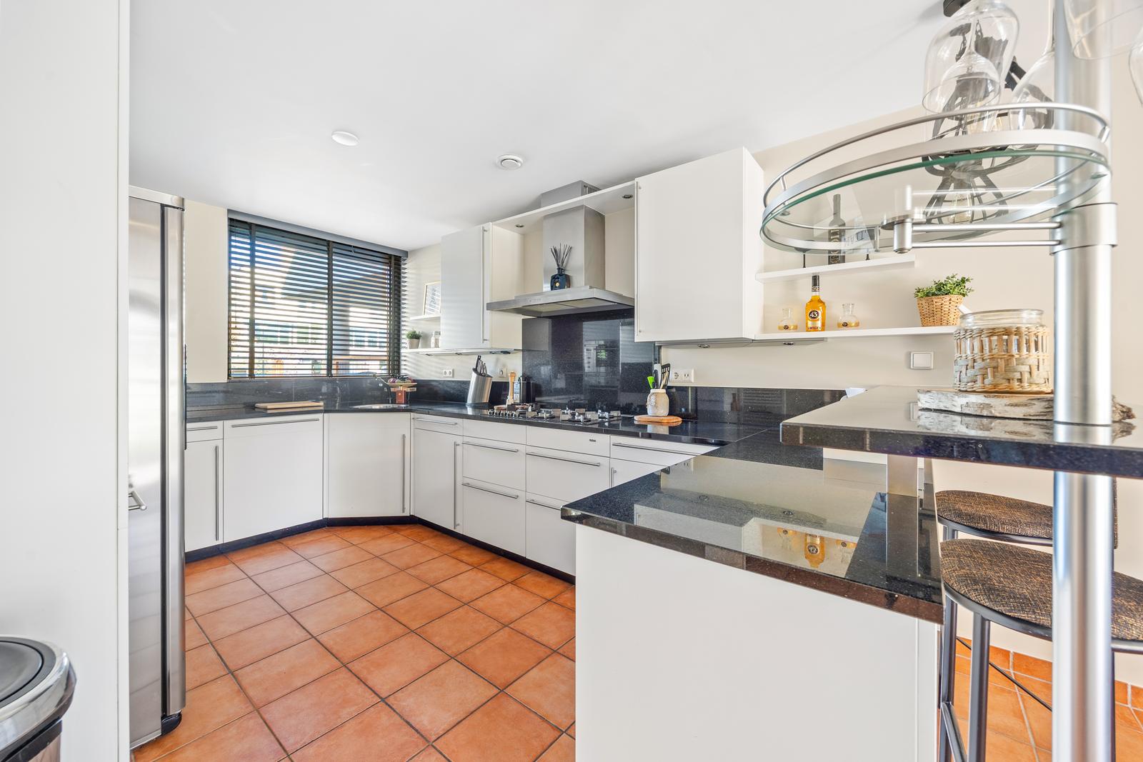 Aan de voorzijde bevindt zich de moderne open keuken voorzien van een natuurstenen werkblad, diverse inbouwapparatuur, een Amerikaanse koelkast en een gezellig barretje.