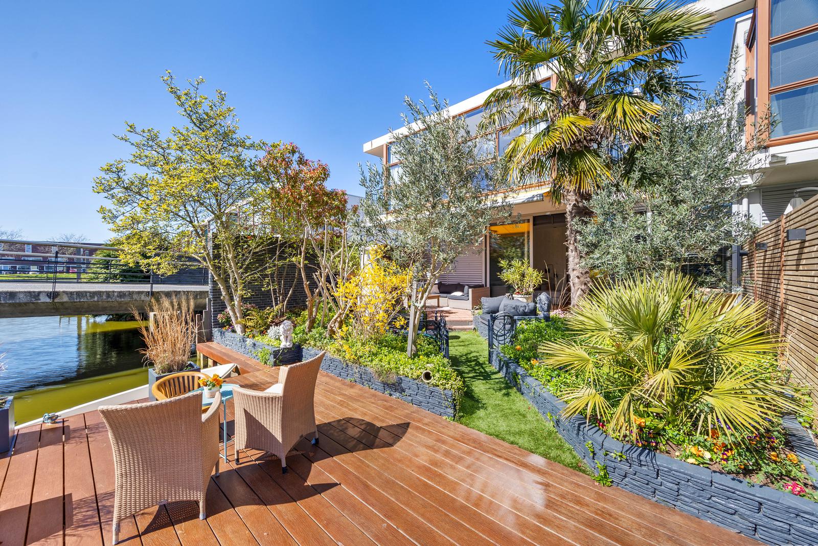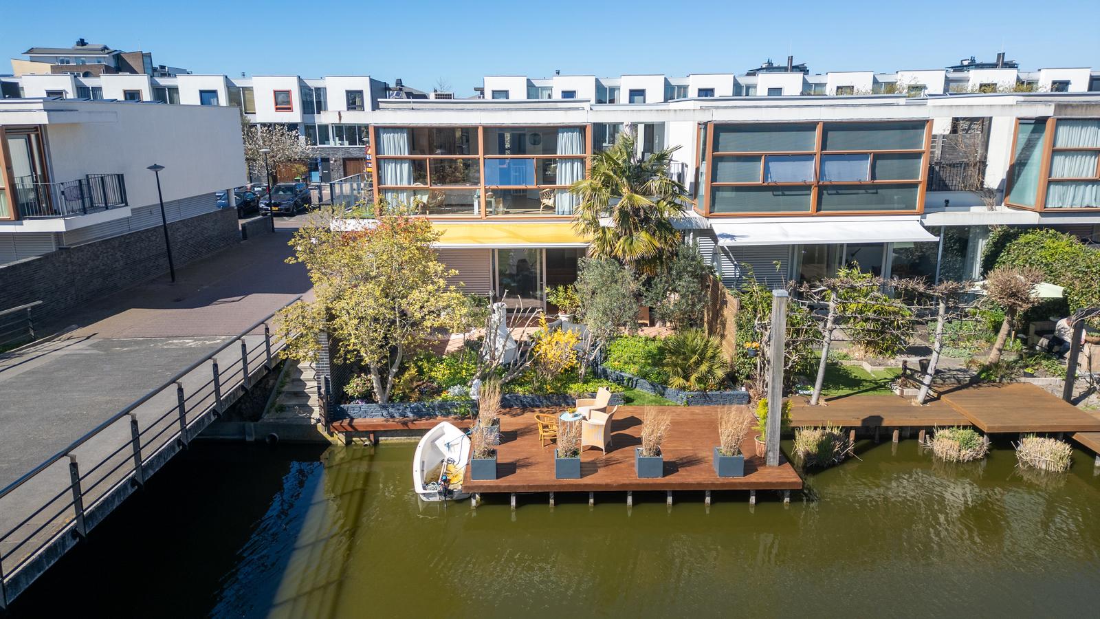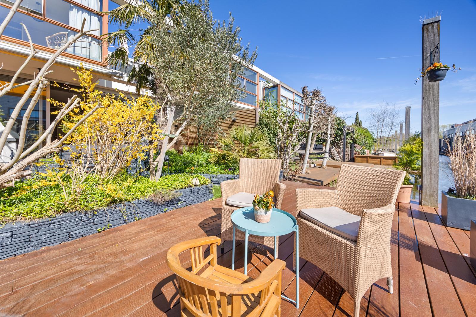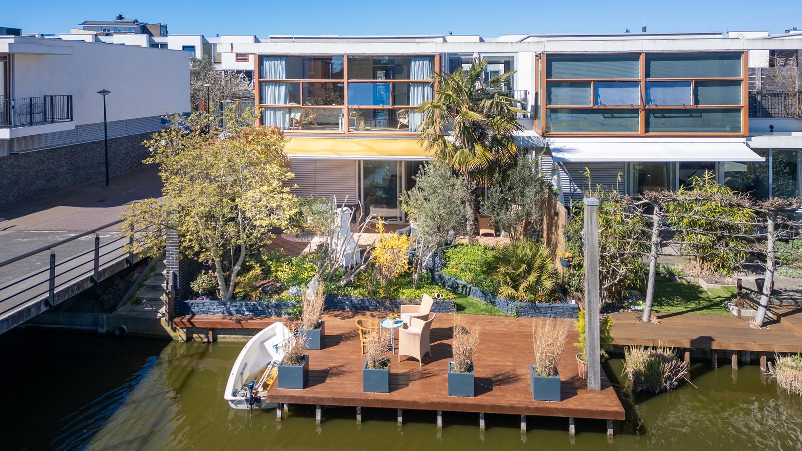 een stijlvolle cinewall met geïntegreerde haard. De schuifpui vormt een fraaie verbinding met de achtertuin, voorzien van elektrische zonwering en een ruim vlonderterras met aanlegsteiger aan het water.