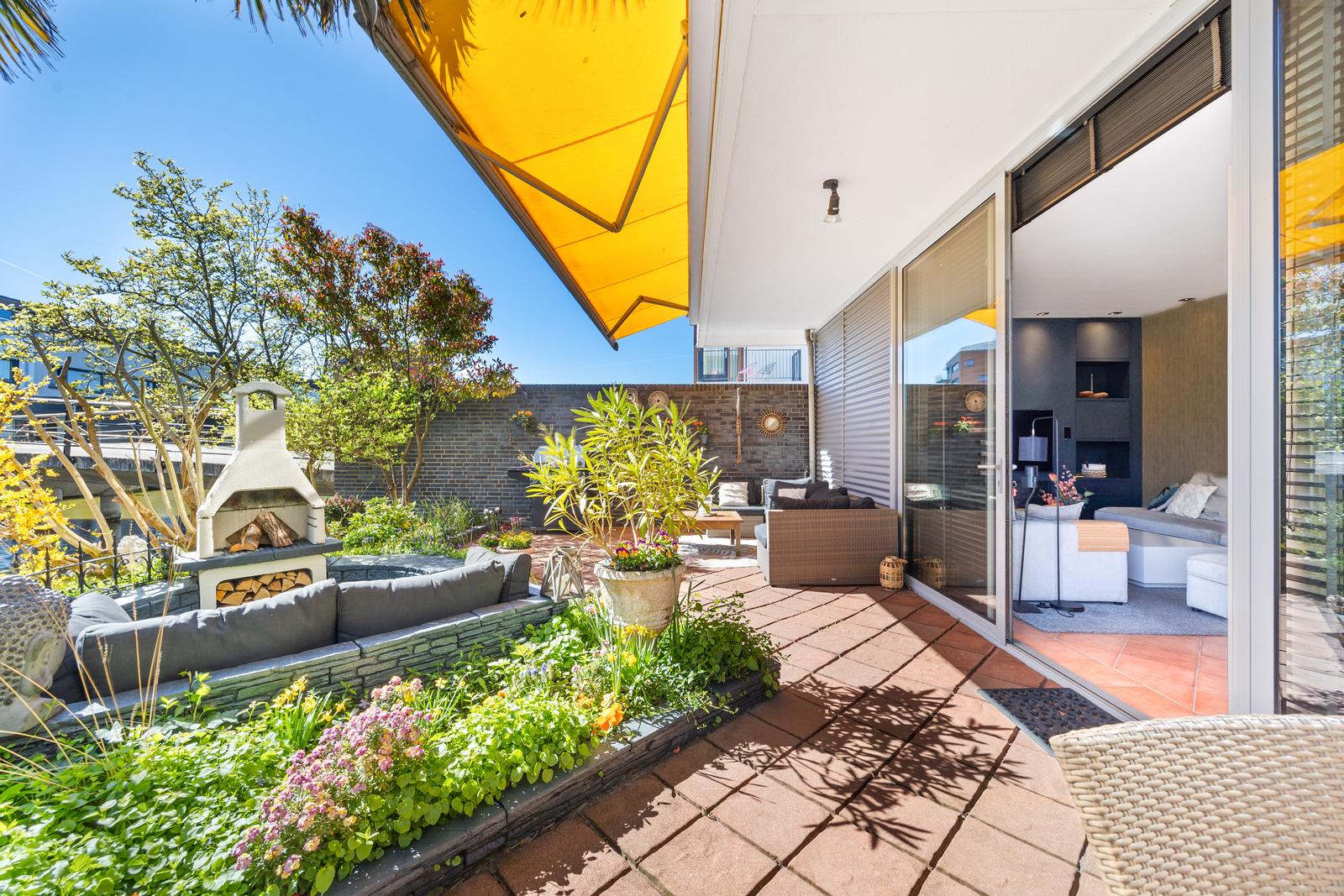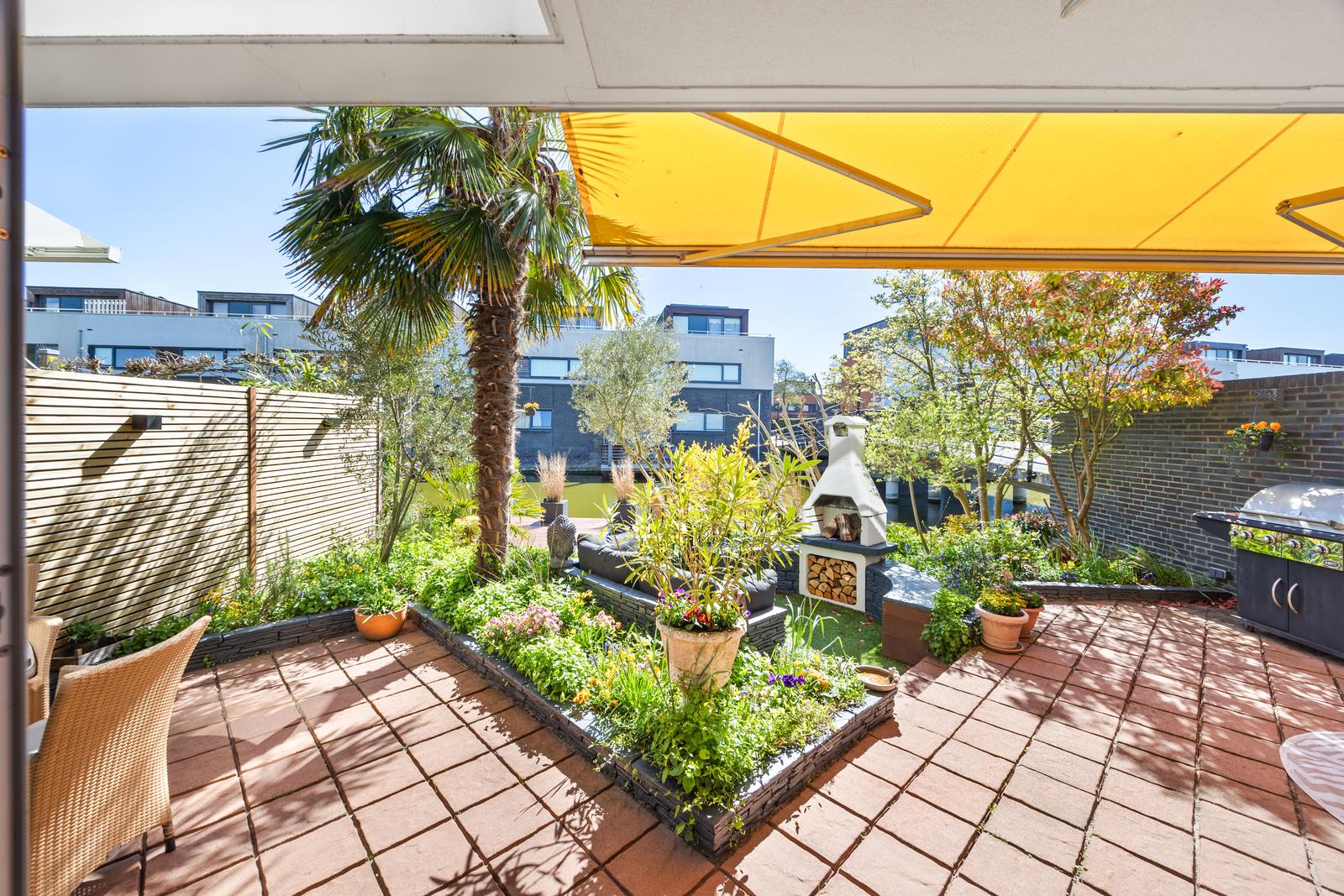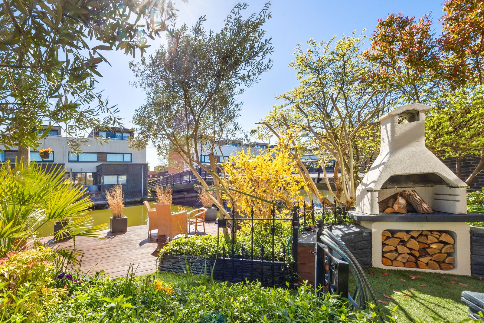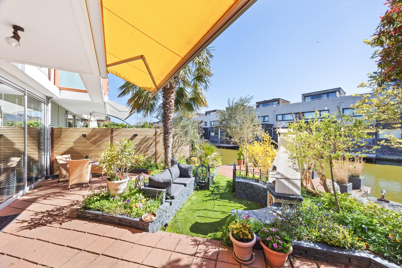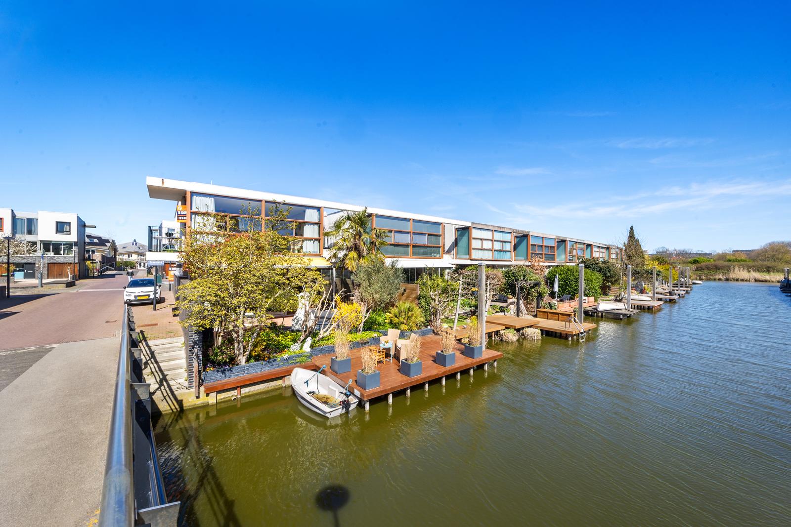 een stijlvolle cinewall met geïntegreerde haard. De schuifpui vormt een fraaie verbinding met de achtertuin, voorzien van elektrische zonwering en een ruim vlonderterras met aanlegsteiger aan het water.
