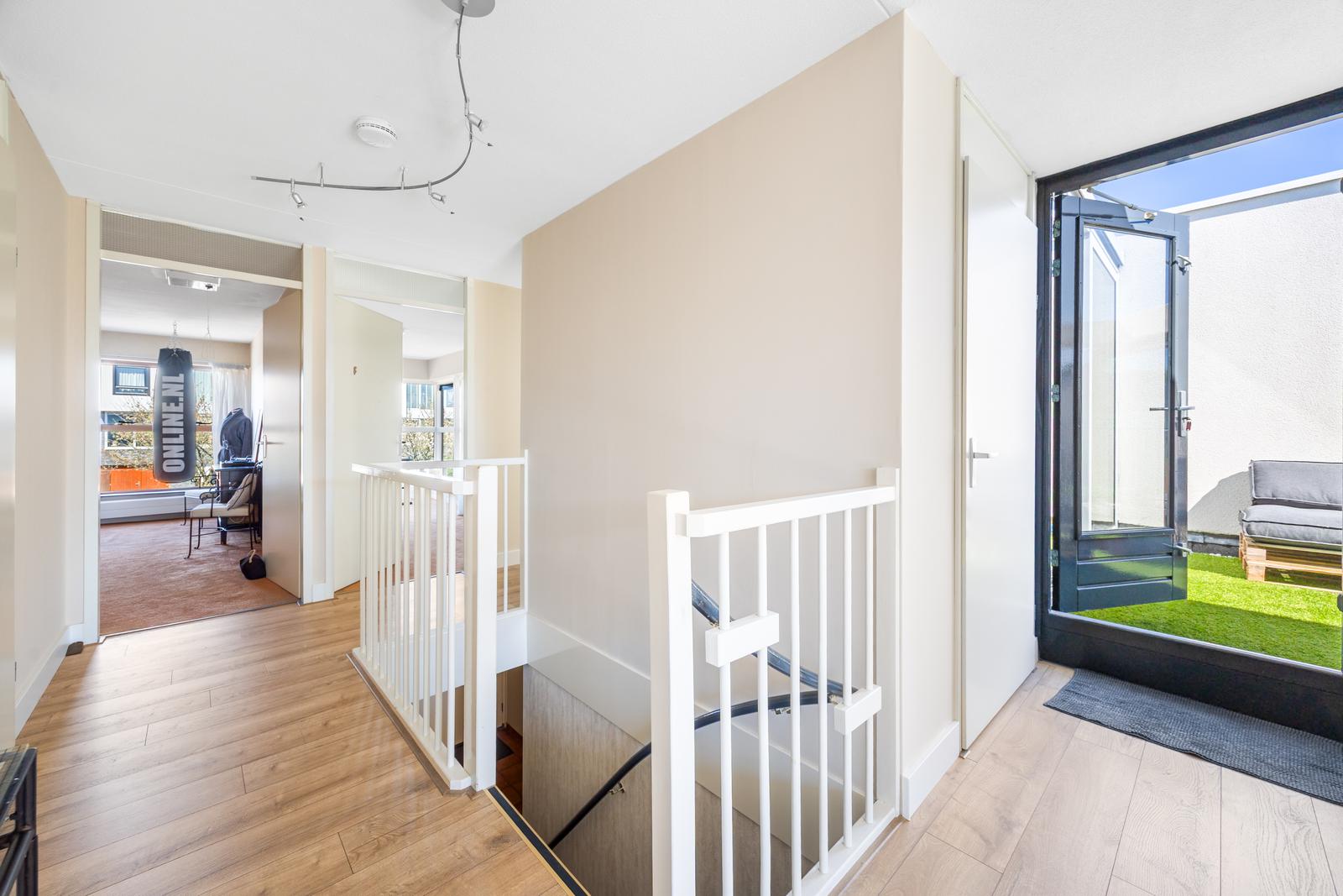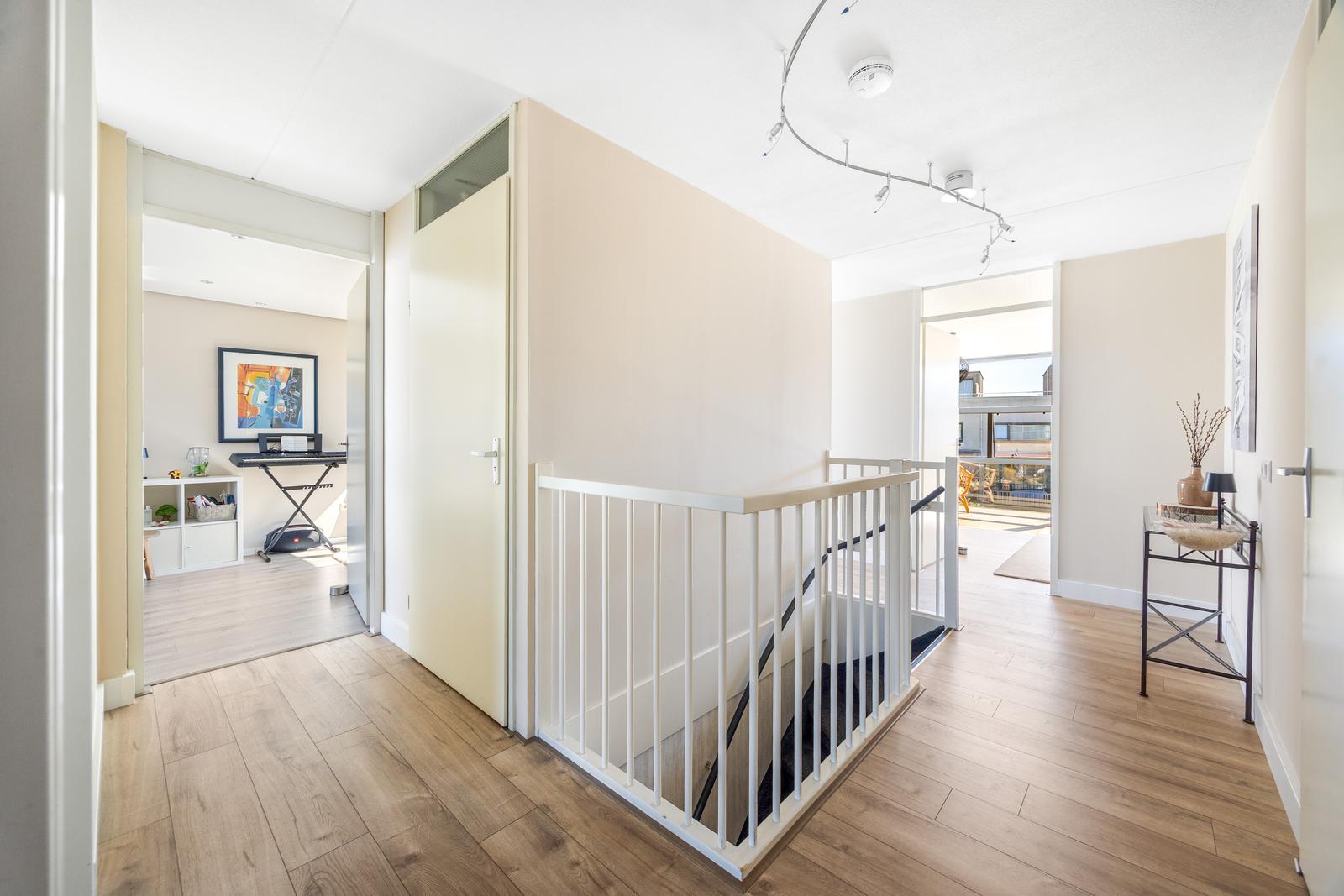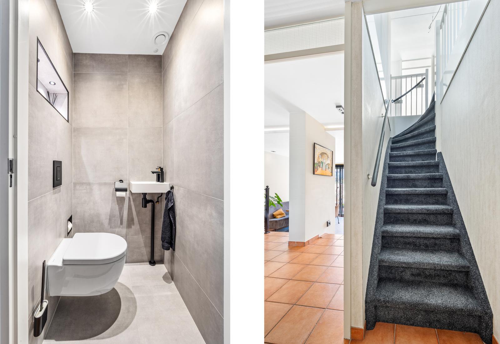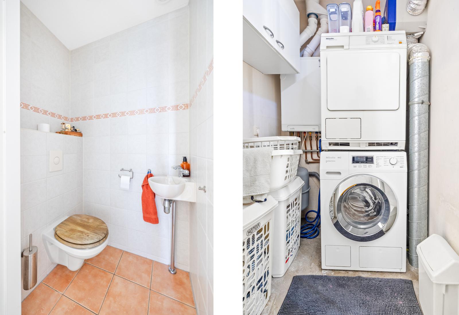 Overloop met modern separaat toilet met fonteintje en een praktische wasruimte met opstelplaats voor de cv-ketel. Luxe, volledig betegelde badkamer voorzien van een douche, ligbad met whirlpool, dubbele wastafel, handdoekradiator en vloerverwarming.