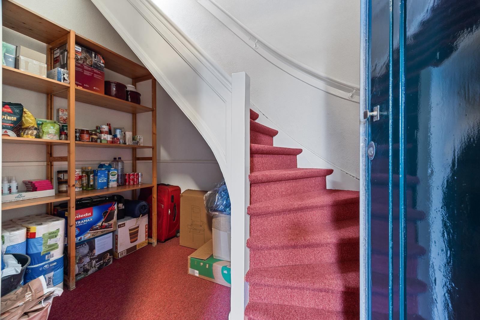 Open portiek; entree woning op de eerste verdieping; hal met meterkast, bergruimte en binnentrap naar de tweede verdieping.