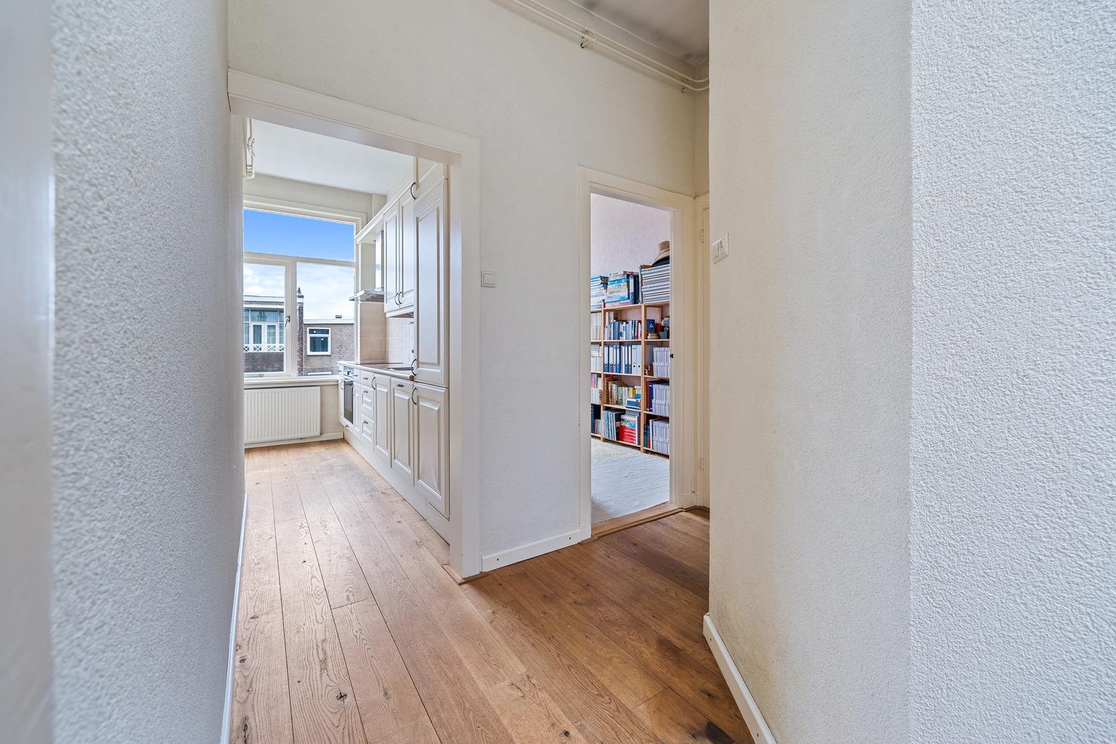 Overloop met dakraam, wasruimte en separate toiletruimte; ruime (slaap-) kamer aan de voorzijde met dubbele deuren naar het voorbalkon; tweede (slaap-) kamer van goed formaat aan de achterzijde; nette (tussengelegen) badkamer met douche, wastafelmeubel en radiator; royale en lichte (doorgebroken) woon-/eetkamer met zitgedeelte aan de voorzijde en eetgedeelte aan de achterzijde; nette (dichte) keuken met diverse inbouwapparatuur en voldoende werk- en opbergruimte. De keuken en woon-/eetkamer geven toegang tot het achterbalkon.