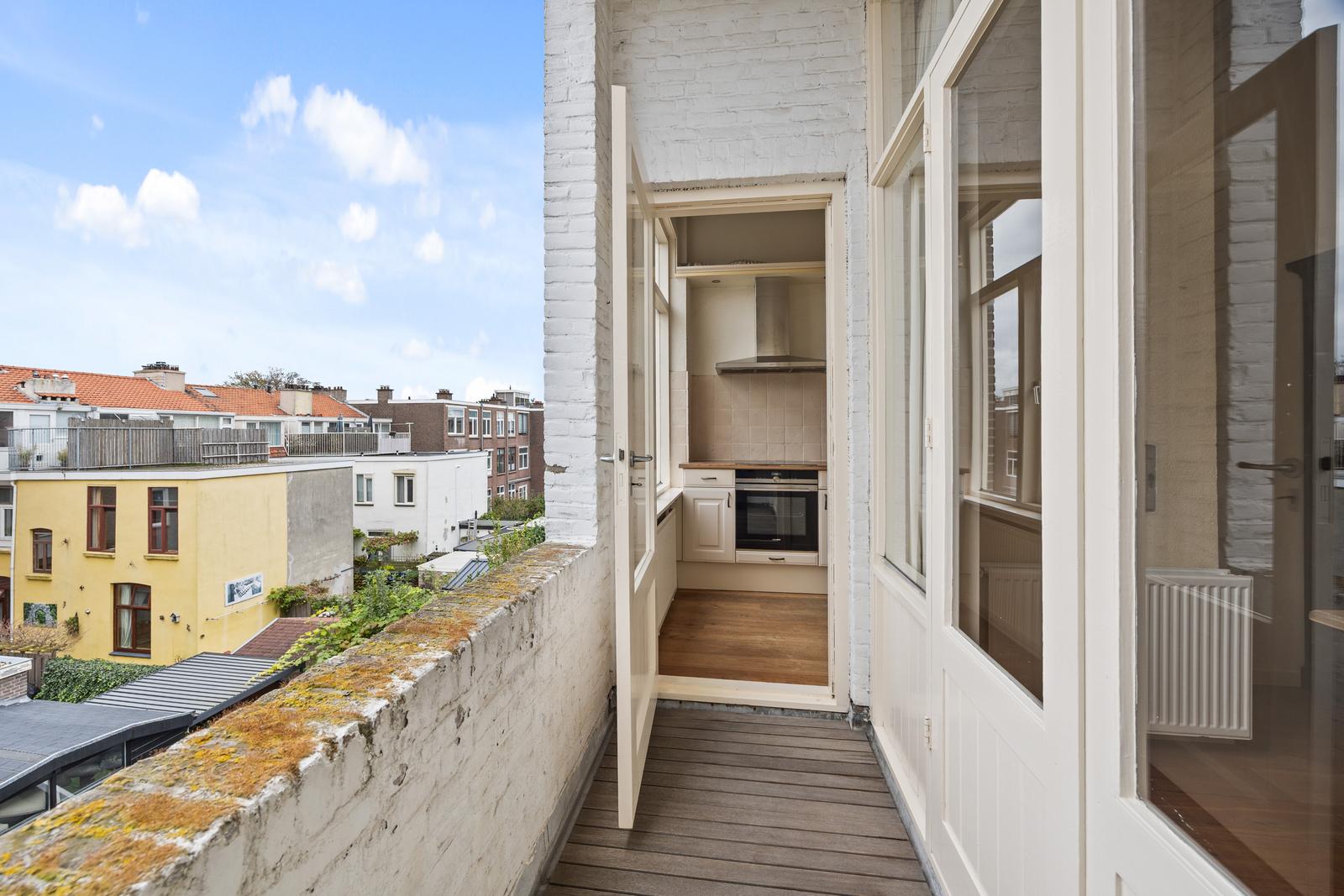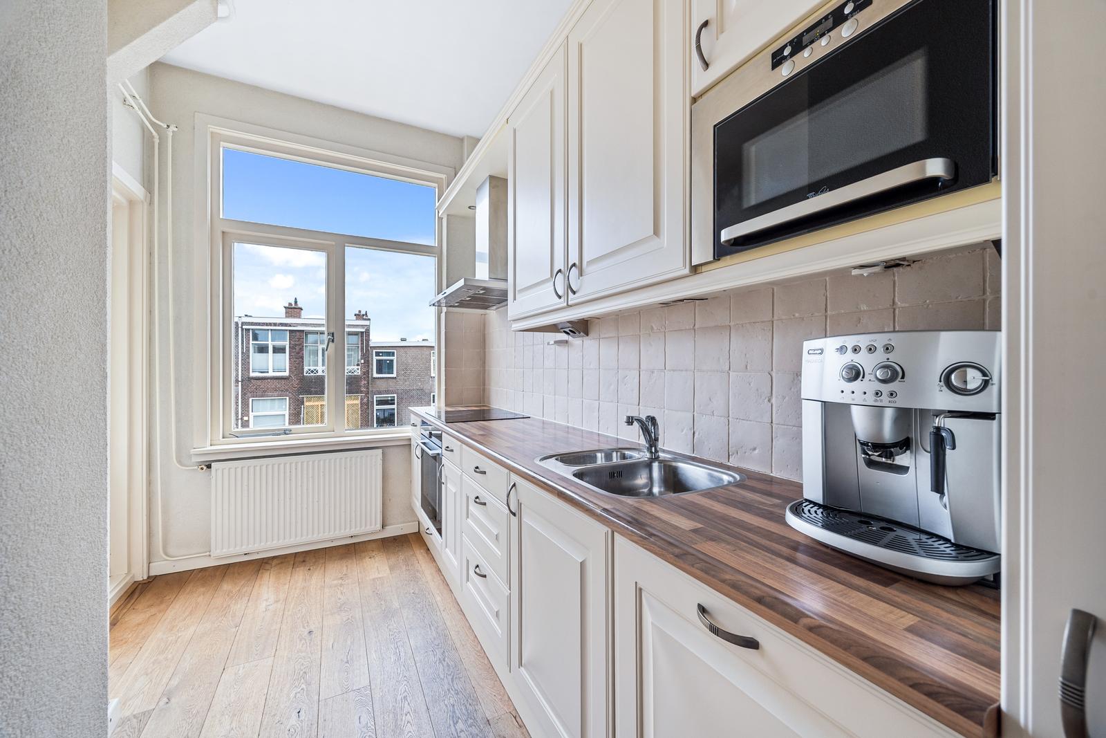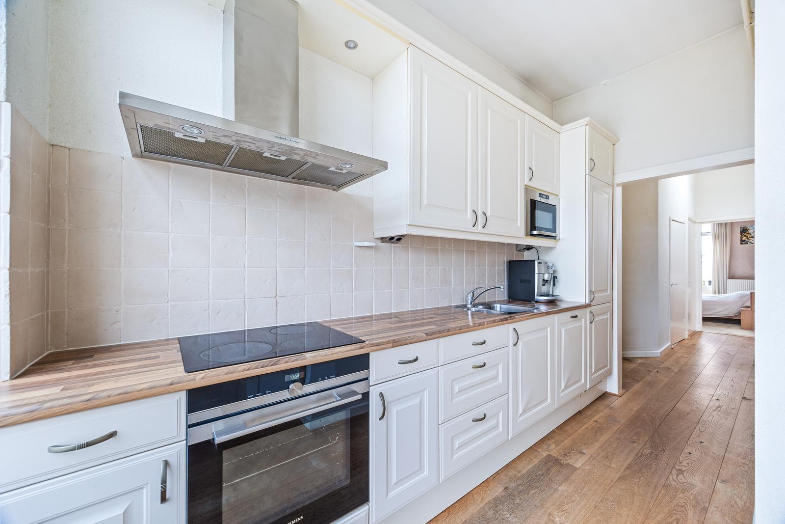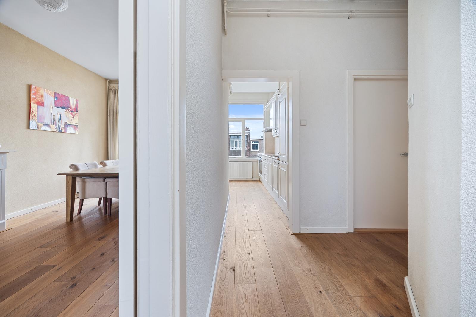 Overloop met dakraam, wasruimte en separate toiletruimte; ruime (slaap-) kamer aan de voorzijde met dubbele deuren naar het voorbalkon; tweede (slaap-) kamer van goed formaat aan de achterzijde; nette (tussengelegen) badkamer met douche, wastafelmeubel en radiator; royale en lichte (doorgebroken) woon-/eetkamer met zitgedeelte aan de voorzijde en eetgedeelte aan de achterzijde; nette (dichte) keuken met diverse inbouwapparatuur en voldoende werk- en opbergruimte. De keuken en woon-/eetkamer geven toegang tot het achterbalkon.