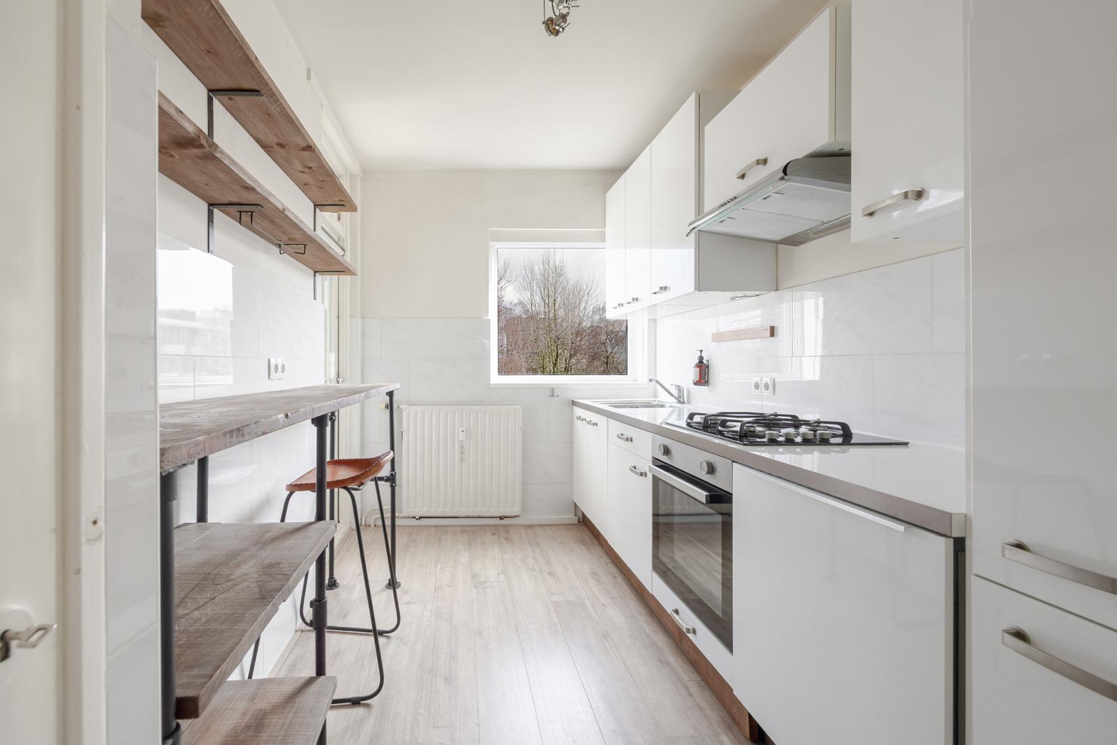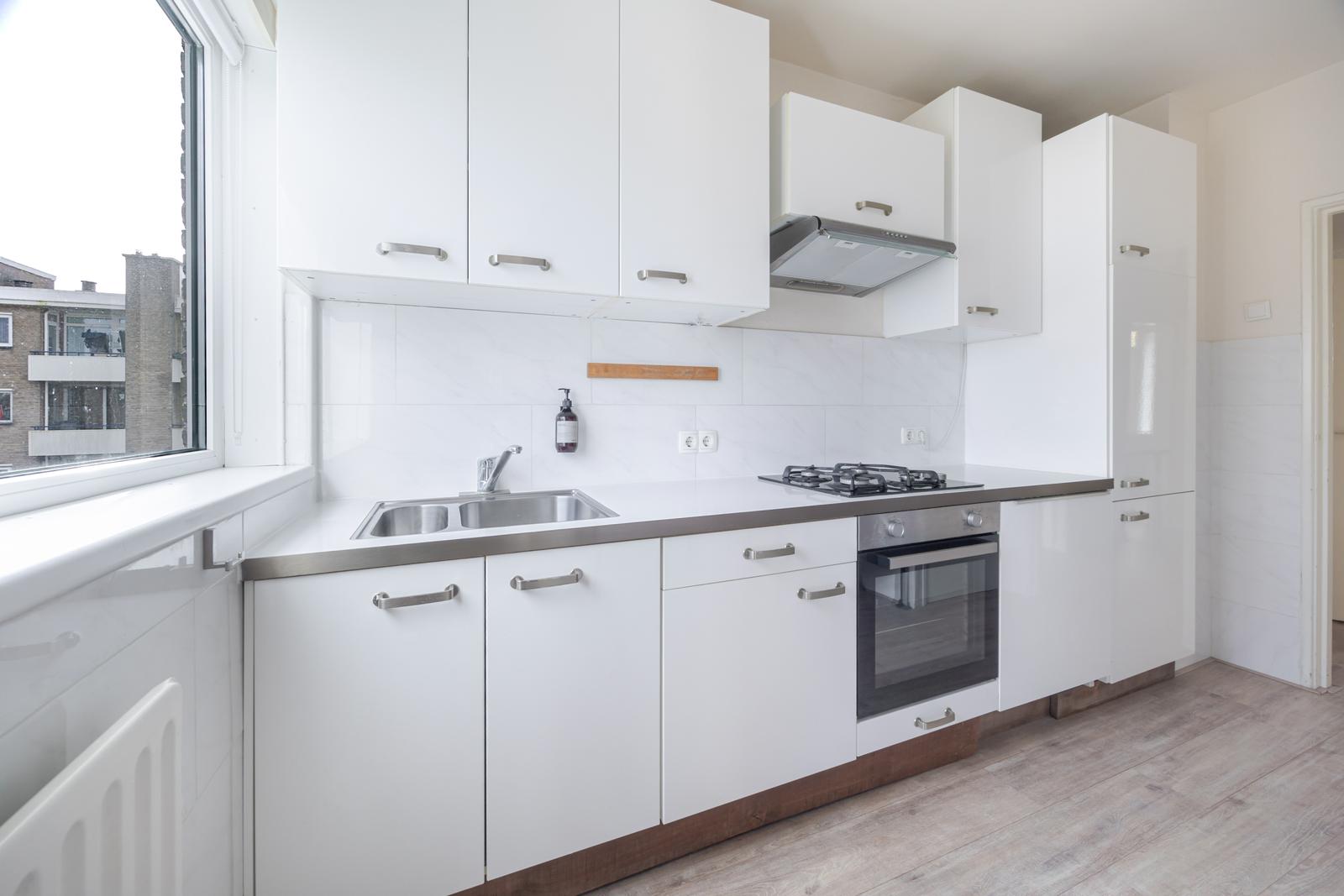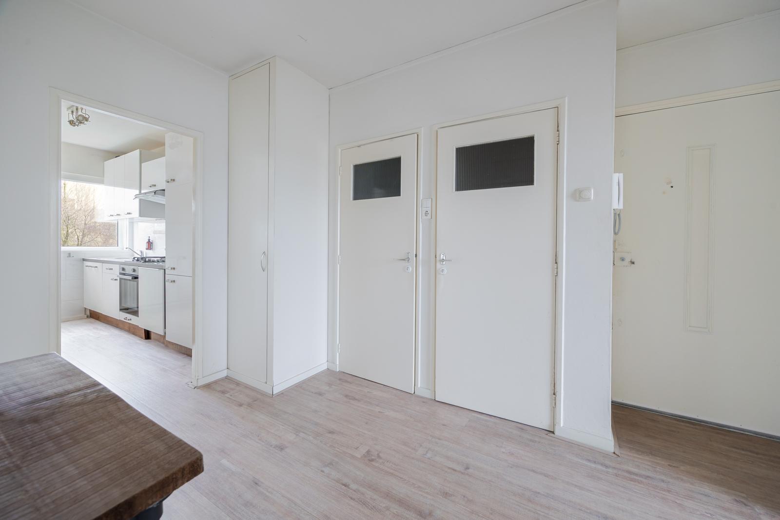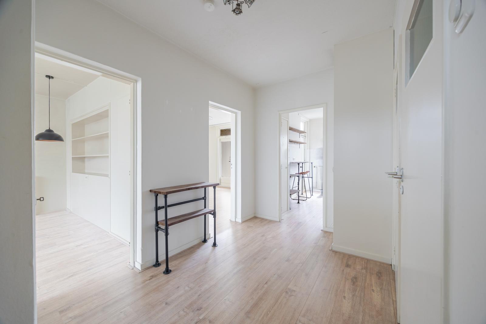 Entree appartement; centrale hal met meterkast, twee vaste kasten, modern separaat toilet en een moderne badkamer met inloopdouche, wastafelmeubel en wasmachine aansluiting; voorzij slaapkamer met vaste kast; royale en lichte woon-/eetkamer aan de voorzijde met leuk vrij uitzicht; achtergelegen ruime tweede slaapkamer met vaste kast; moderne (dichte) keuken aan de achterzijde met composiet werkblad en diverse inbouwapparatuur. Zowel de keuken als de achtergelegen slaapkamer geven toegang tot het zonnige achterbalkon (ZO) met balkonkast.