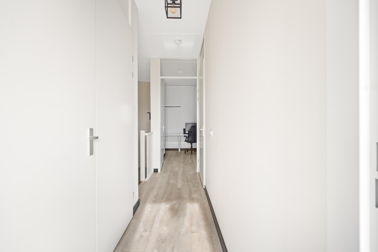 Met de trap bereik je de overloop. Aan de voorzijde bevindt zich de slaapkamer met thuiswerkplek, De nette tussenliggende badkamer is praktisch ingedeeld met een inloopdouche, toilet, wastafel, handdoekradiator en wasmachine aansluiting. Gelegen aan de achterzijde de lichte woonkamer met open keuken voorzien van een inductiekookplaat, vaatwasser, koelkast, vriezer en combi-oven. Vanuit de woonkamer betreed je het zonnige terras gelegen op het zuidoosten. Er is een technische ruimte aanwezig, waar zich onder andere de warmtepomp en ventilatie-unit bevinden. Buiten aan de zijkant van de woning vind je tevens de separate stenen (fietsen) berging voorzien van elektra.