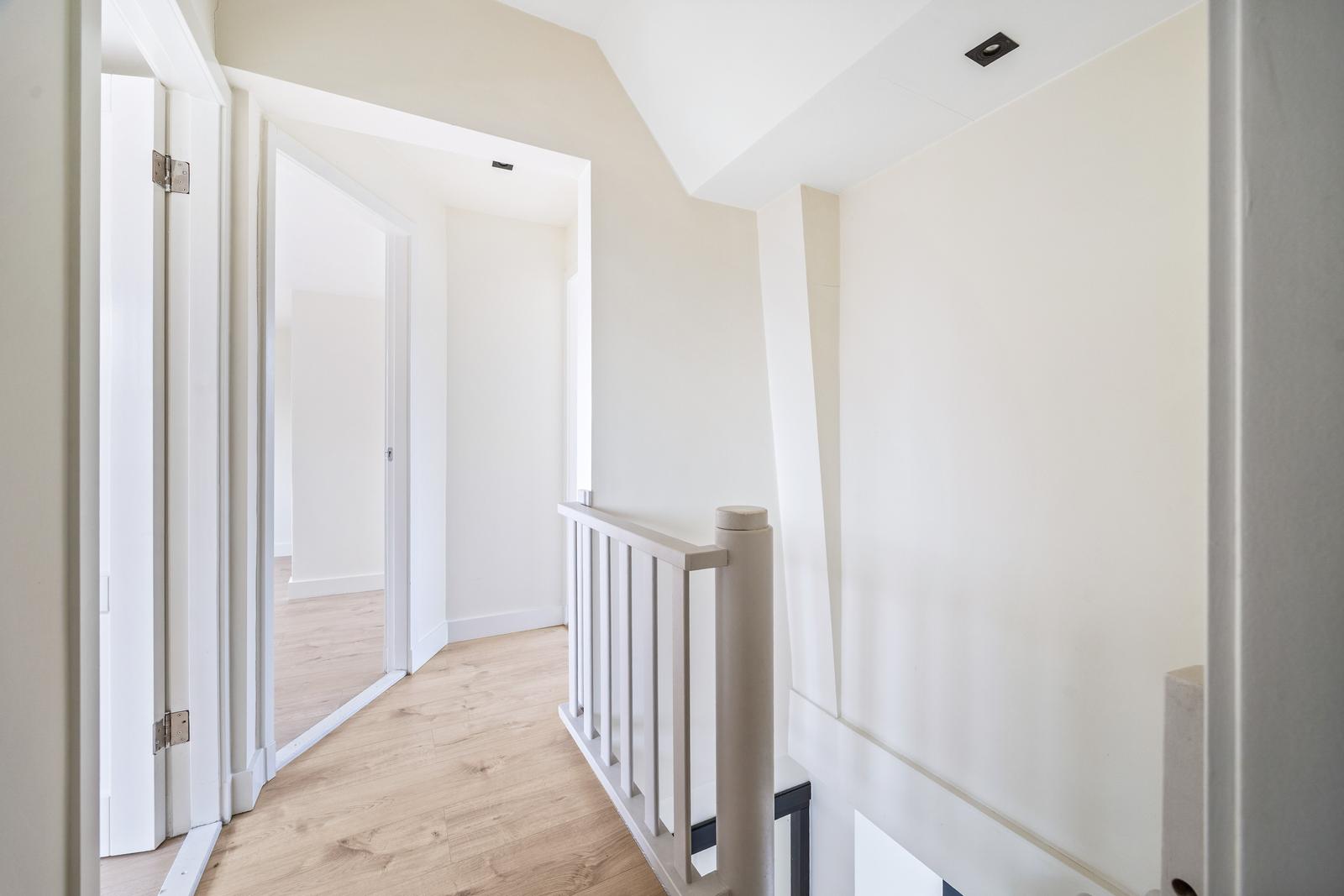 Overloop; twee ruime slaapkamers aan de voorzijde en een slaapkamer aan de achterzijde; moderne badkamer met inloopdouche v.v. hand- en regendouche, ligbad, wastafelmeubel, handdoekradiator en daglichtinval.