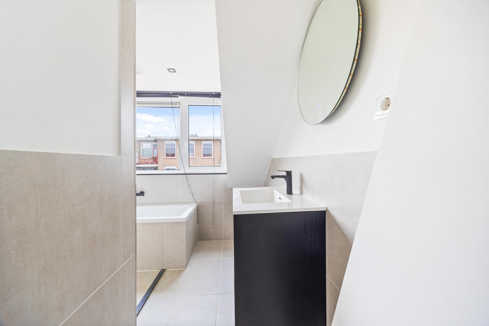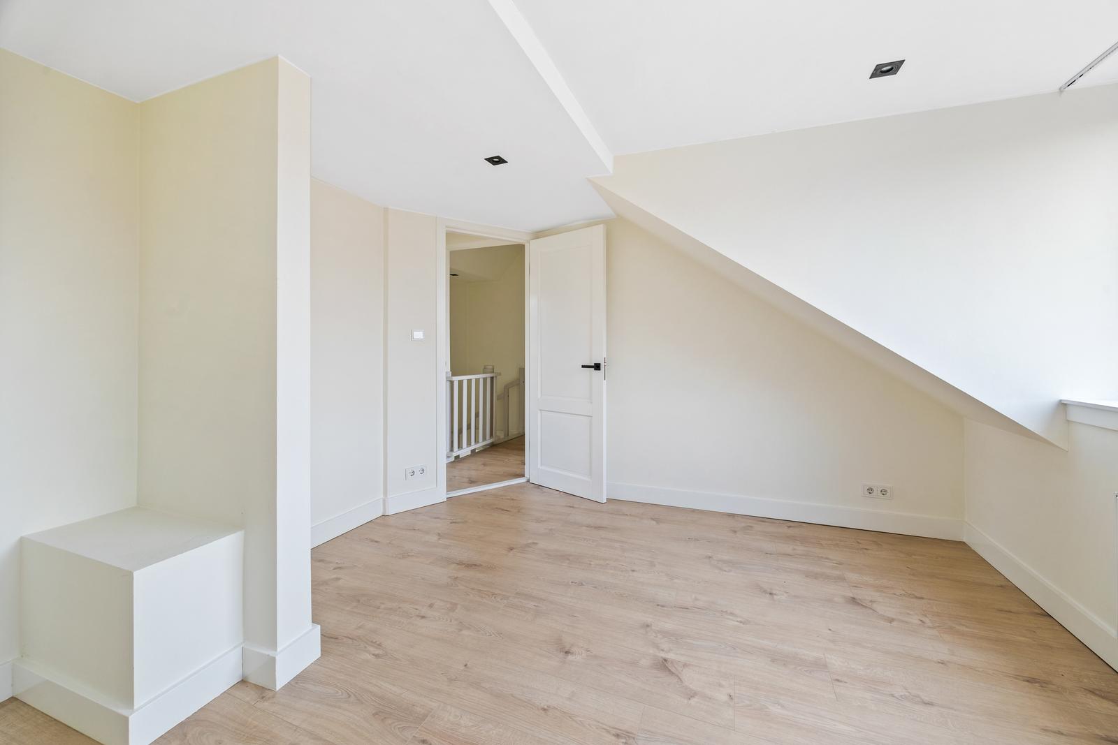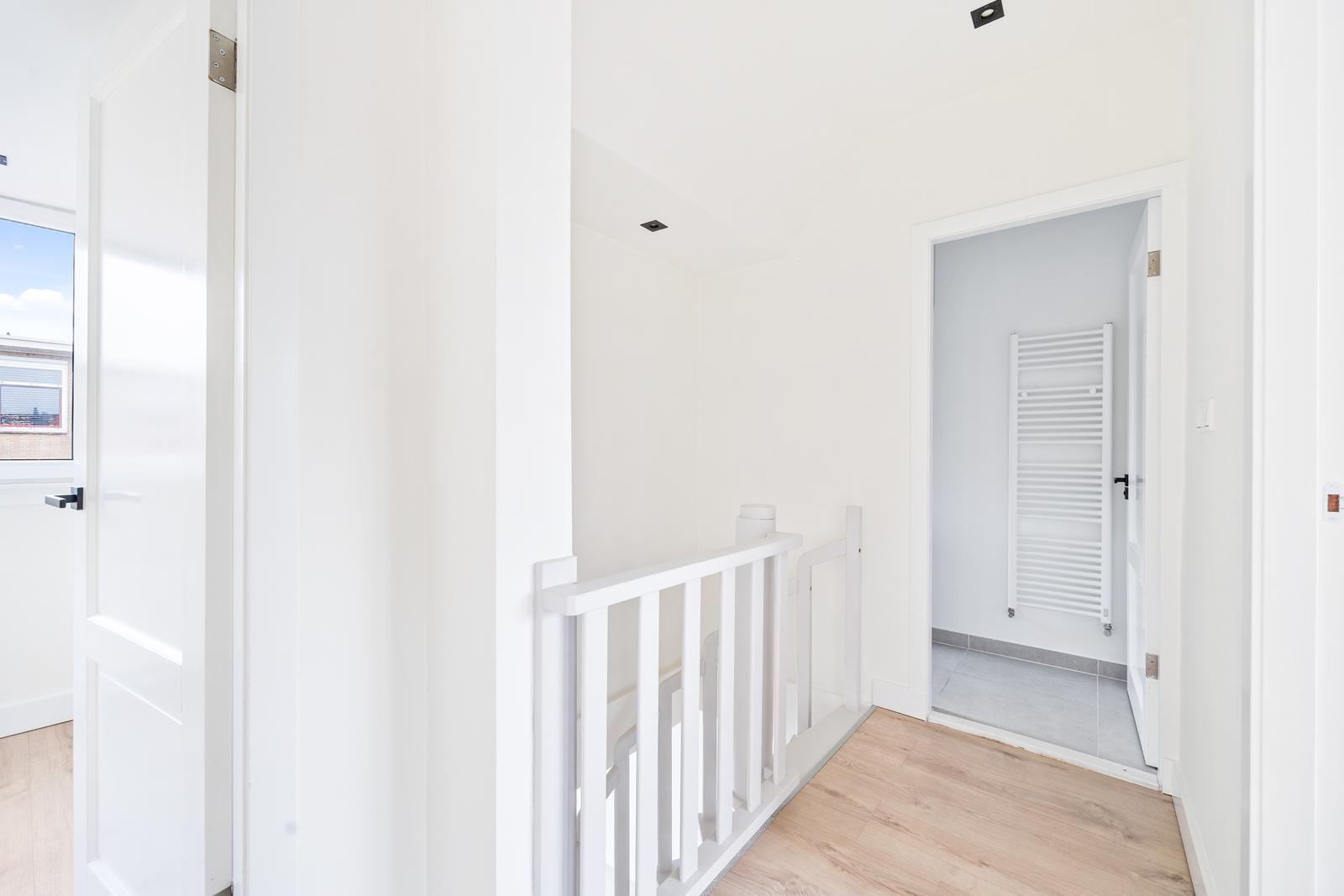 Overloop; twee ruime slaapkamers aan de voorzijde en een slaapkamer aan de achterzijde; moderne badkamer met inloopdouche v.v. hand- en regendouche, ligbad, wastafelmeubel, handdoekradiator en daglichtinval.