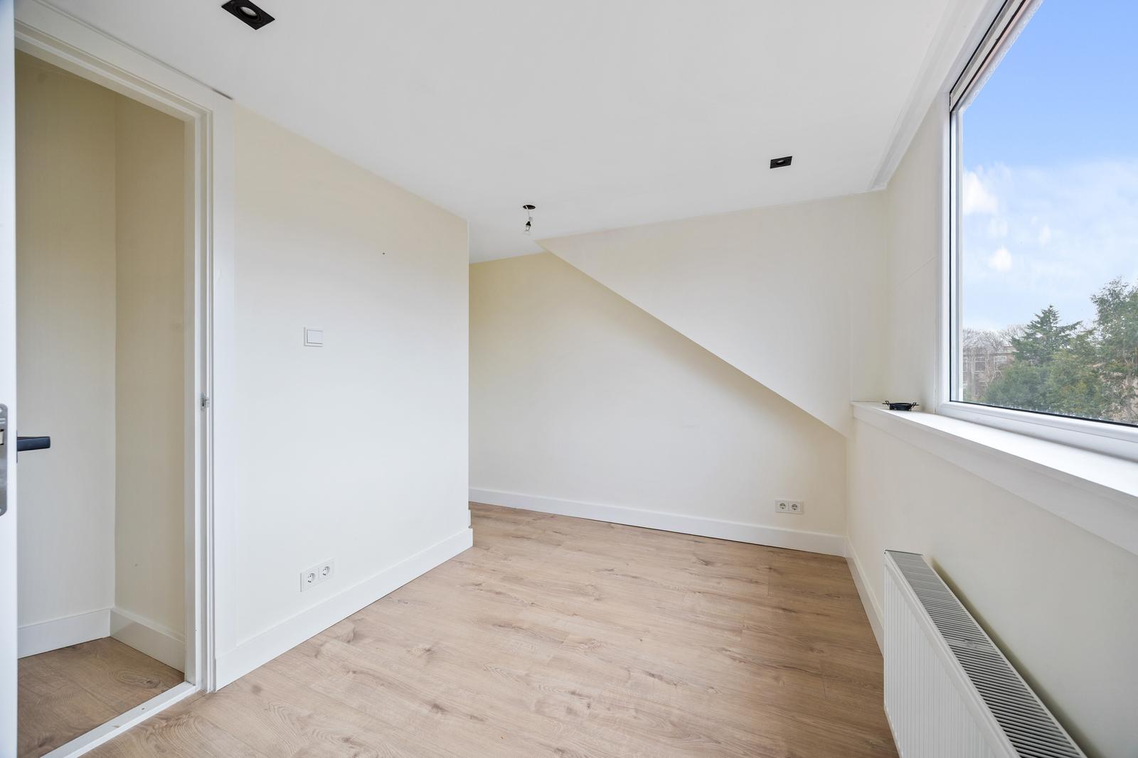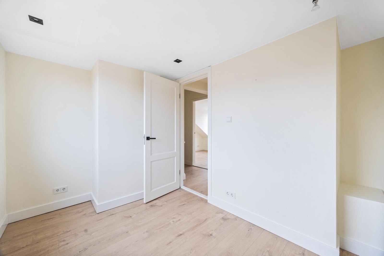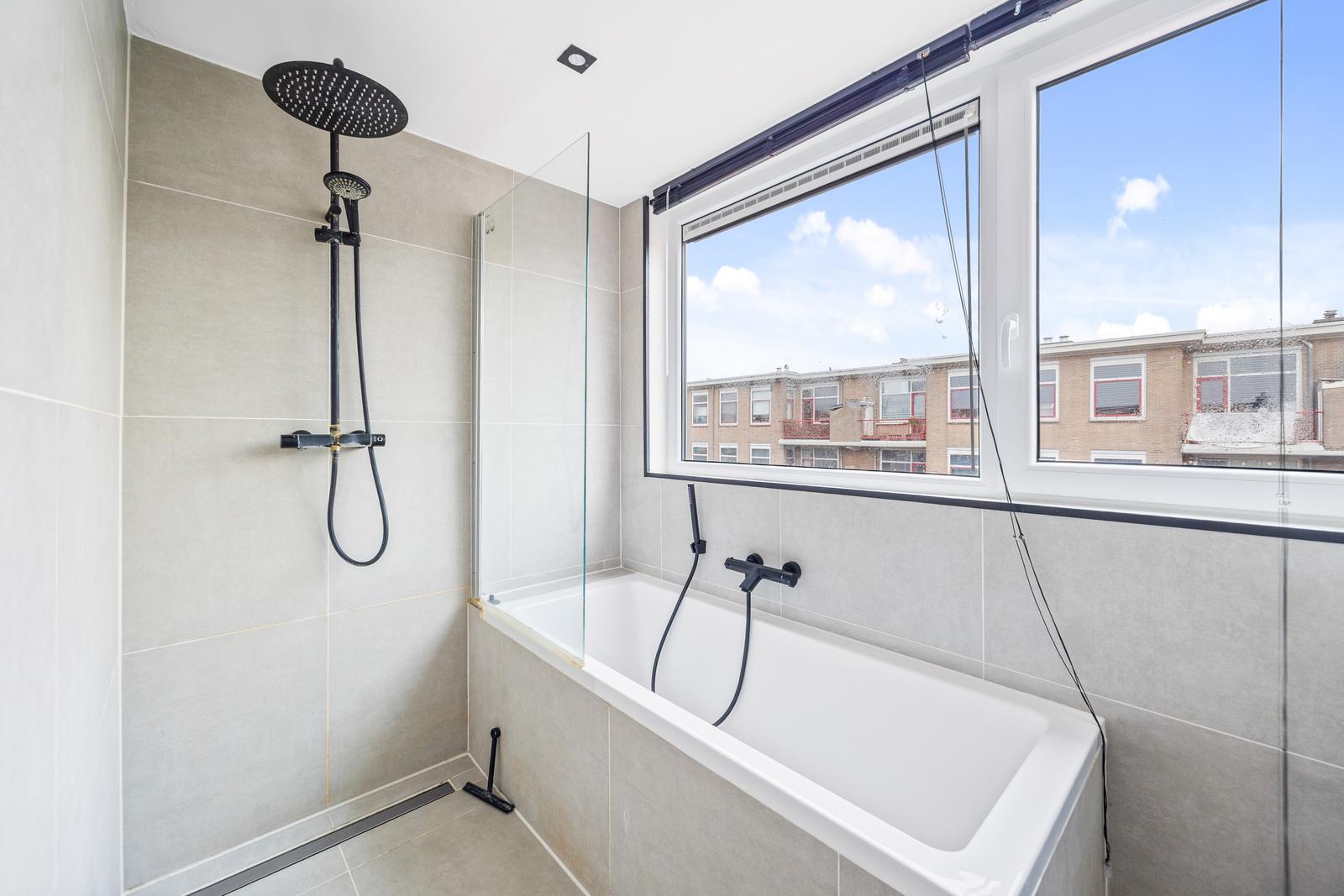 Overloop; twee ruime slaapkamers aan de voorzijde en een slaapkamer aan de achterzijde; moderne badkamer met inloopdouche v.v. hand- en regendouche, ligbad, wastafelmeubel, handdoekradiator en daglichtinval.