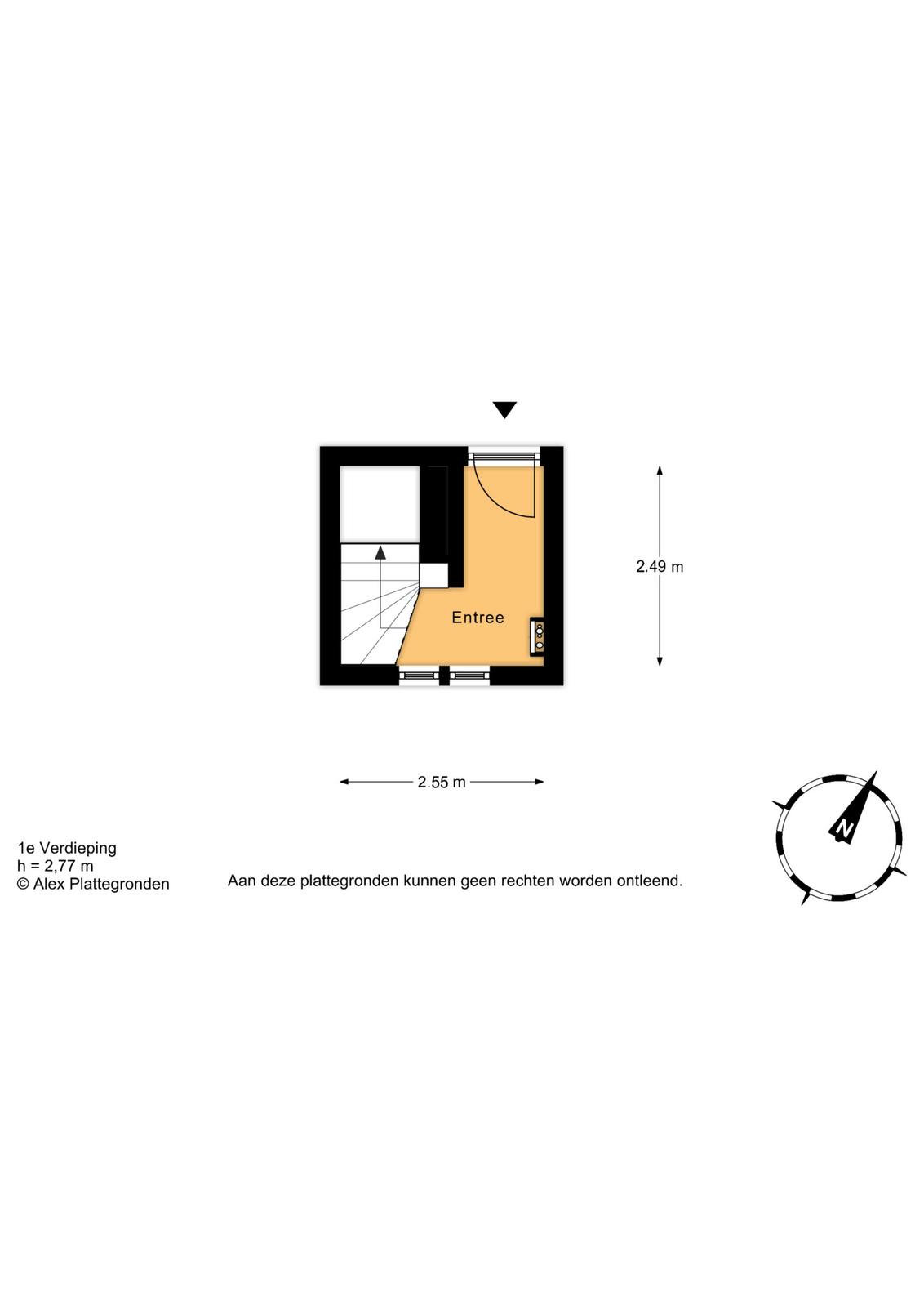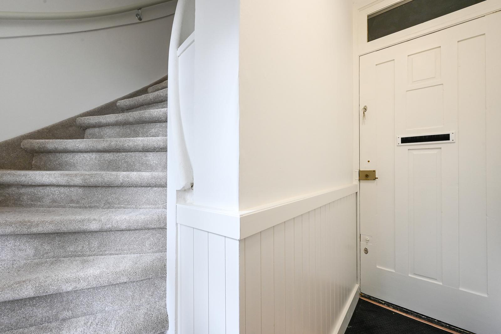 Open portiek; entree woning op de eerste verdieping; hal met meterkast en binnentrap naar de tweede verdieping.