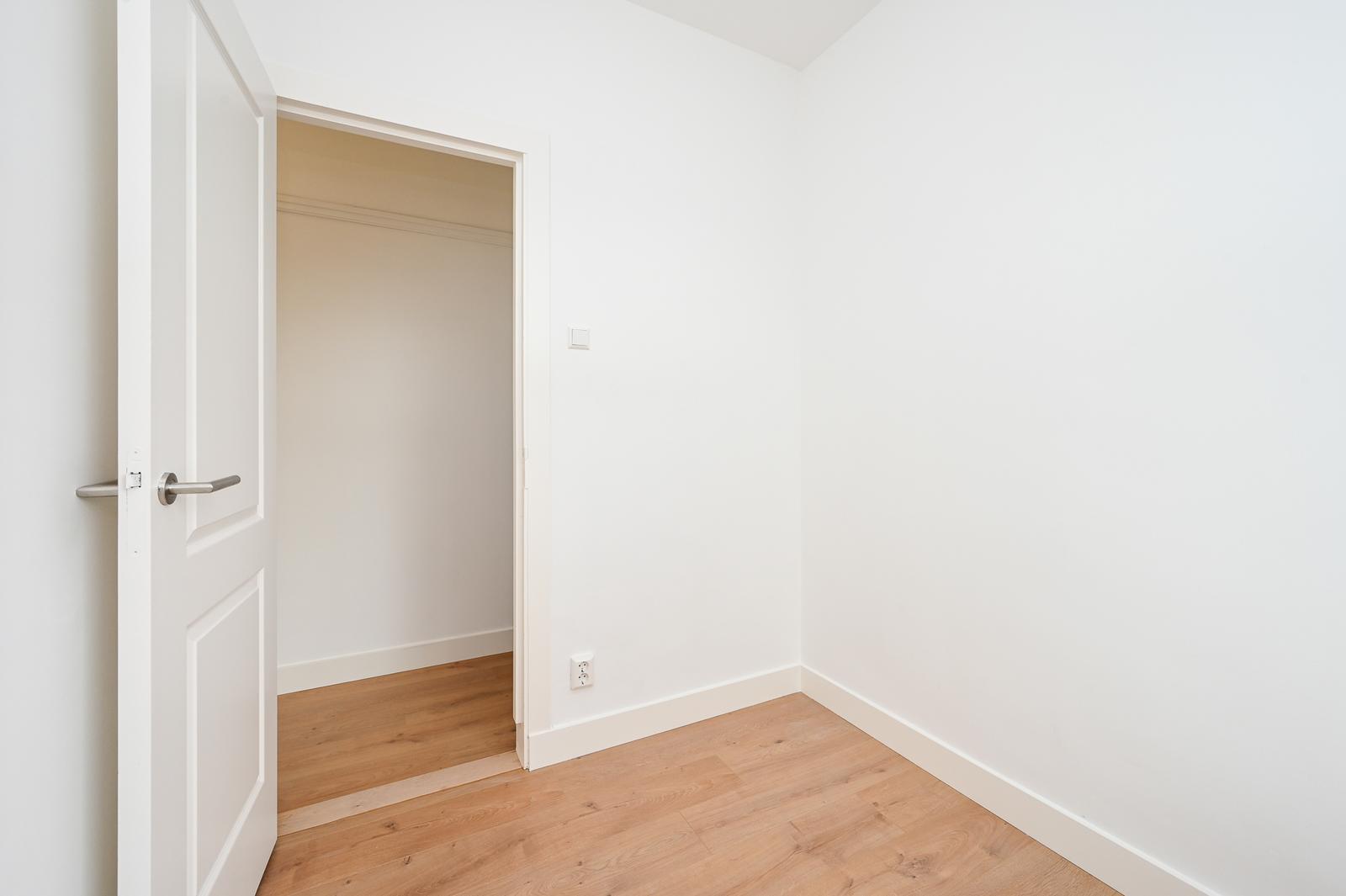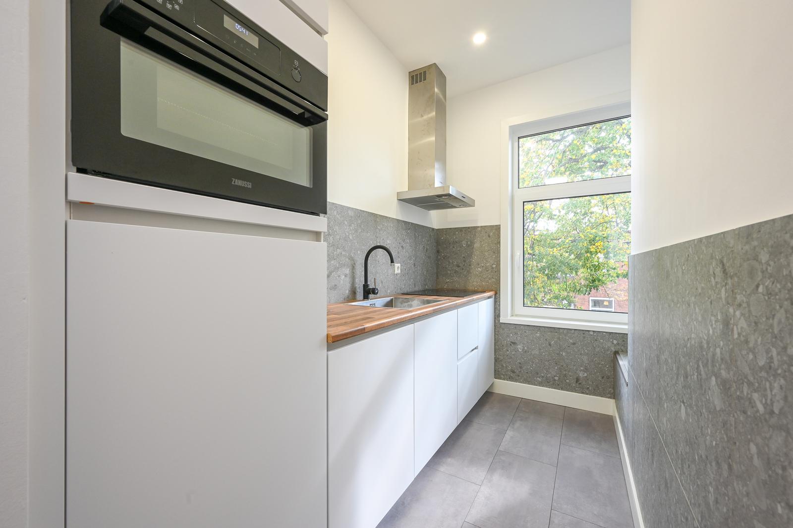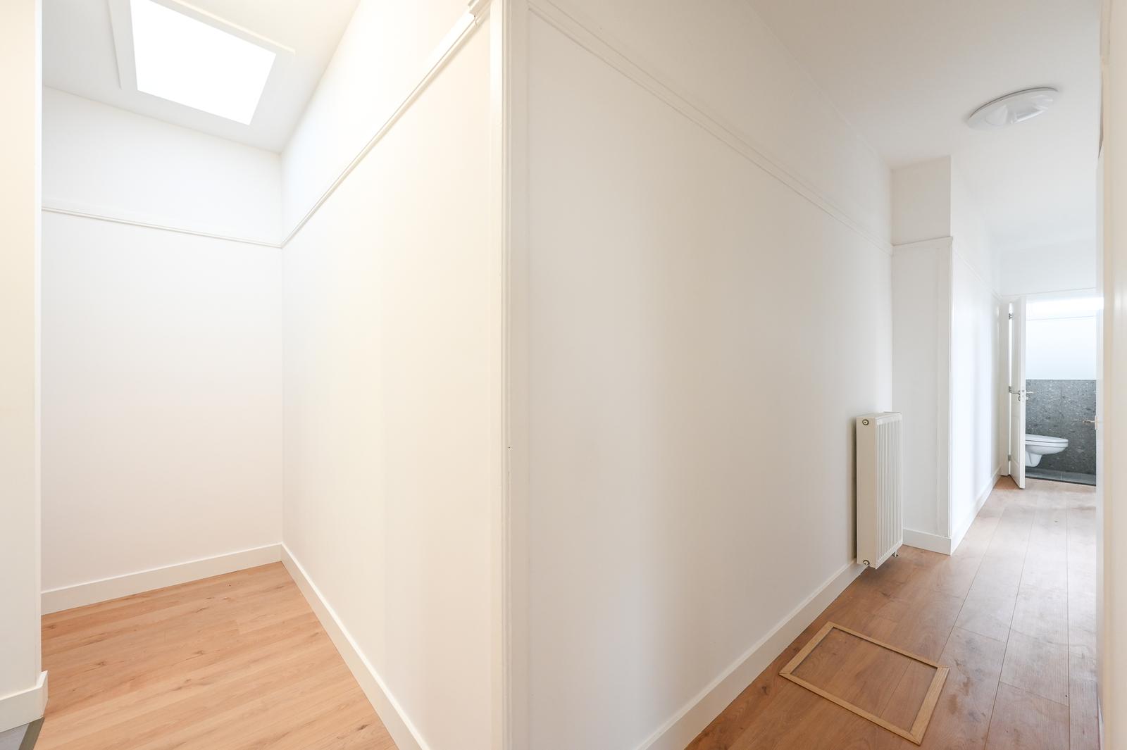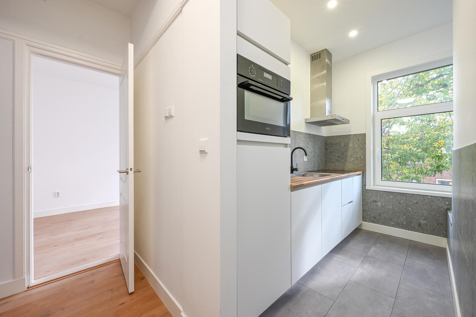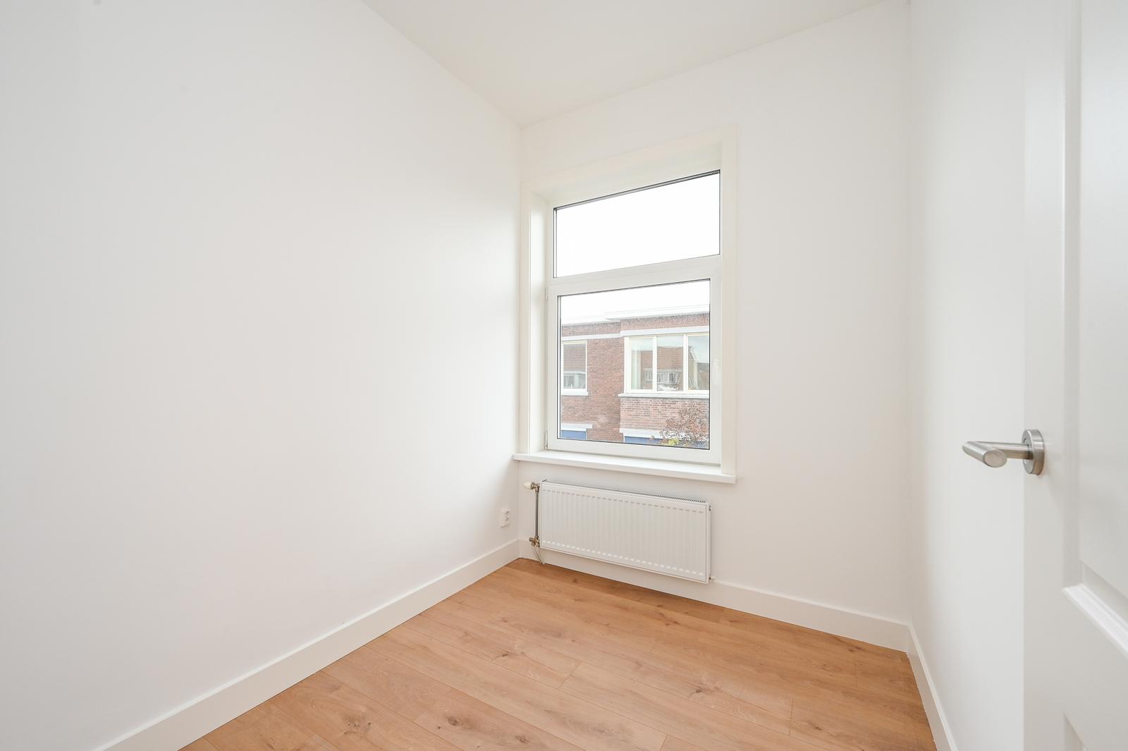 Overloop met vaste kast en modern separaat toilet; moderne keuken aan de voorzijde met een mat witte kleurstelling en diverse inbouwapparatuur; zeer lichte (hoekgelegen) woon-/eetkamer met leuk uitzicht door de straat; ruime tussengelegen slaapkamer en een tweede tussengelegen slaapkamer van kleiner formaat; moderne badkamer aan de achterzijde met inloopdouche, wastafelmeubel, handdoekradiator, wasmachine aansluiting, opstelplaats CV-ketel en deur naar het zonnige achterbalkon (NW) met balkonkast.