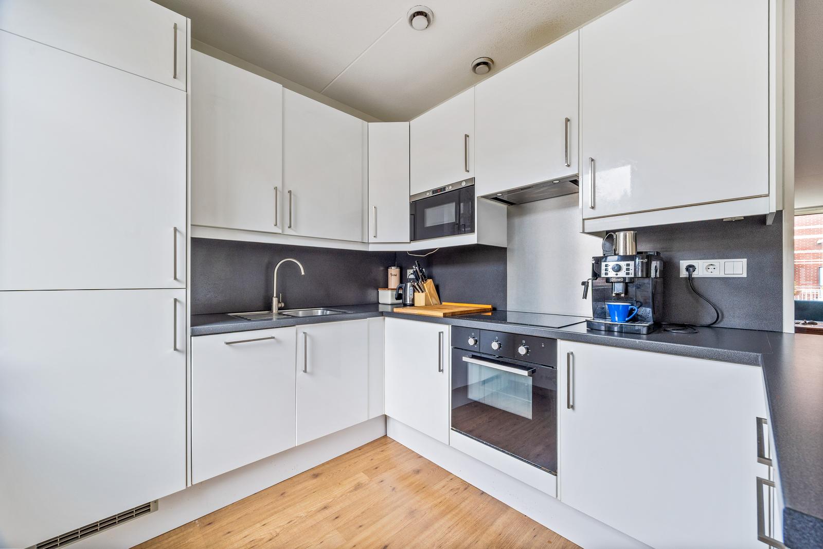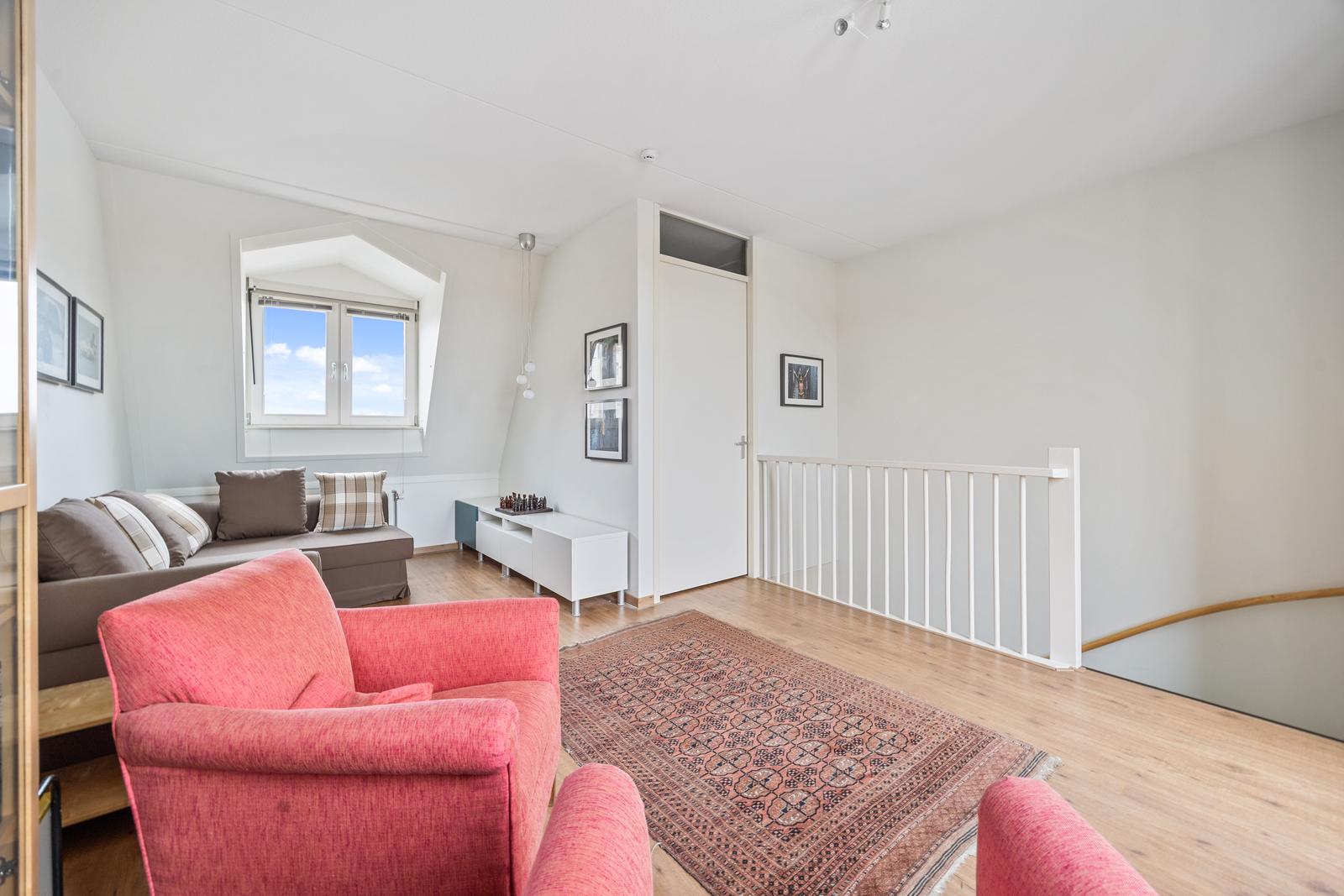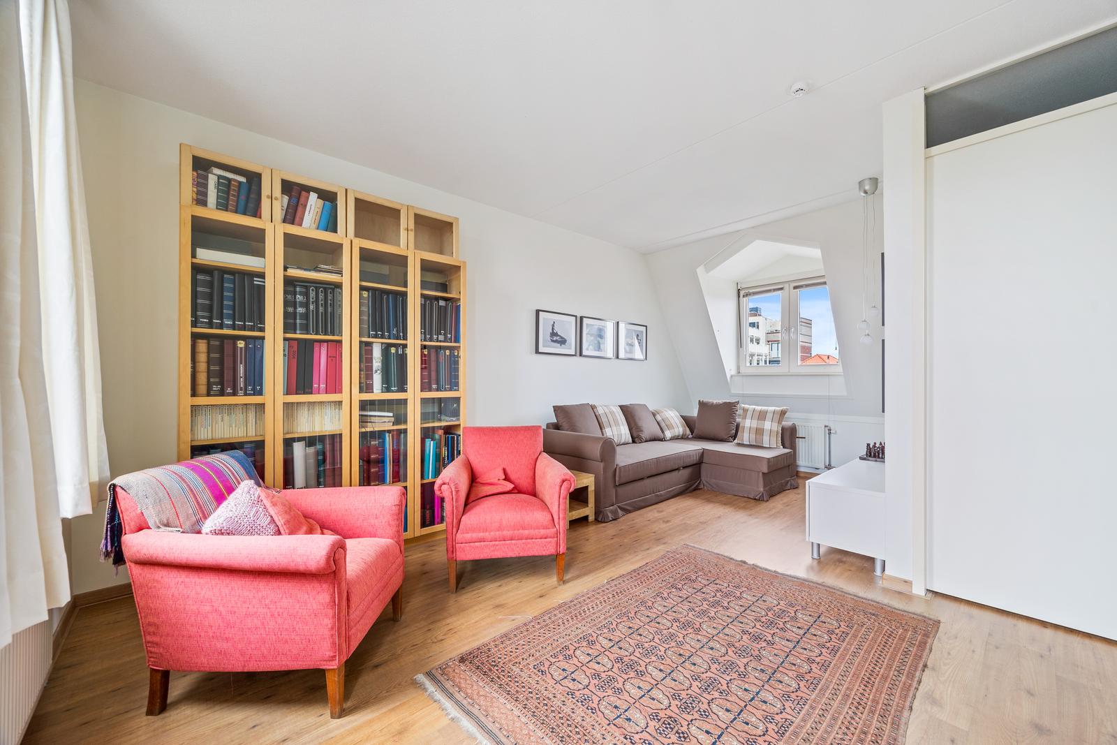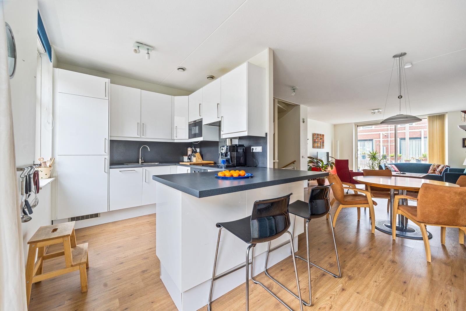 Royale en lichte living over de volle verdieping met moderne U-vormige open keuken aan de voorzijde voorzien van diverse inbouwapparatuur, een gezellige ontbijtbar en een Frans balkon. Aan de achterzijde bevindt zich het zitgedeelte met schuifpui naar het zonnige terras op het noordwesten met middag- en avondzon.