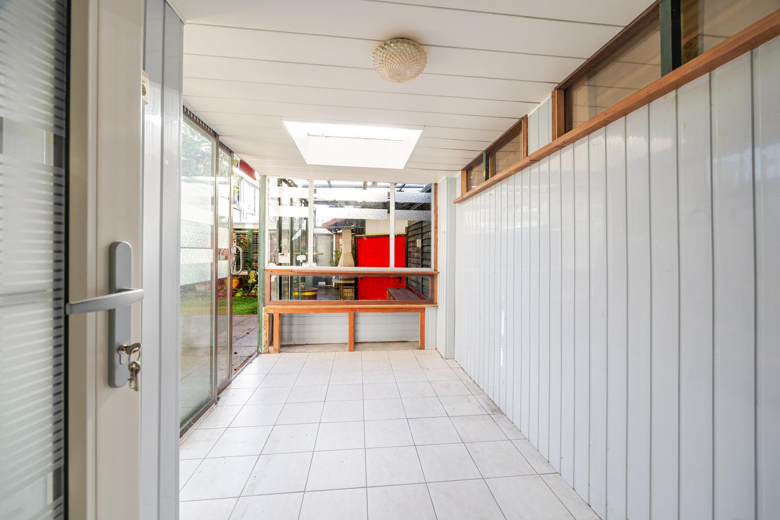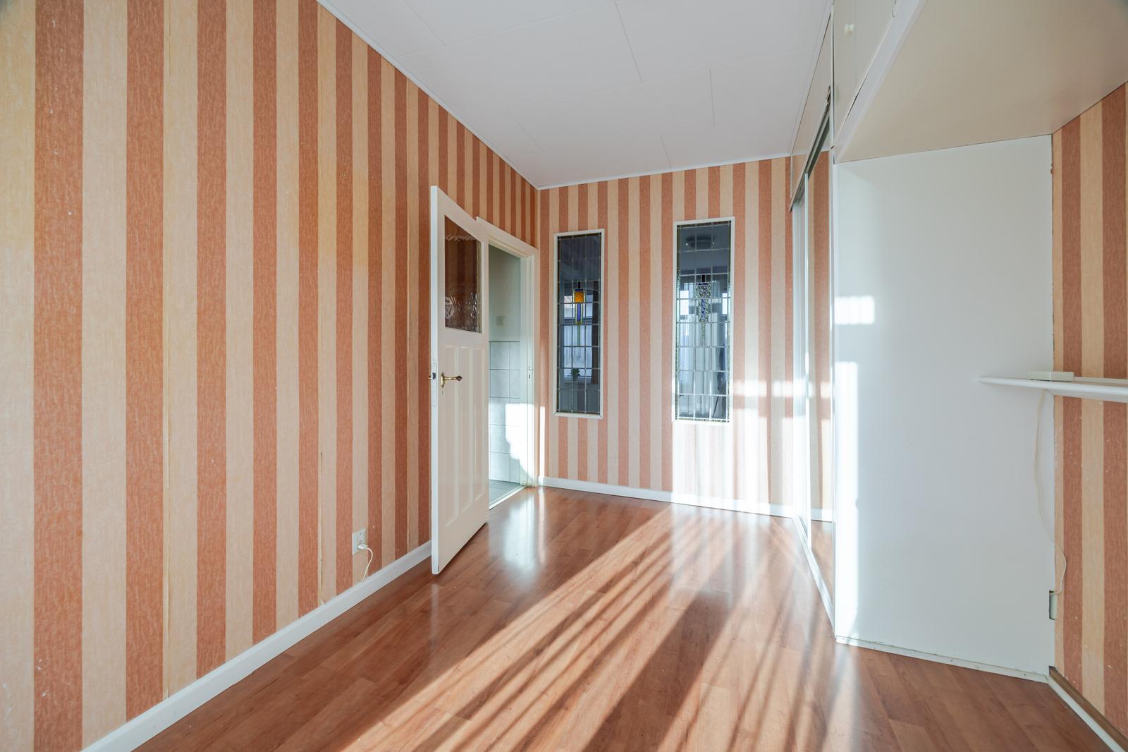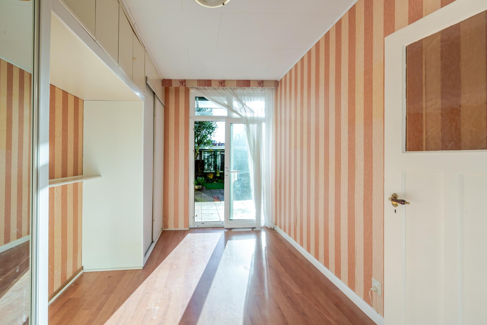 Entree via gezamenlijk portiek. Hal met meterkast, vaste kast en separaat toilet. Gezellige L-vormige woon-/eetkamer over de gehele breedte aan de voorzijde. Aan de achterzijde liggen de slaapkamer met ingebouwde kastruimte, de gesloten keuken en de badkamer met douchecabine, wastafel en wasmachine aansluiting. Aansluitend aan de badkamer bevindt zich de uitbouw met schuifpui. Vanuit de slaapkamer, keuken en uitbouw is er toegang tot de zonnige en verrassend diepe achtertuin op het zuidoosten (circa 12,5 meter diep) met een stenen berging.