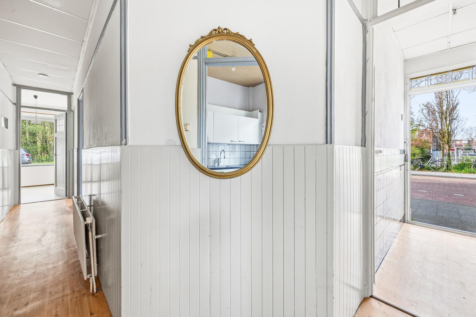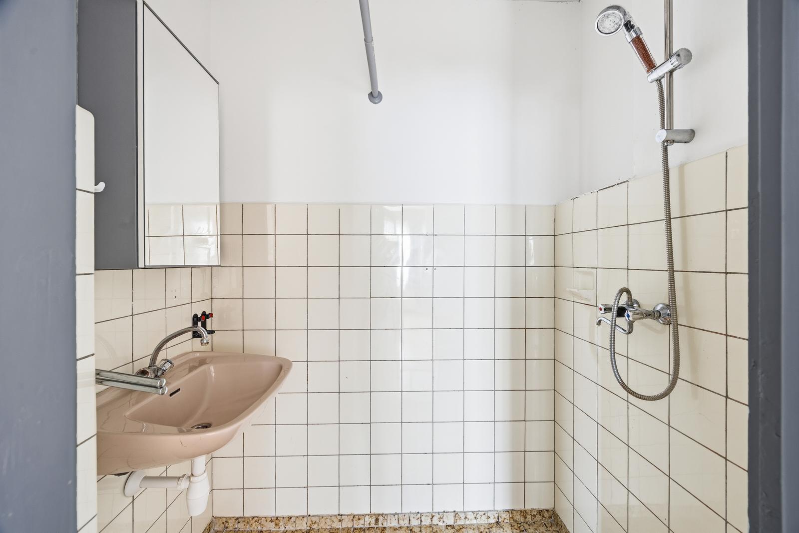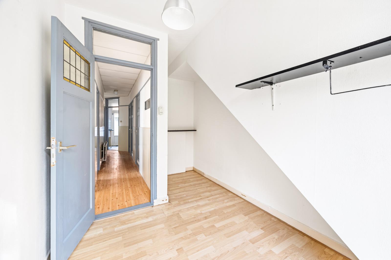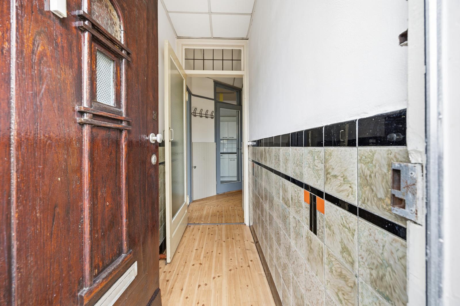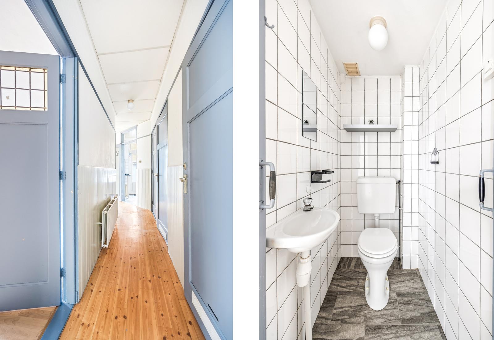 Zij-entree met tochtportaal en toegang tot de hal. Hal met separaat toilet met fonteintje en vaste kast met meterkast en wasmachineaansluiting. Badkamer met douche en wastafel.
