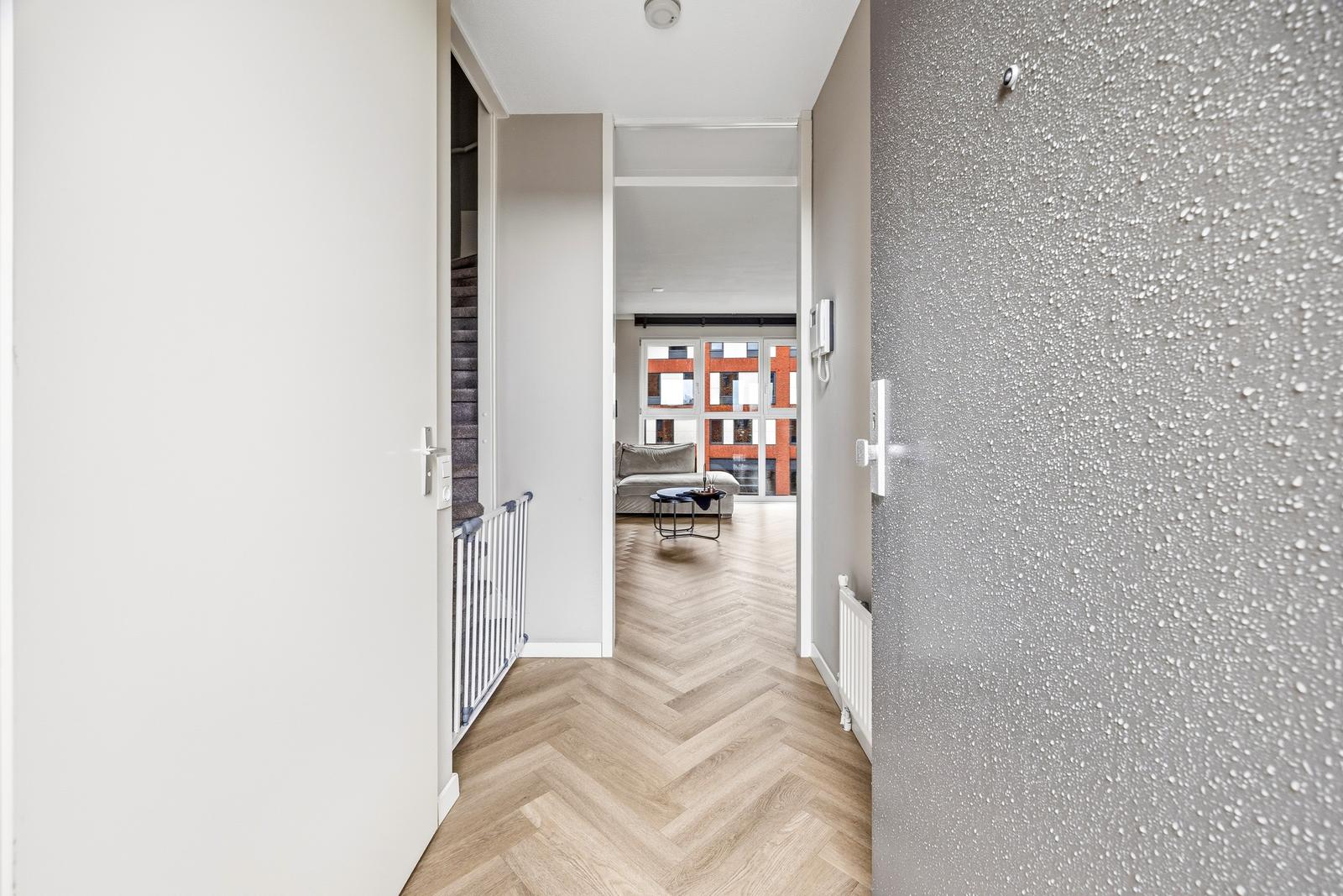 Gesloten portiek met bellen-en brievenbussentableau; trap/lift naar de tweede verdieping;