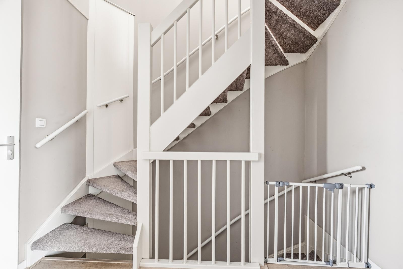 Overloop met trapopgang en vaste kast met wasmachine/droger opstelling.