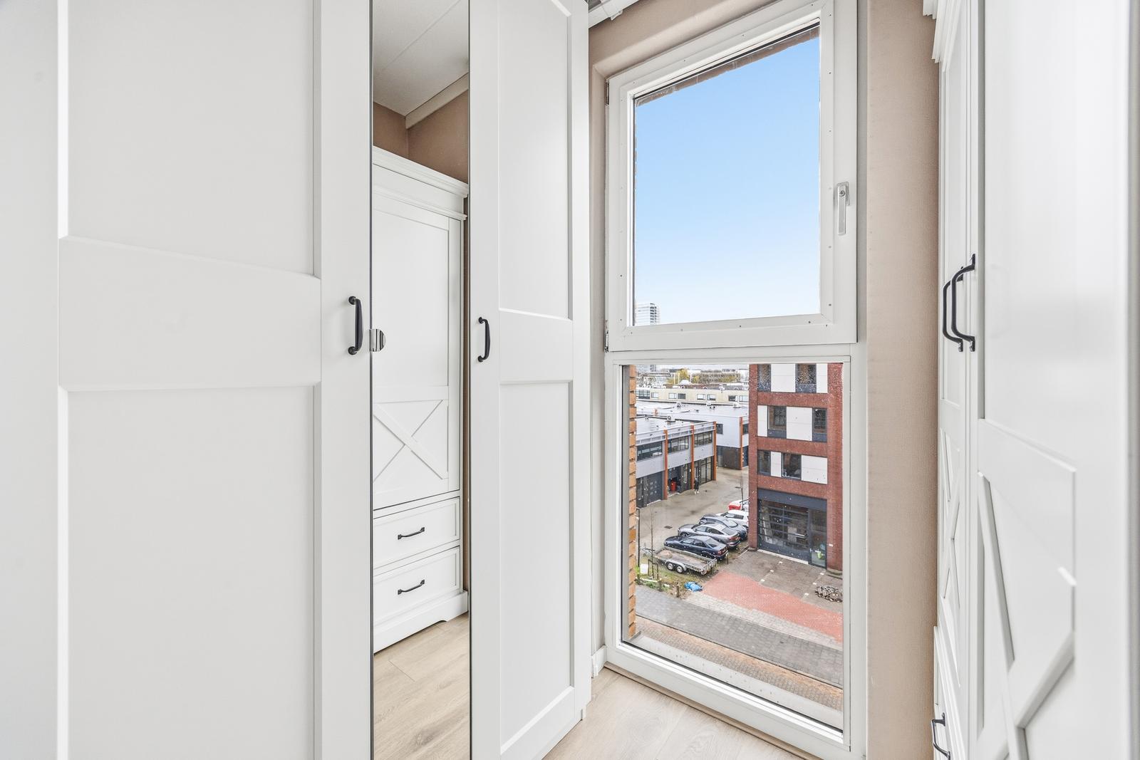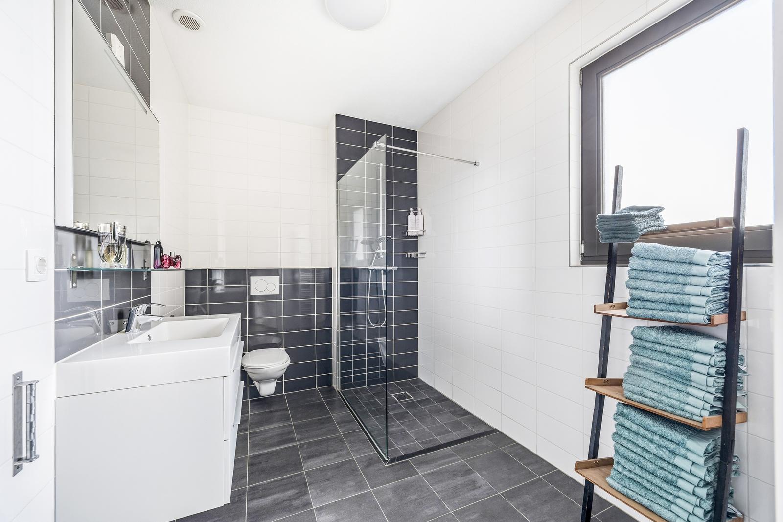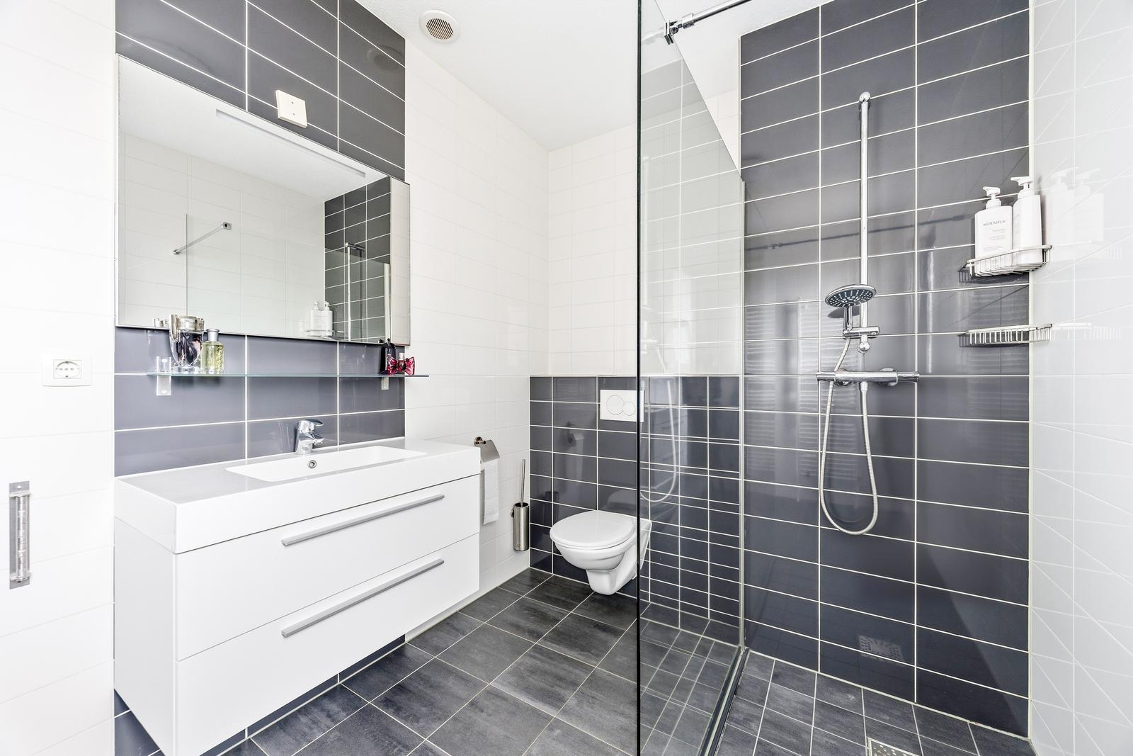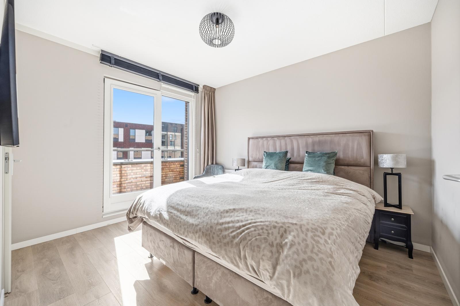 Royale slaapkamer met fraaie inloopkast en toegang tot het achtergelegen zonnige balkon (ZO) over de volle breedte. Moderne badkamer aan de voorzijde met inloopdouche, wastafelmeubel, design radiator en hangend toilet.