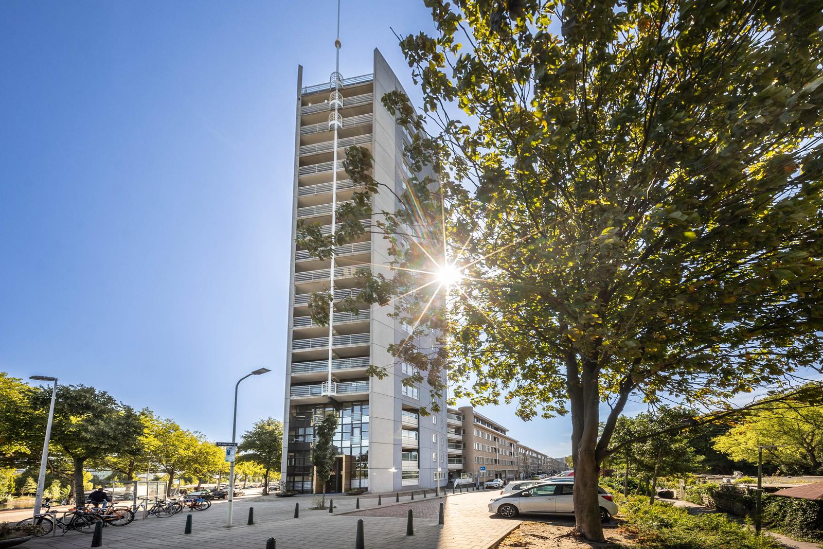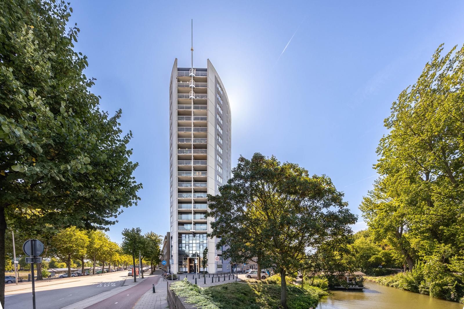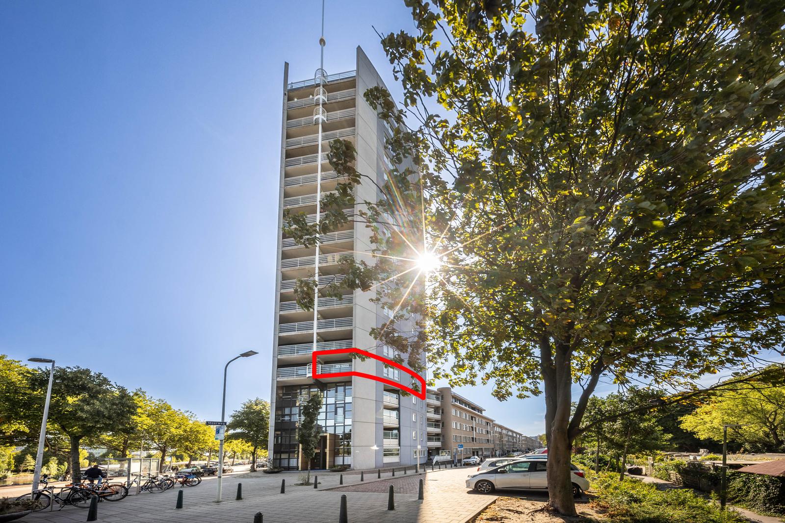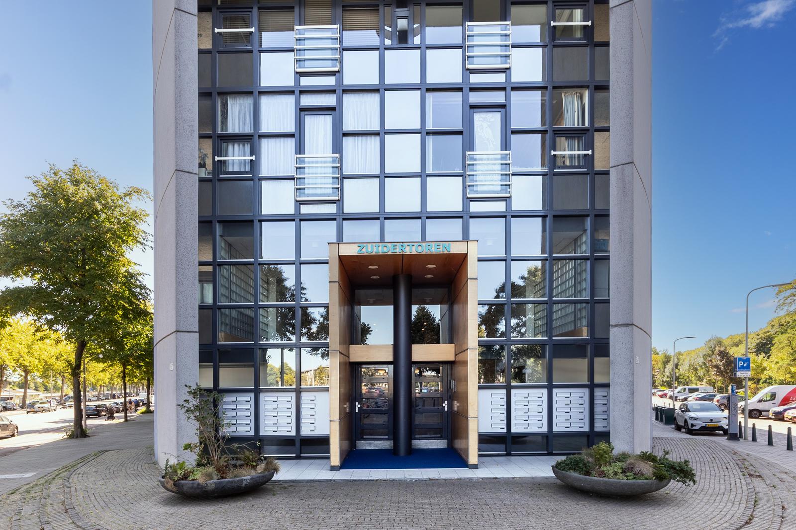 Luxe, royaal, licht en zonnig 3 kamer appartement (107m²) in het luxe appartementencomplex "De Zuidertoren" met schitterend uitzicht over de skyline van Den Haag, een ruim terras (N/W) en een berging in de onderbouw.