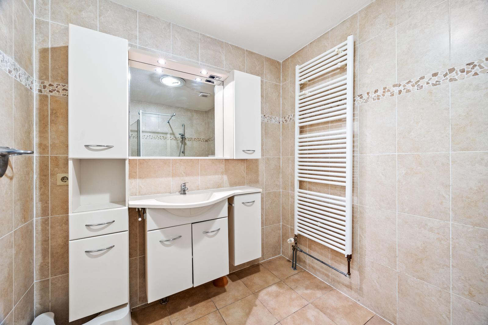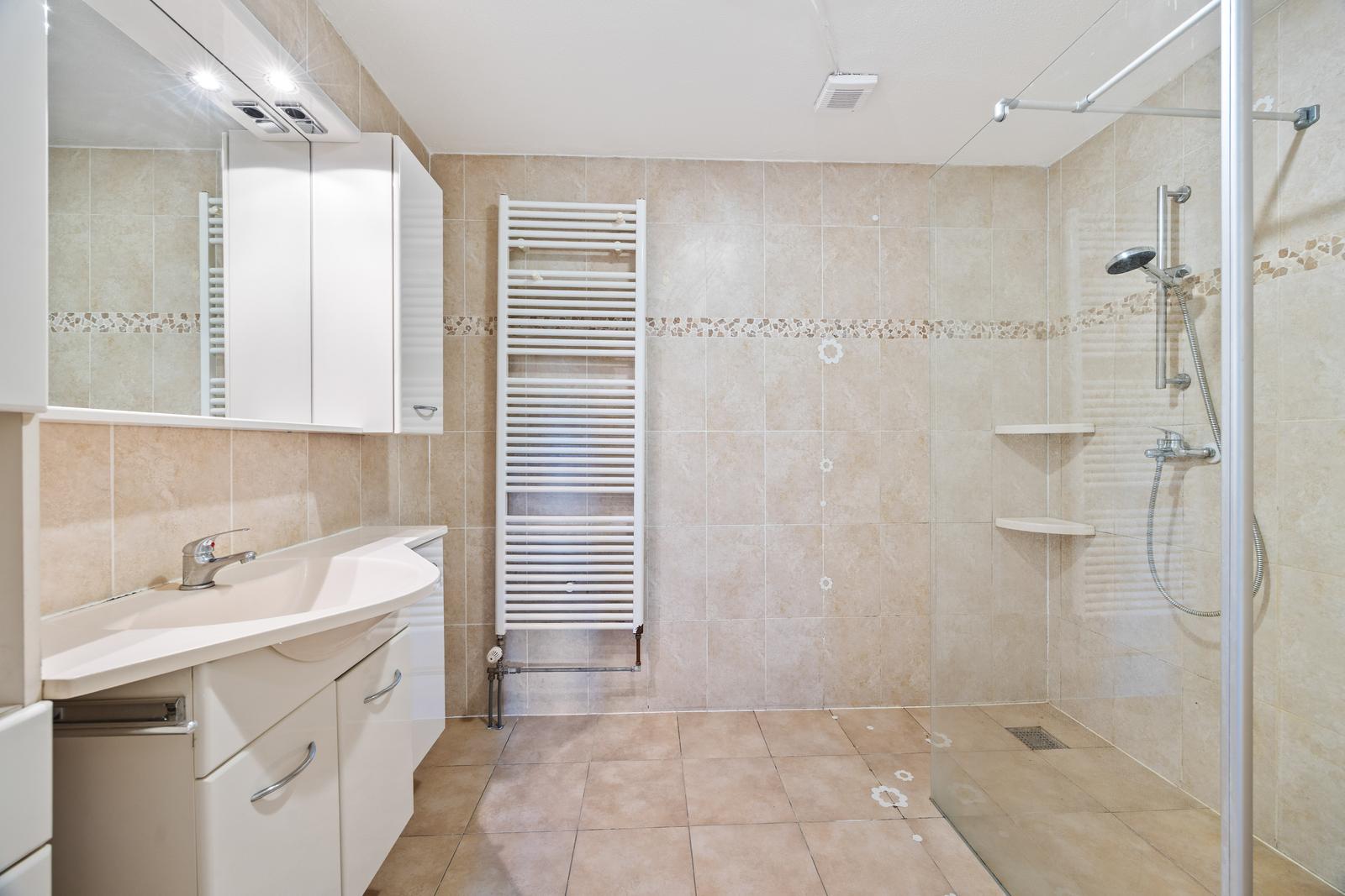 Badkamer met inloopdouche, wastafelmeubel en handdoekradiator.